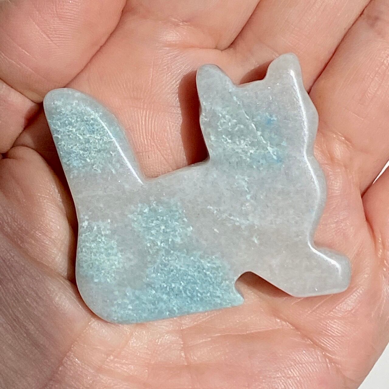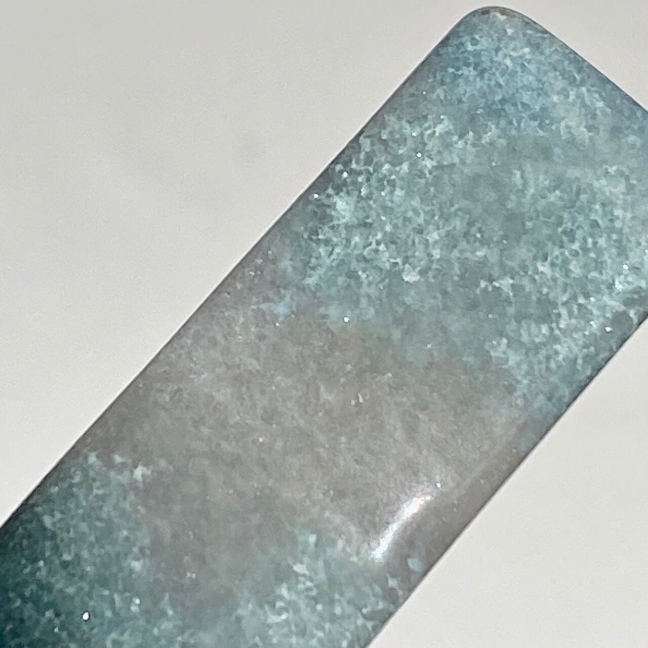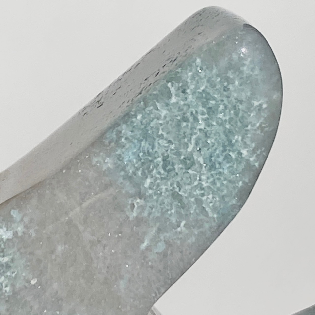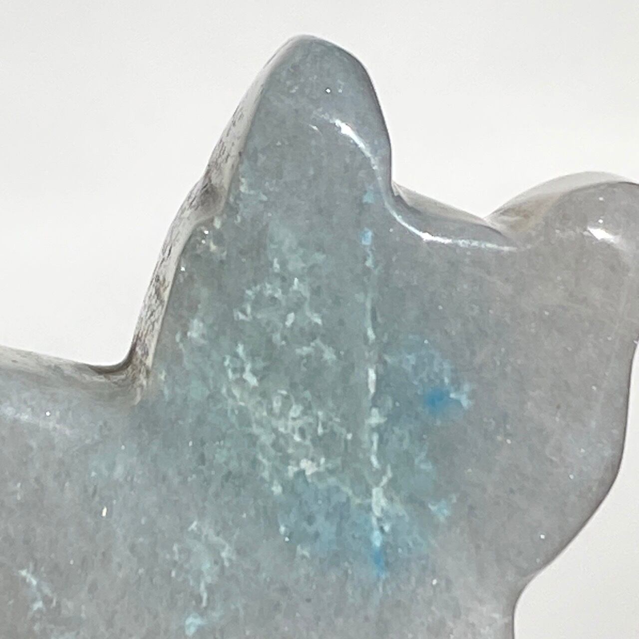 両面とも葛餅のような色味のベースに淡いベイビーブルーとホワイトのホワイトの斑らのパッチが入った癒し系の子です。ハートに優しい色味です。