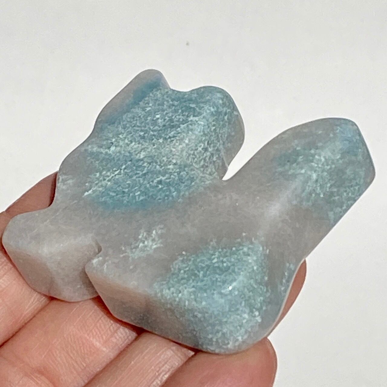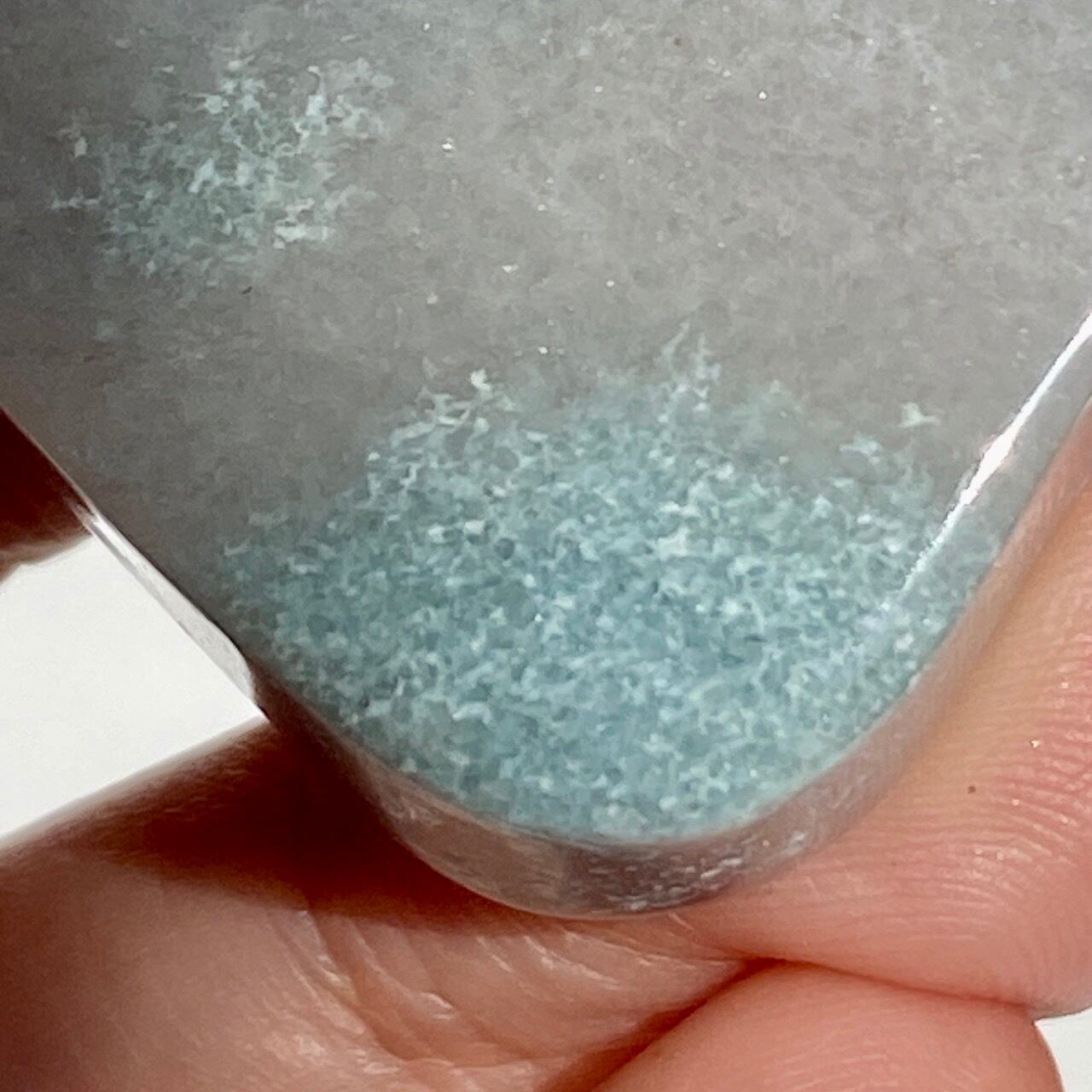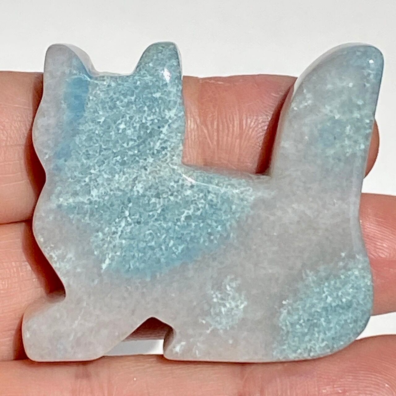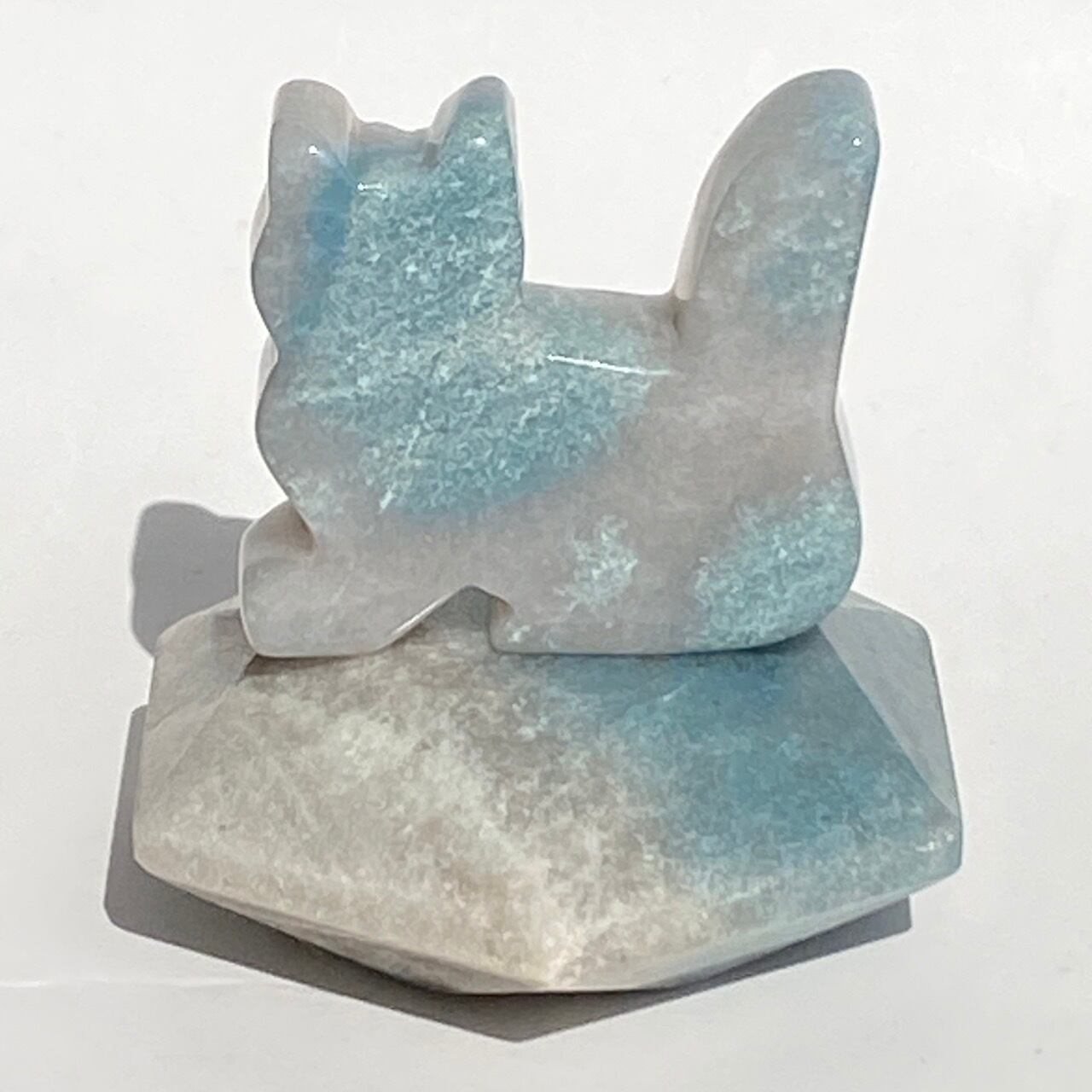 両面とも葛餅のような色味のベースに淡いベイビーブルーとホワイトのホワイトの斑らのパッチが入った癒し系の子です。ハートに優しい色味です。