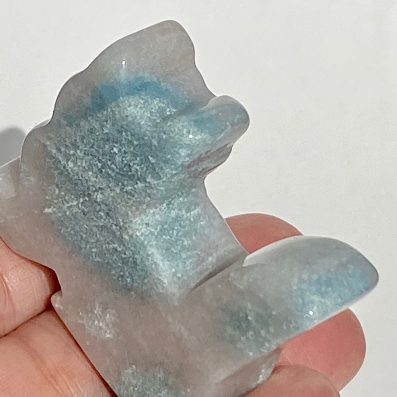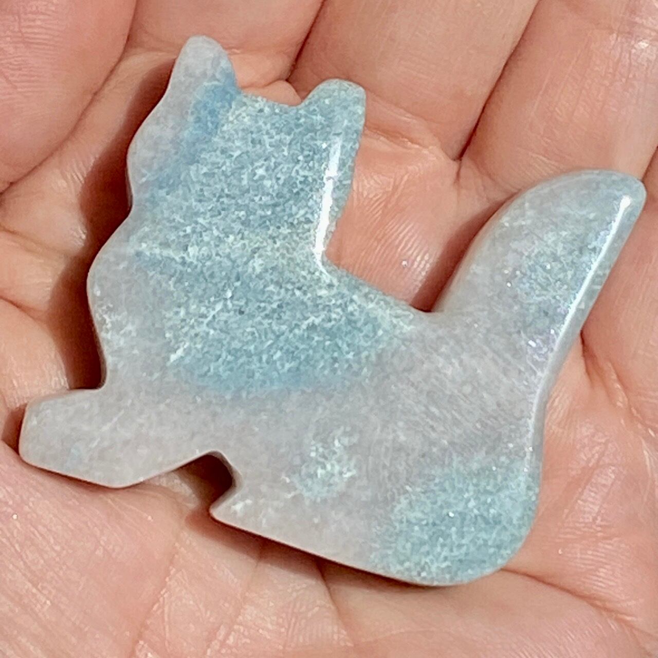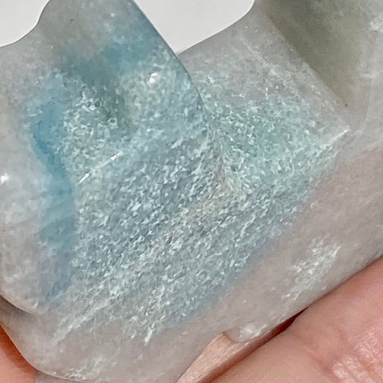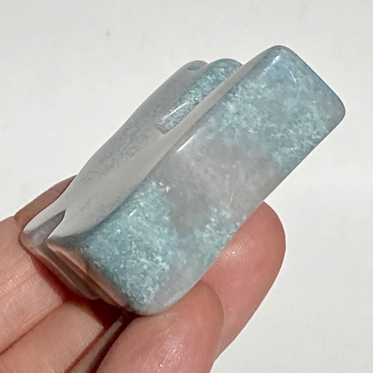 両面とも葛餅のような色味のベースに淡いベイビーブルーとホワイトのホワイトの斑らのパッチが入った癒し系の子です。ハートに優しい色味です。