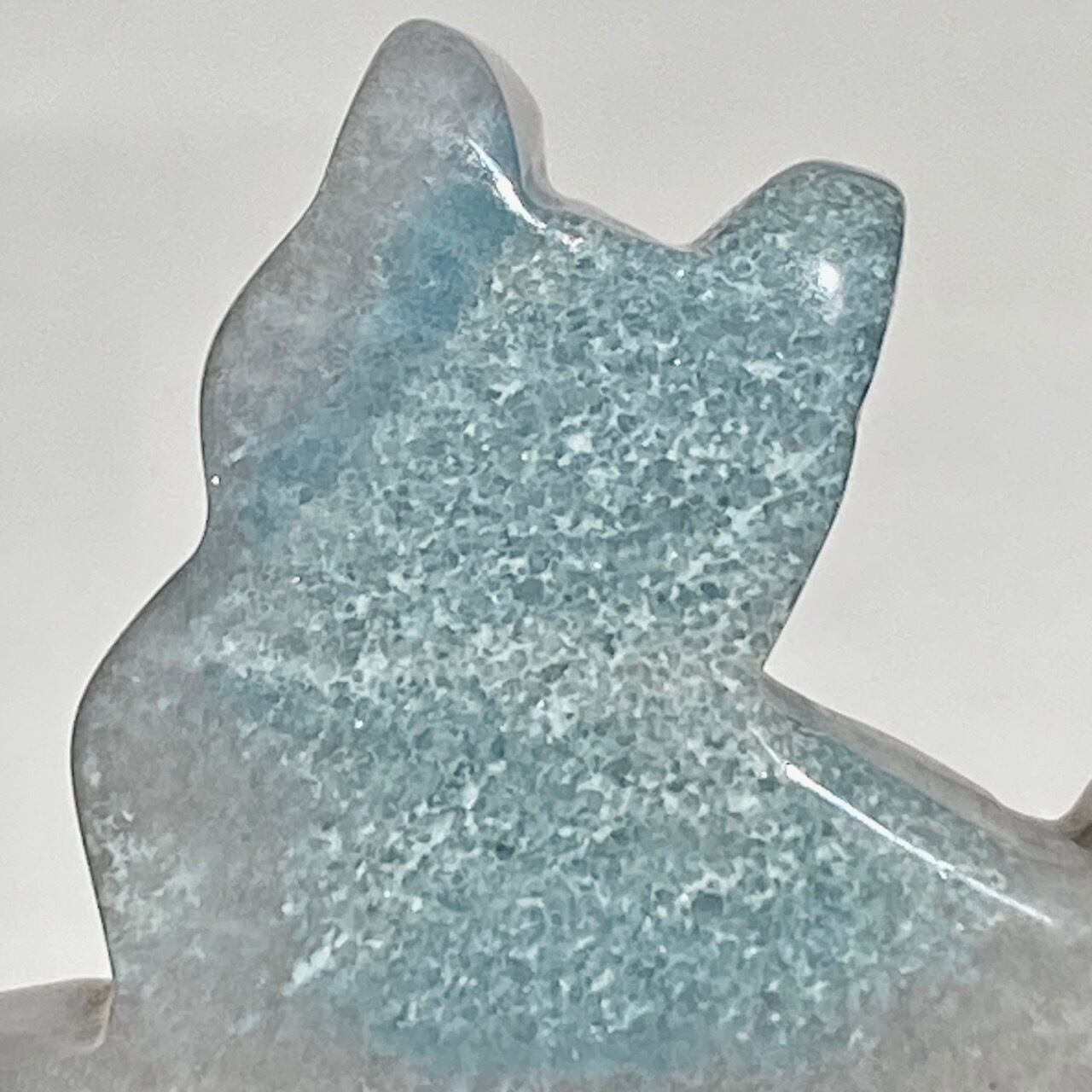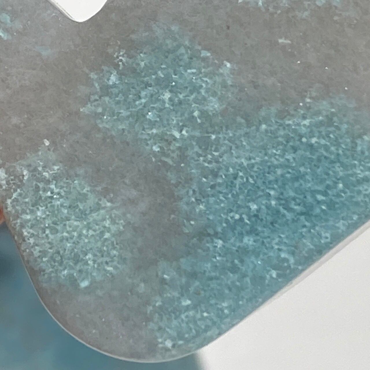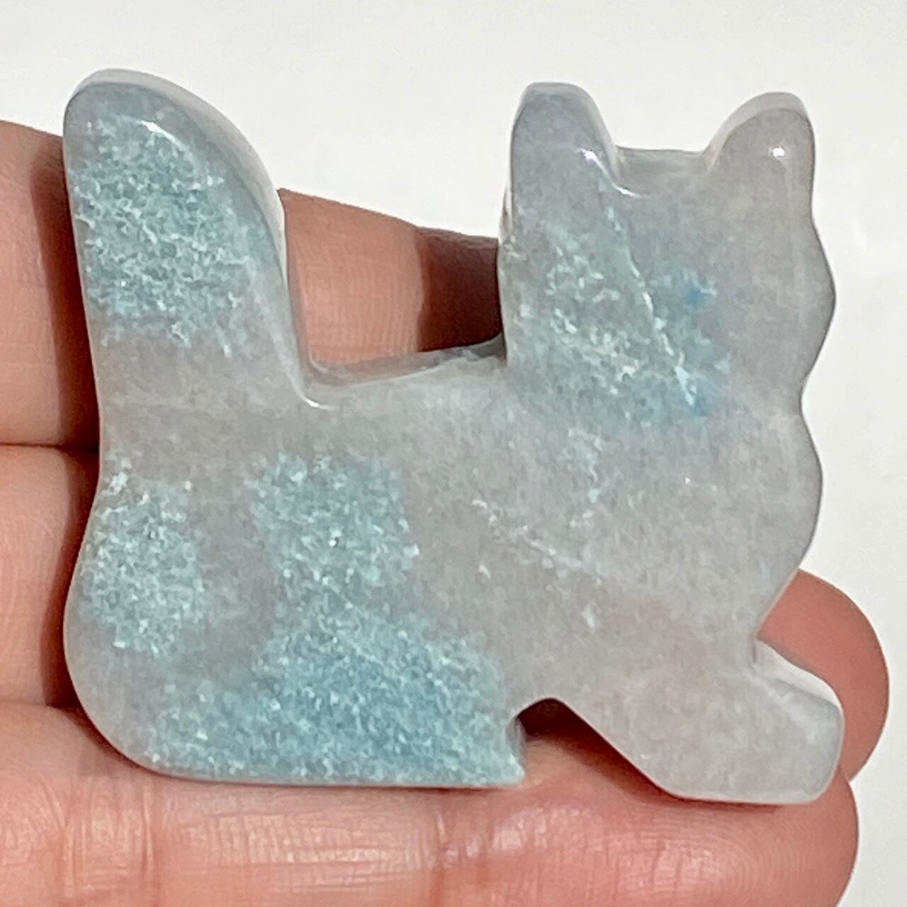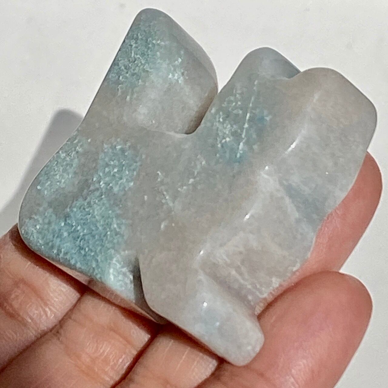 両面とも葛餅のような色味のベースに淡いベイビーブルーとホワイトのホワイトの斑らのパッチが入った癒し系の子です。ハートに優しい色味です。