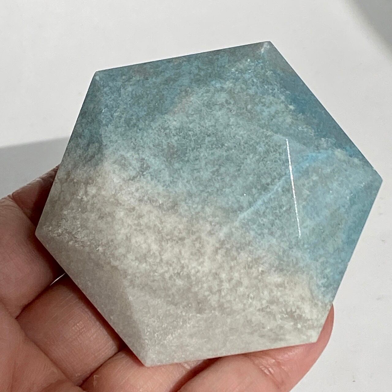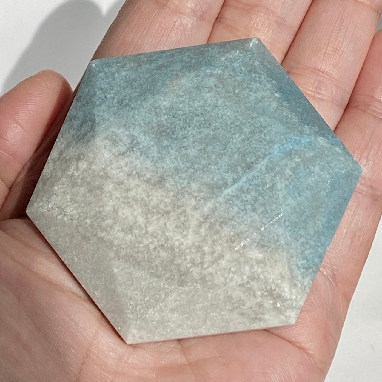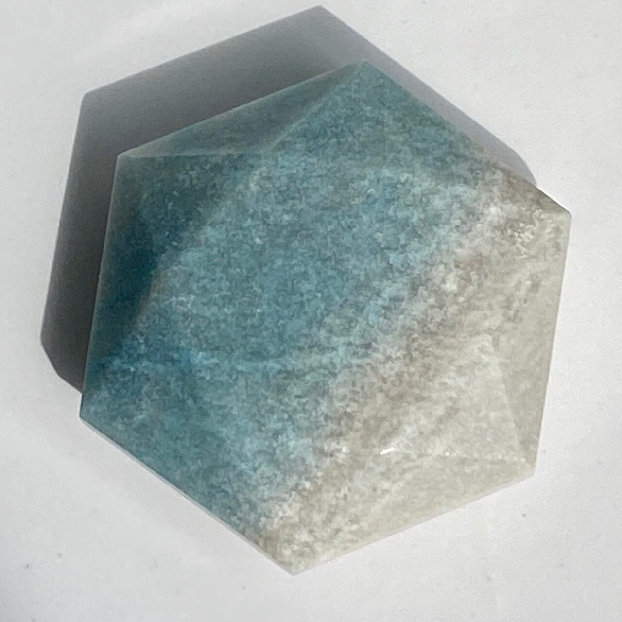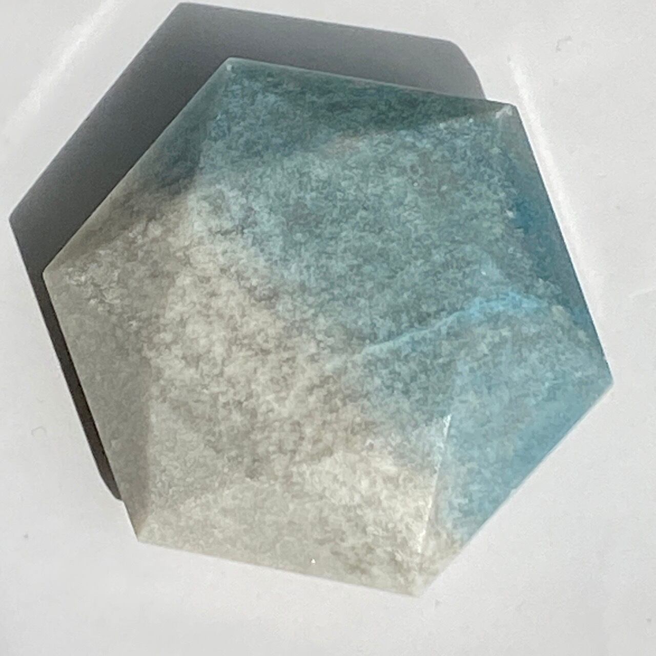 二つの正三角形を逆に重ねた六芒星(ヘキサグラム)が面取りにて両面に施されたヘキサゴンです。ライトブルーとオフホワイト(部分的にグレーがかっているところもあります)のバイカラーが空と穏やかな海のような景色を思わせます。トロレアイトの魅力である粒々感が楽しめます。真ん中の平らな部分に小物を置くことが可能です。ちなみに、例えば他の石やクリスタル、動物のカービングや天使などを飾るのもキュートです。今回はマカバを置いて撮影してみました。