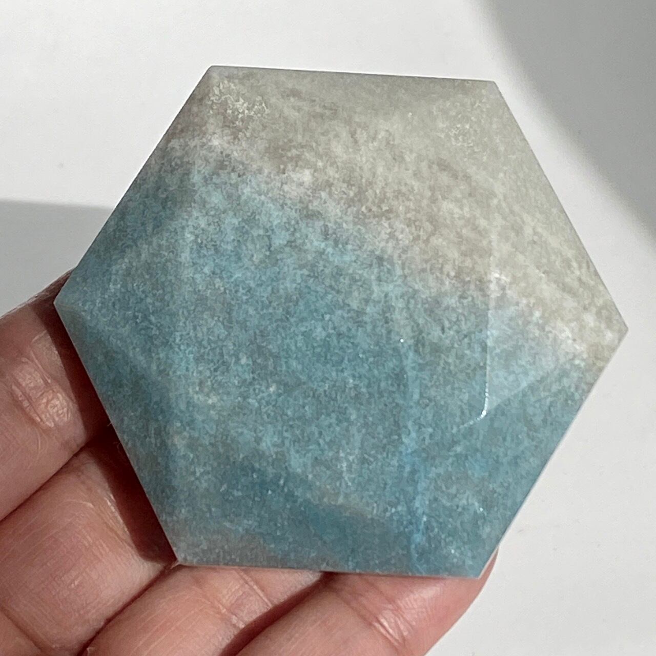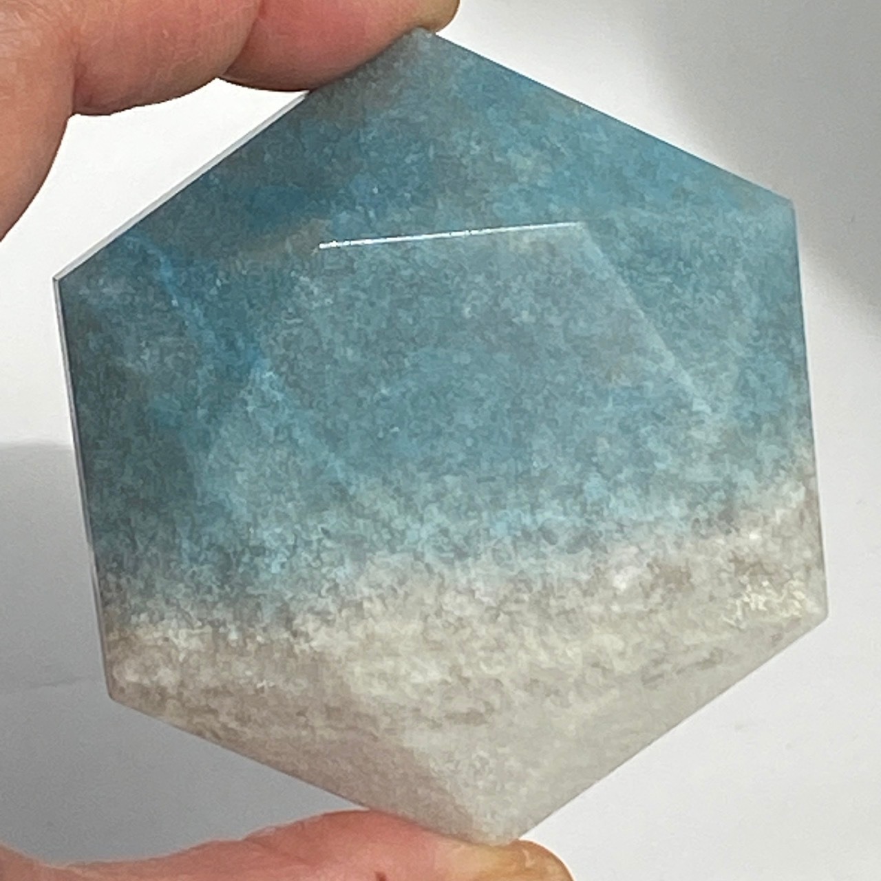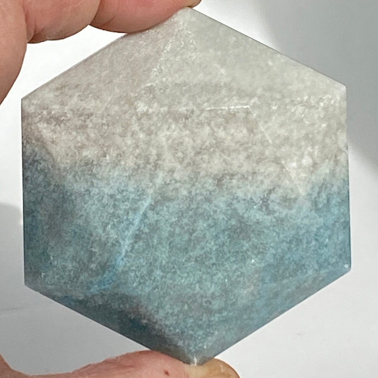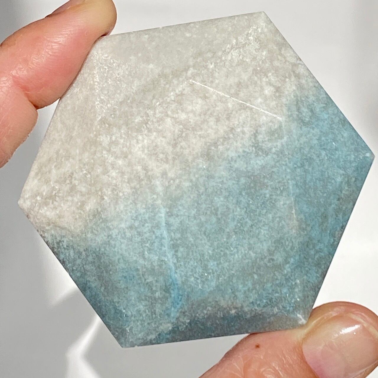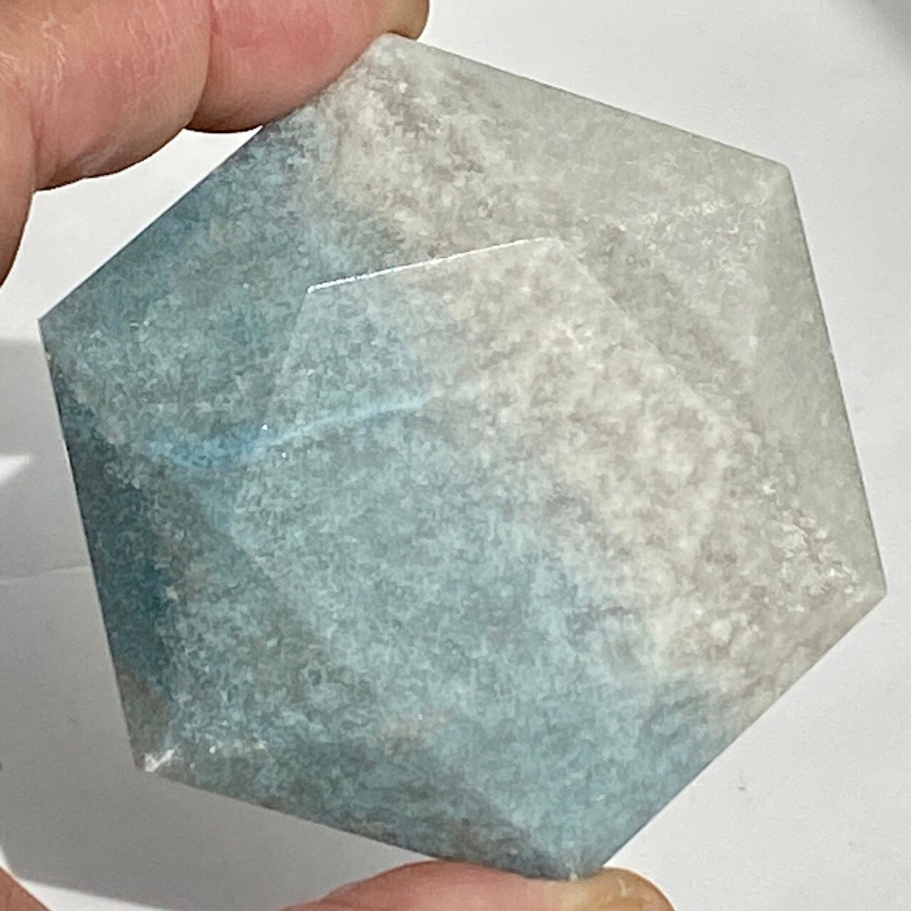 二つの正三角形を逆に重ねた六芒星(ヘキサグラム)が面取りにて両面に施されたヘキサゴンです。ライトブルーとオフホワイト(部分的にグレーがかっているところもあります)のバイカラーが空と穏やかな海のような景色を思わせます。トロレアイトの魅力である粒々感が楽しめます。真ん中の平らな部分に小物を置くことが可能です。ちなみに、例えば他の石やクリスタル、動物のカービングや天使などを飾るのもキュートです。今回はマカバを置いて撮影してみました。