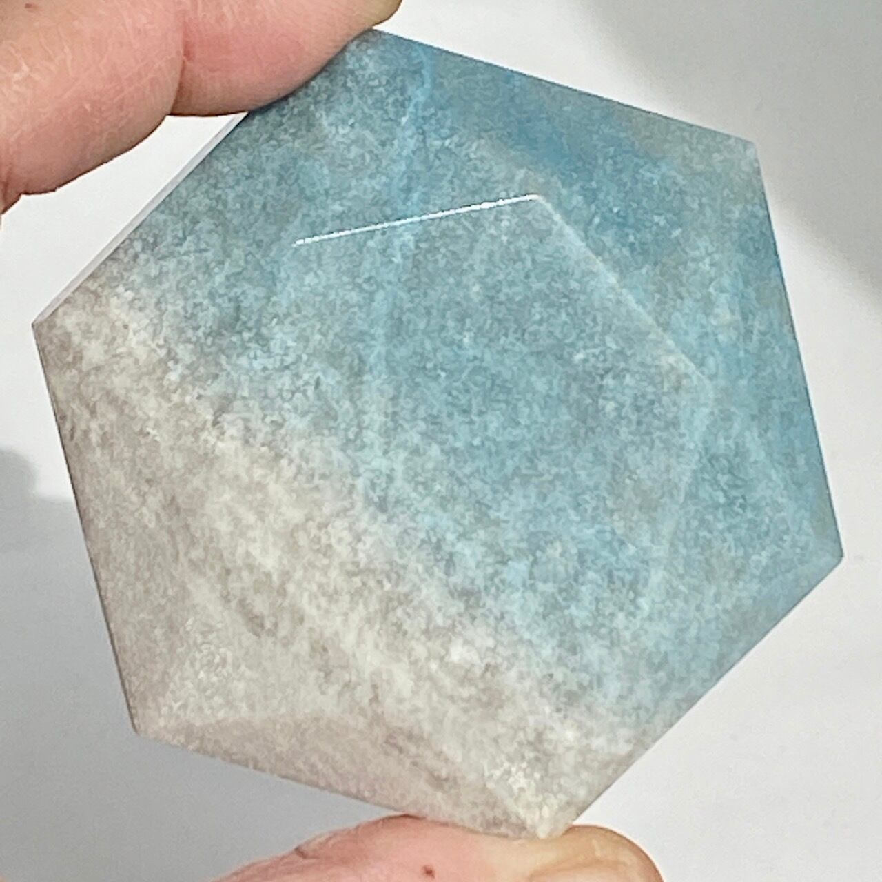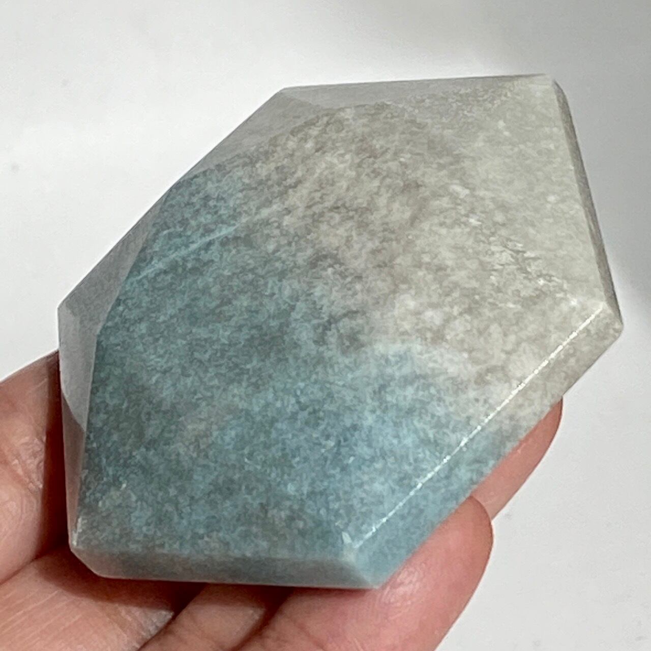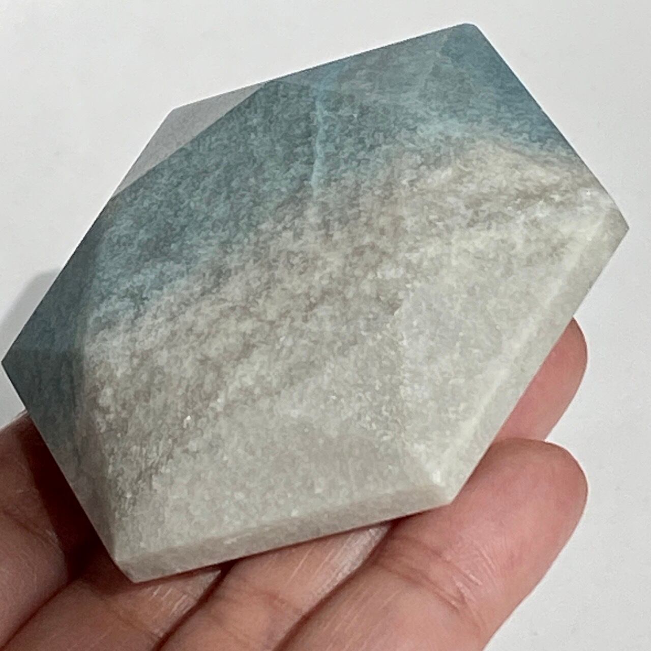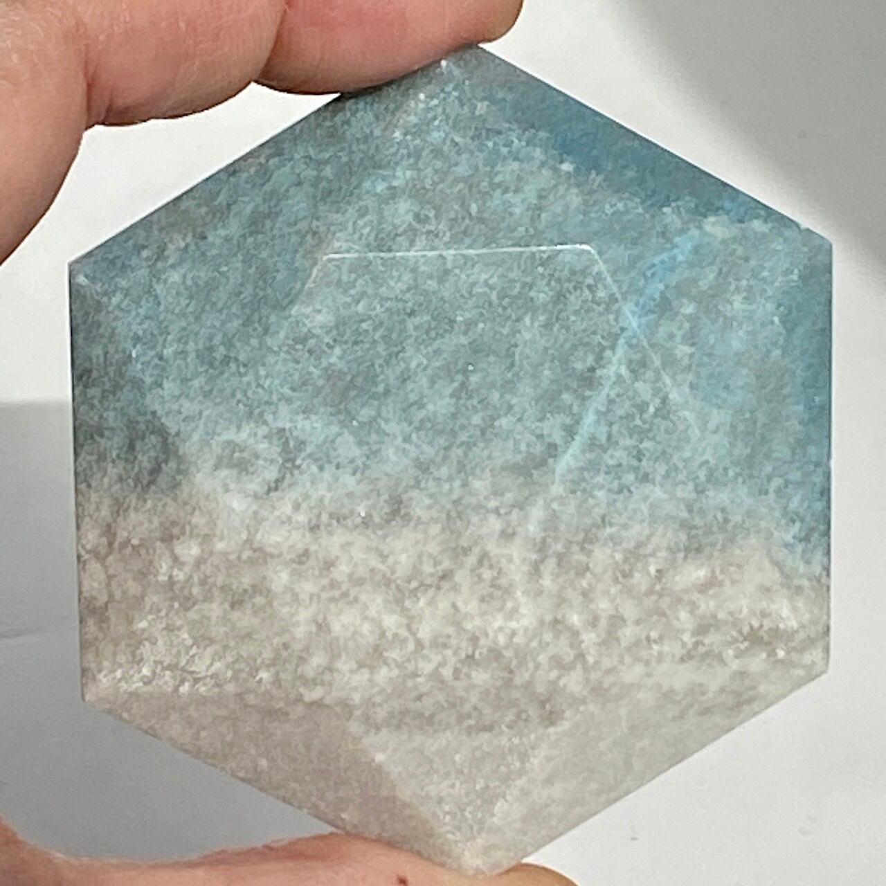 二つの正三角形を逆に重ねた六芒星(ヘキサグラム)が面取りにて両面に施されたヘキサゴンです。ライトブルーとオフホワイト(部分的にグレーがかっているところもあります)のバイカラーが空と穏やかな海のような景色を思わせます。トロレアイトの魅力である粒々感が楽しめます。真ん中の平らな部分に小物を置くことが可能です。ちなみに、例えば他の石やクリスタル、動物のカービングや天使などを飾るのもキュートです。今回はマカバを置いて撮影してみました。