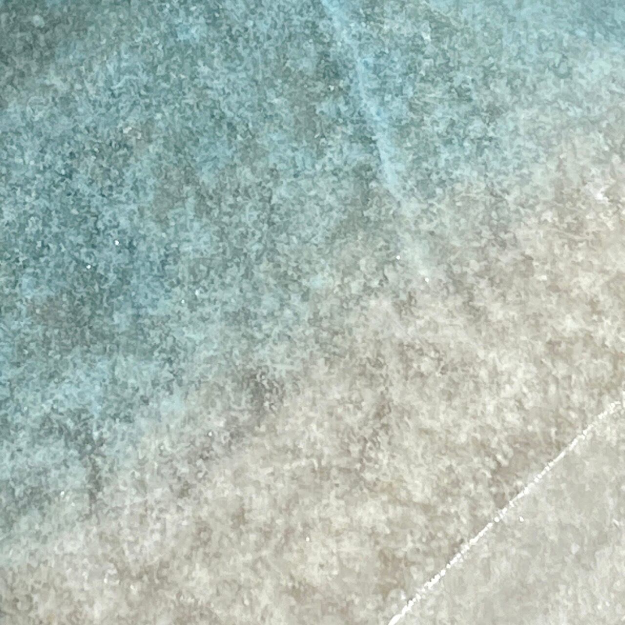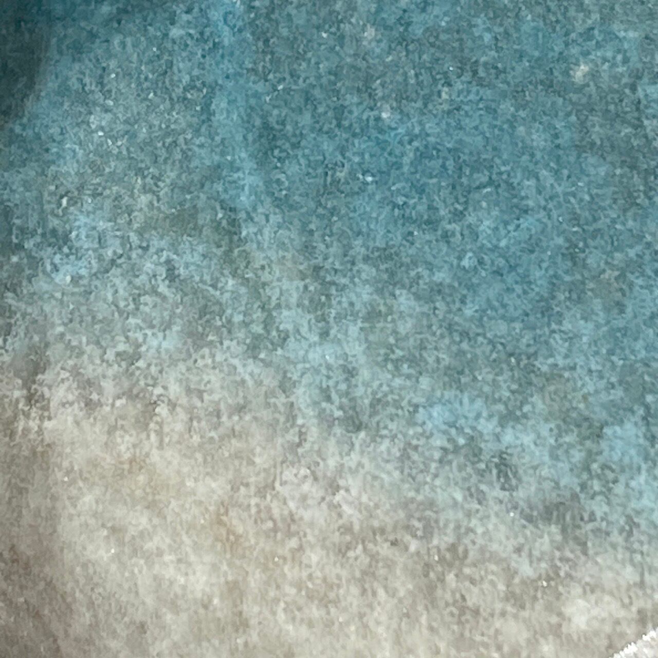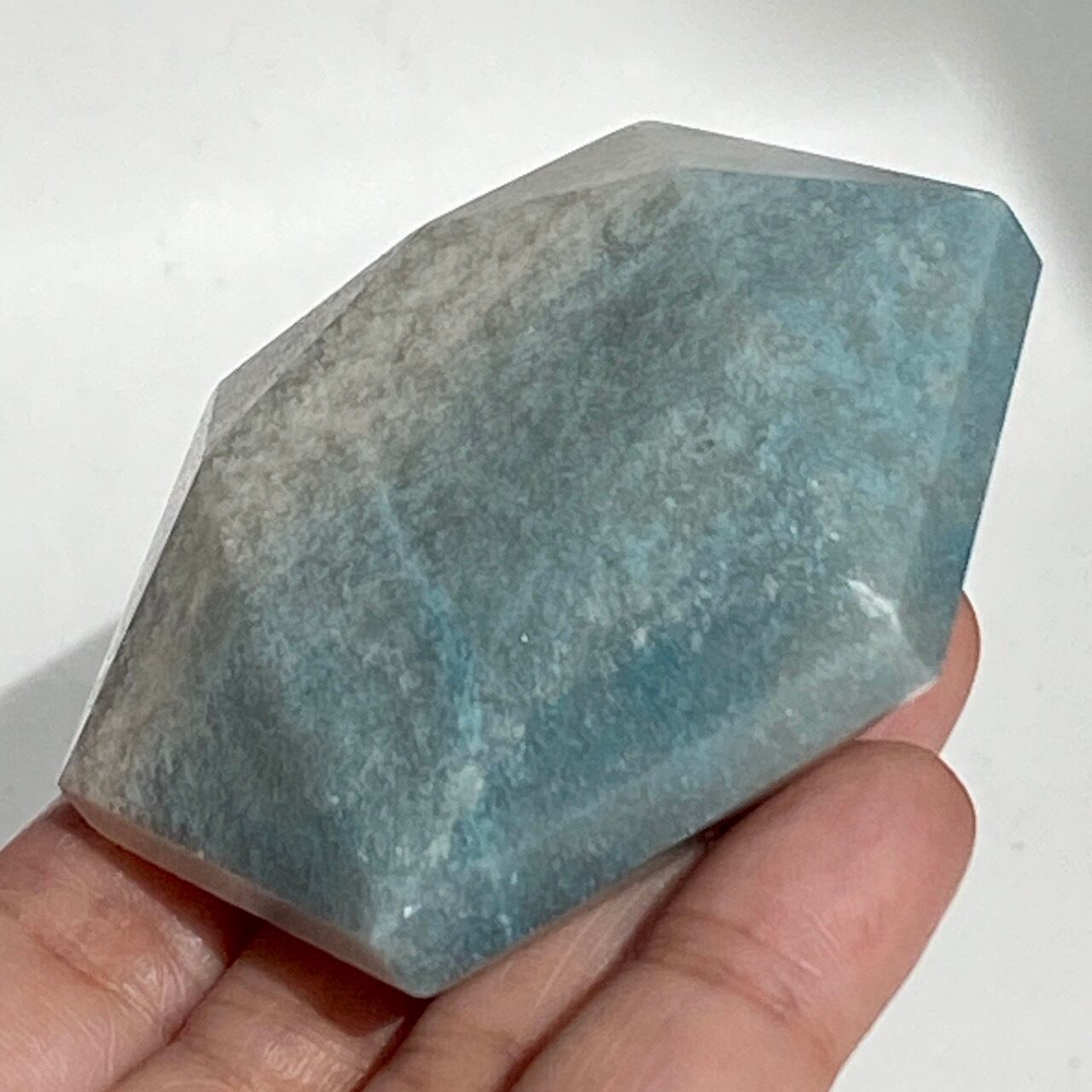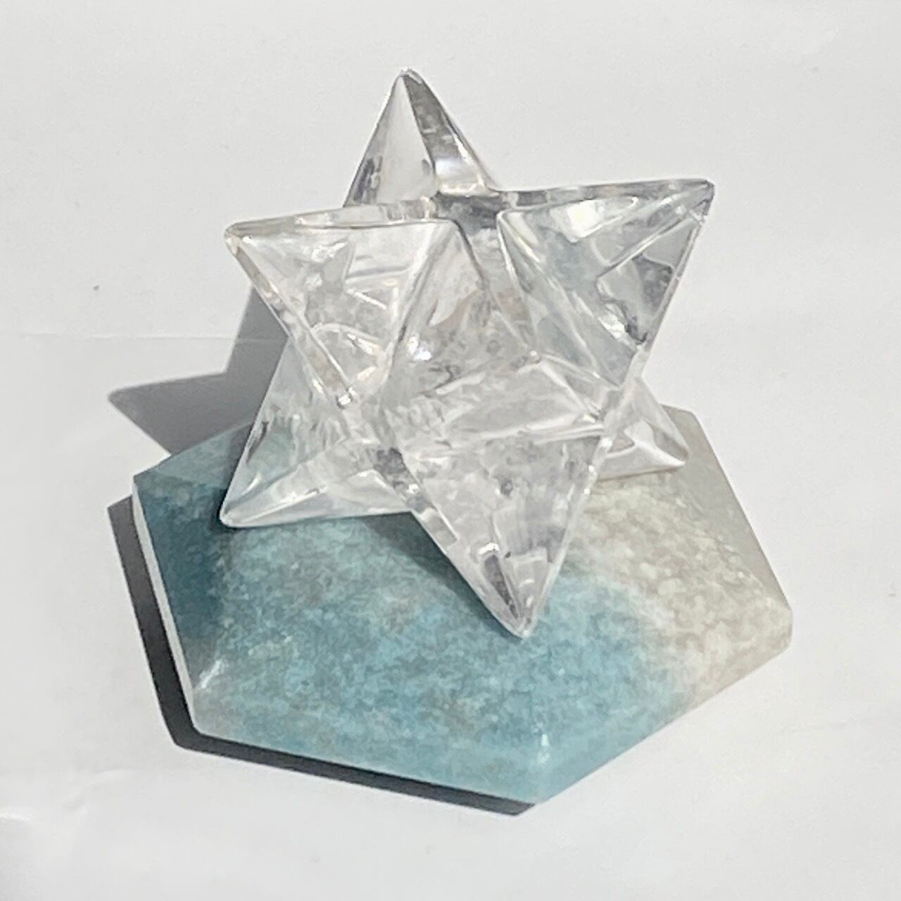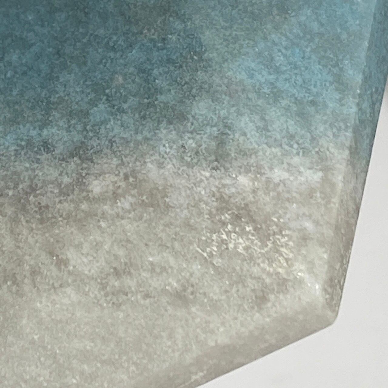 二つの正三角形を逆に重ねた六芒星(ヘキサグラム)が面取りにて両面に施されたヘキサゴンです。ライトブルーとオフホワイト(部分的にグレーがかっているところもあります)のバイカラーが空と穏やかな海のような景色を思わせます。トロレアイトの魅力である粒々感が楽しめます。真ん中の平らな部分に小物を置くことが可能です。ちなみに、例えば他の石やクリスタル、動物のカービングや天使などを飾るのもキュートです。今回はマカバを置いて撮影してみました。