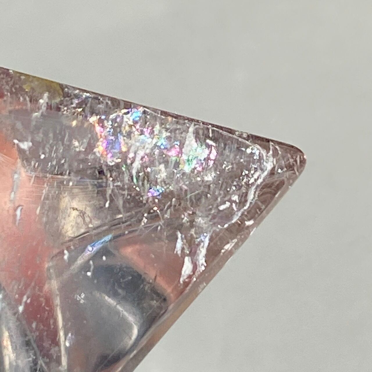 透明感のあるマカバです。数箇所に素敵なレインボーが見られるオススメの子です。表面にクォーツ特有のクラックやチップ(欠け)そしてキズ等がございますが、形状的に製作が難しいのにも関わらず、クオリティは良い方だと思います。