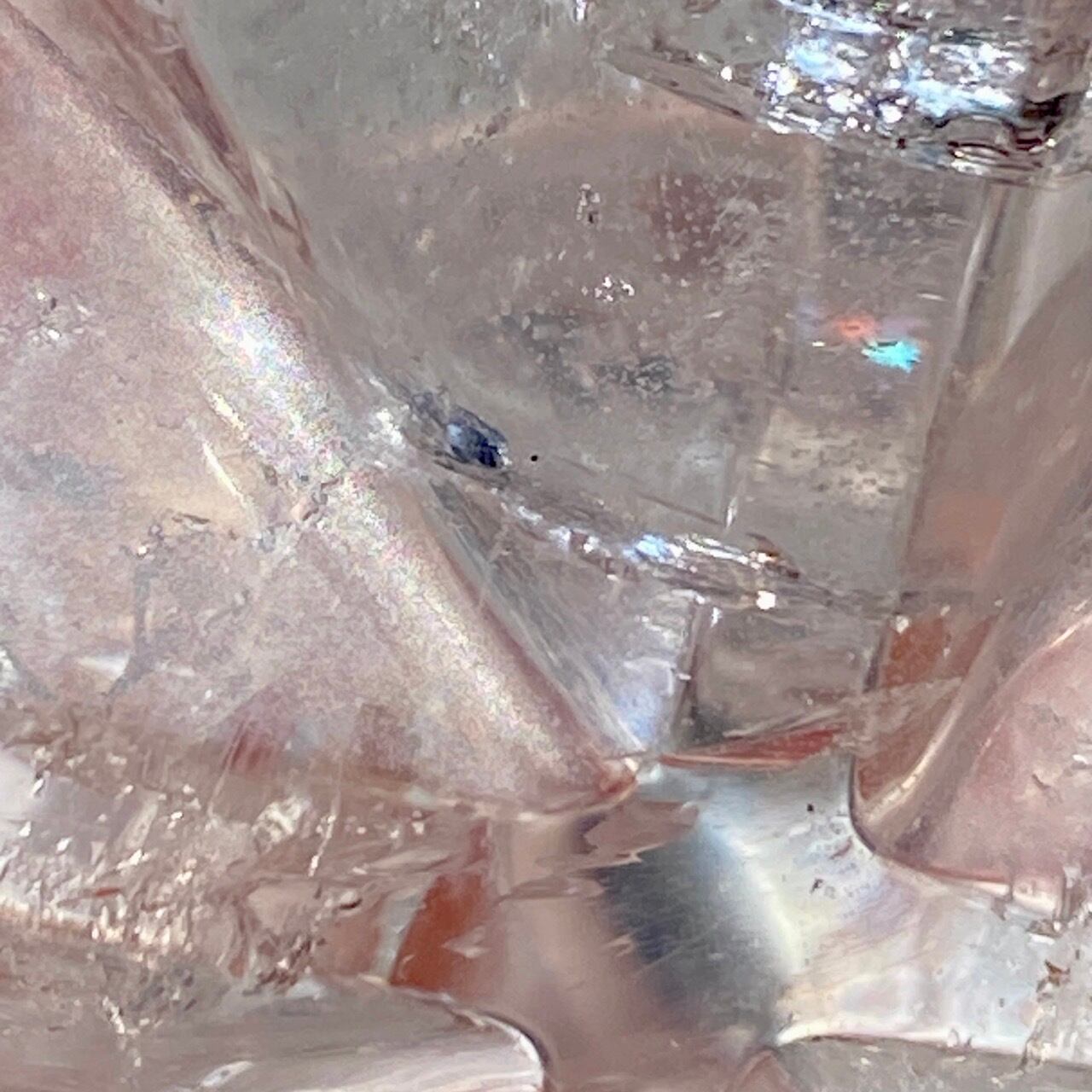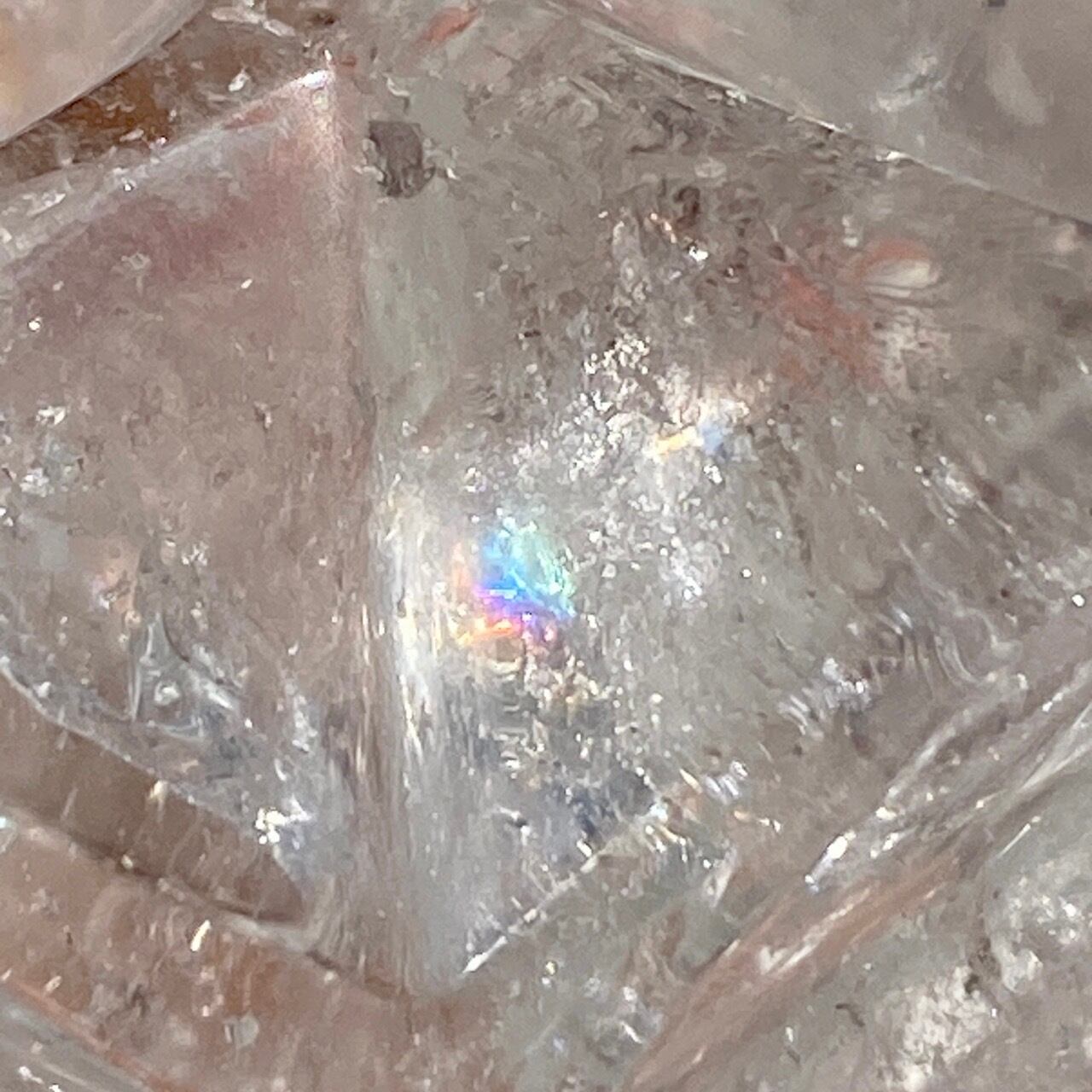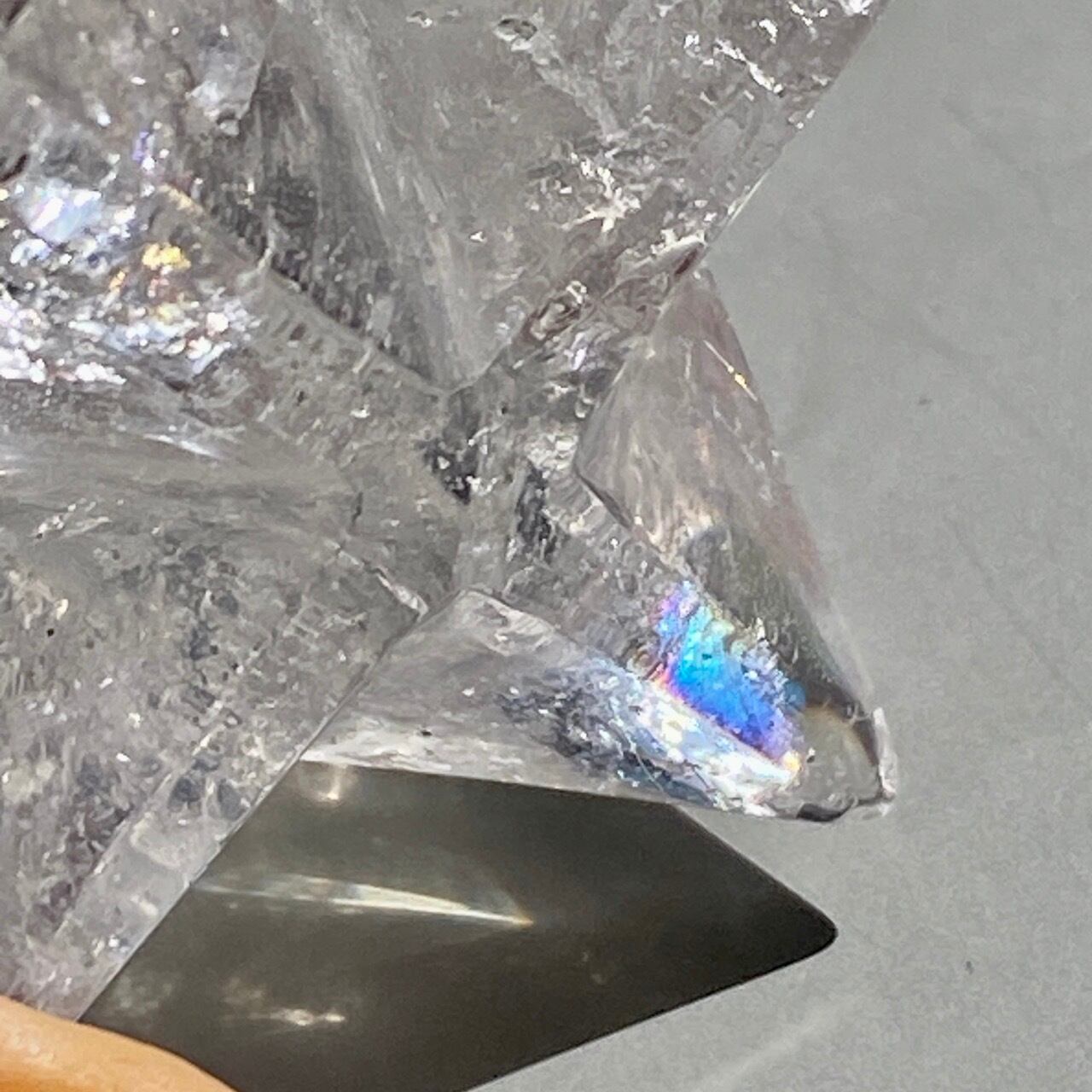 どことなく氷のような涼しげなマカバです。複数箇所に素敵なレインボーが見られます。表面にクォーツ特有のクラックやチップ(欠け)そしてキズ等がございます。