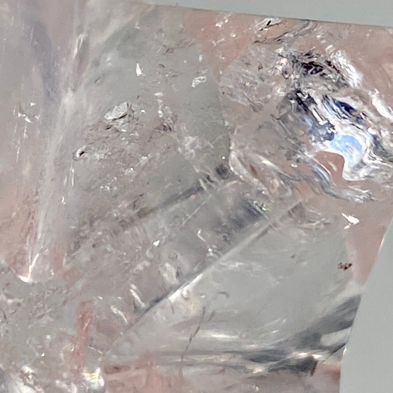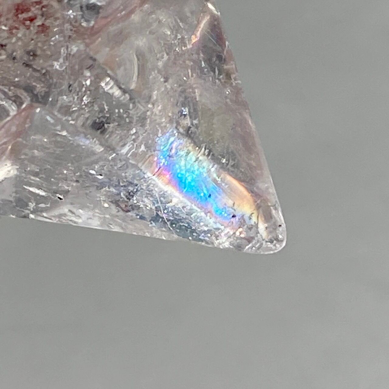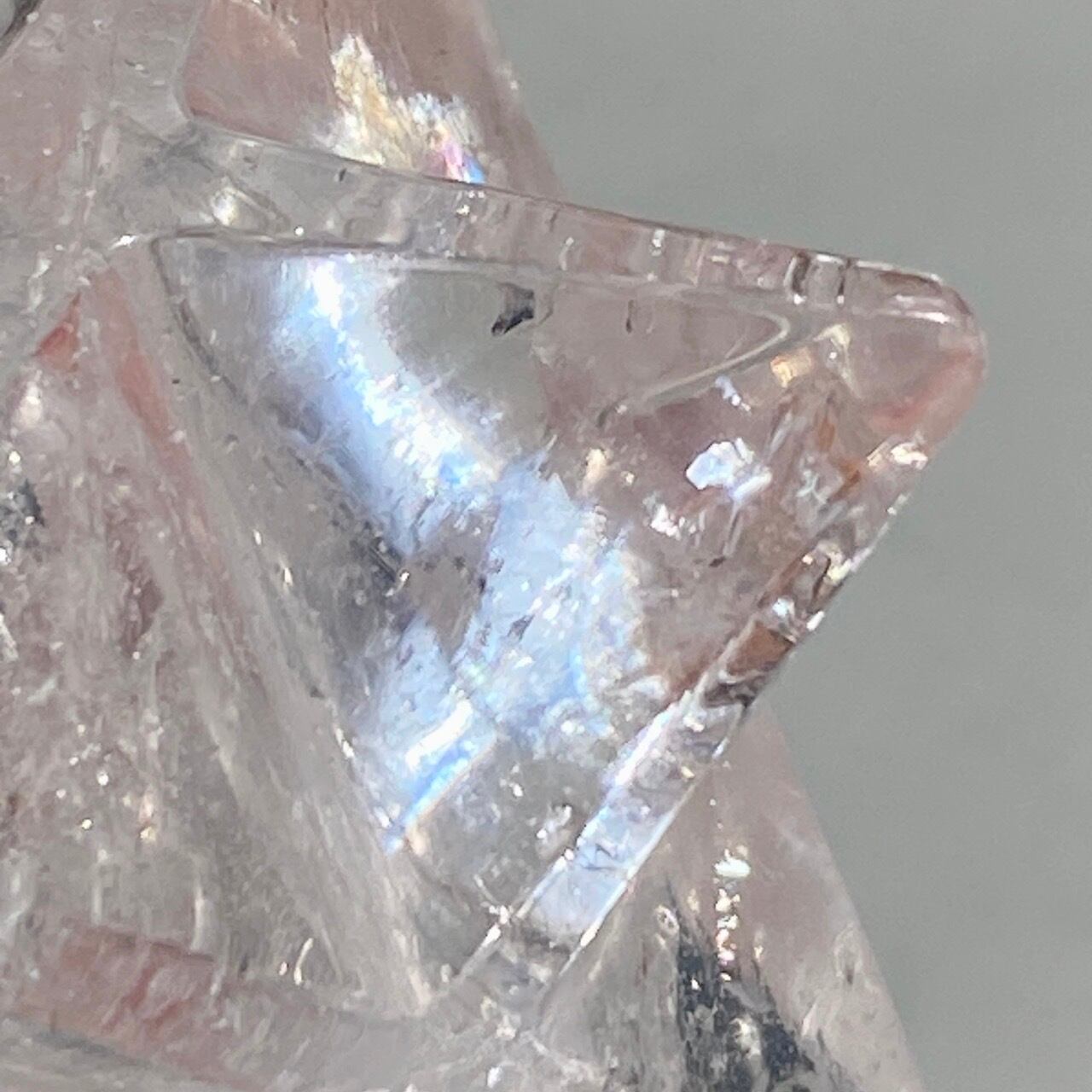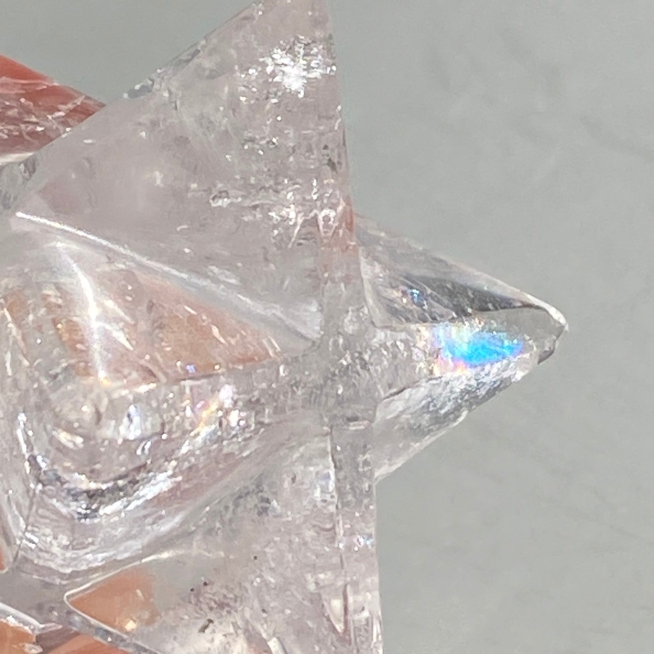 どことなく氷のような涼しげなマカバです。複数箇所に素敵なレインボーが見られます。表面にクォーツ特有のクラックやチップ(欠け)そしてキズ等がございます。