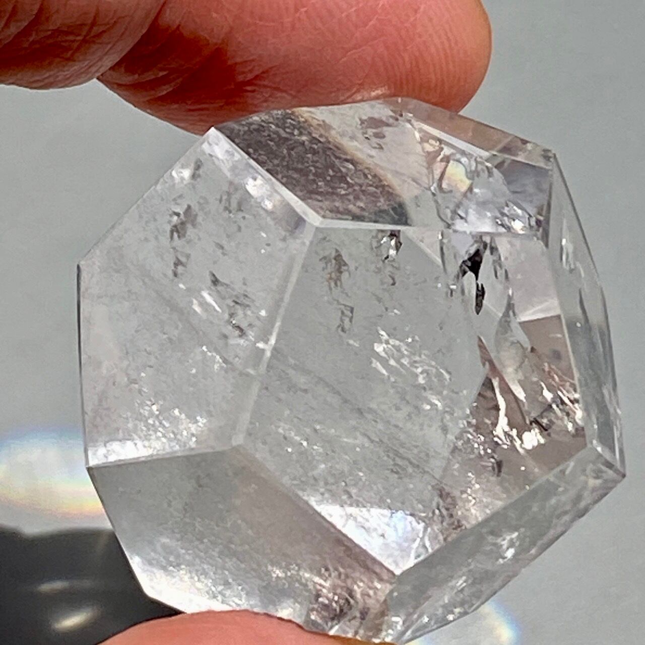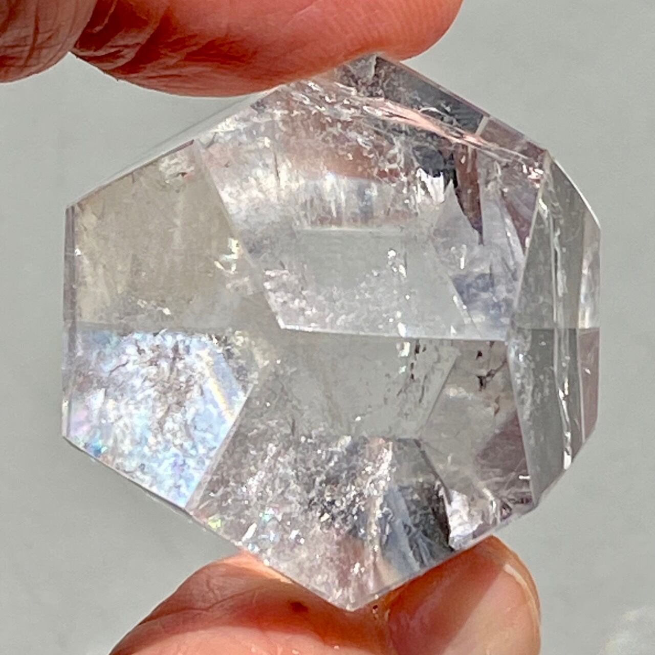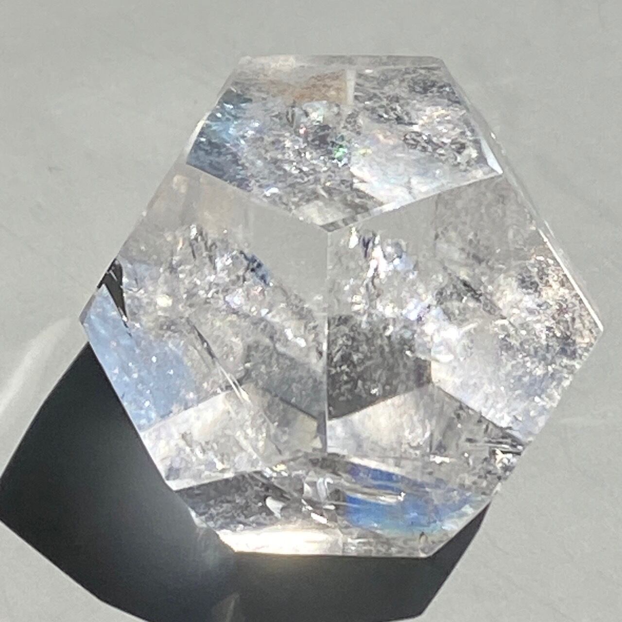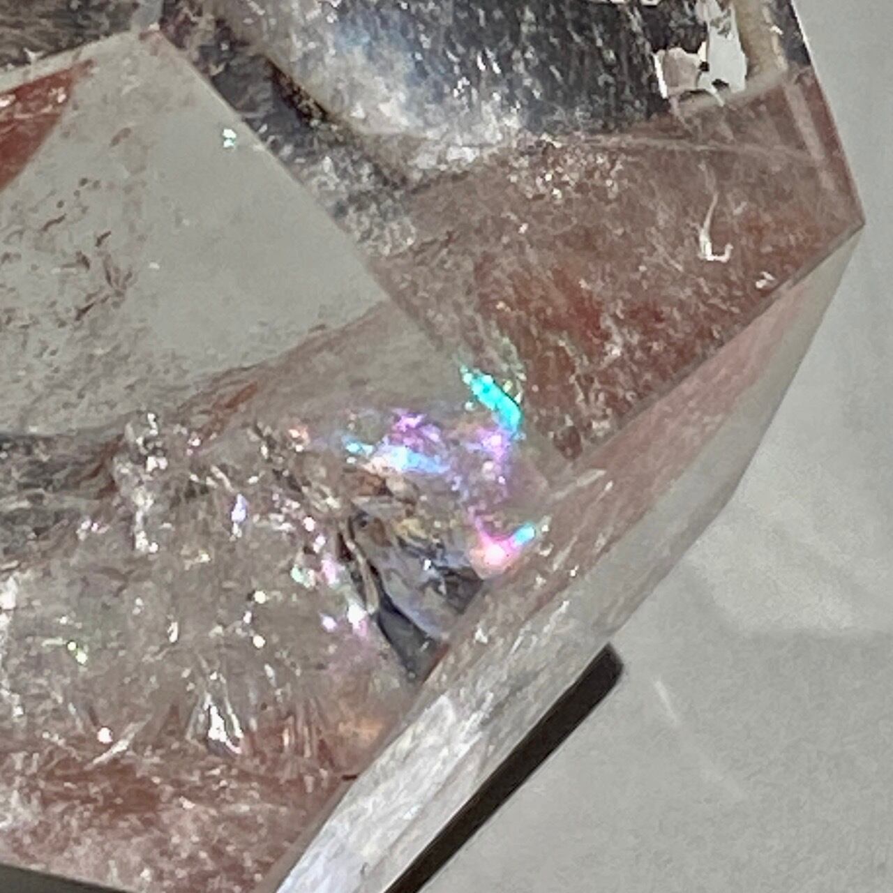 透明感があり、内部クラックが複数のレインボーを作り出しています。外側の面にもクォーツ特有のクラックやチップ(欠け)そしてキズ等がございます。