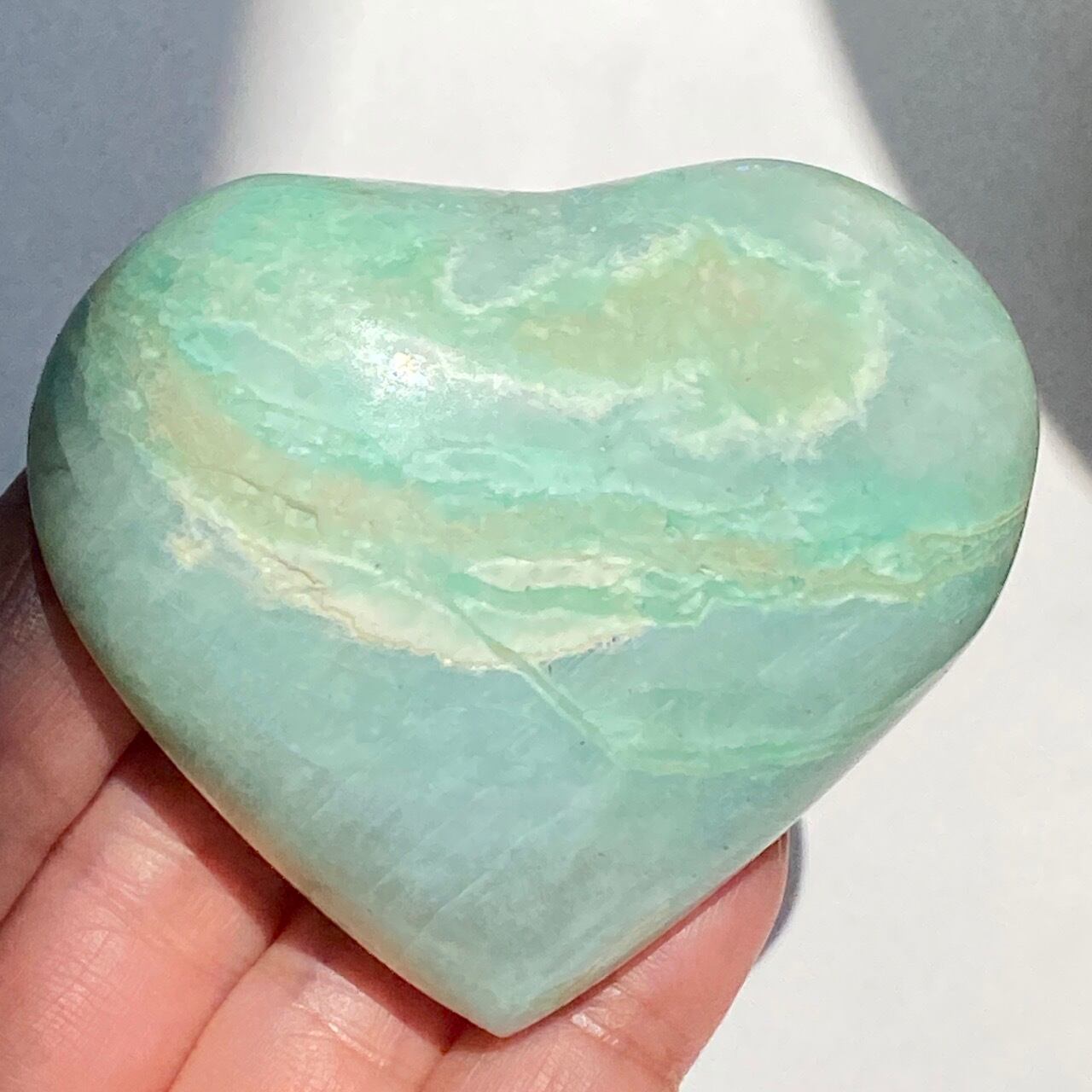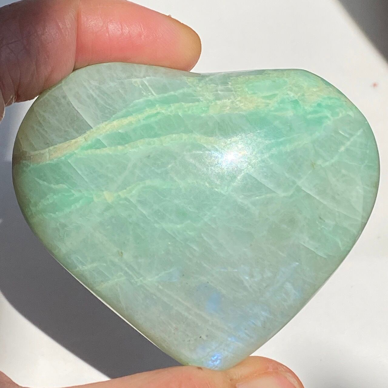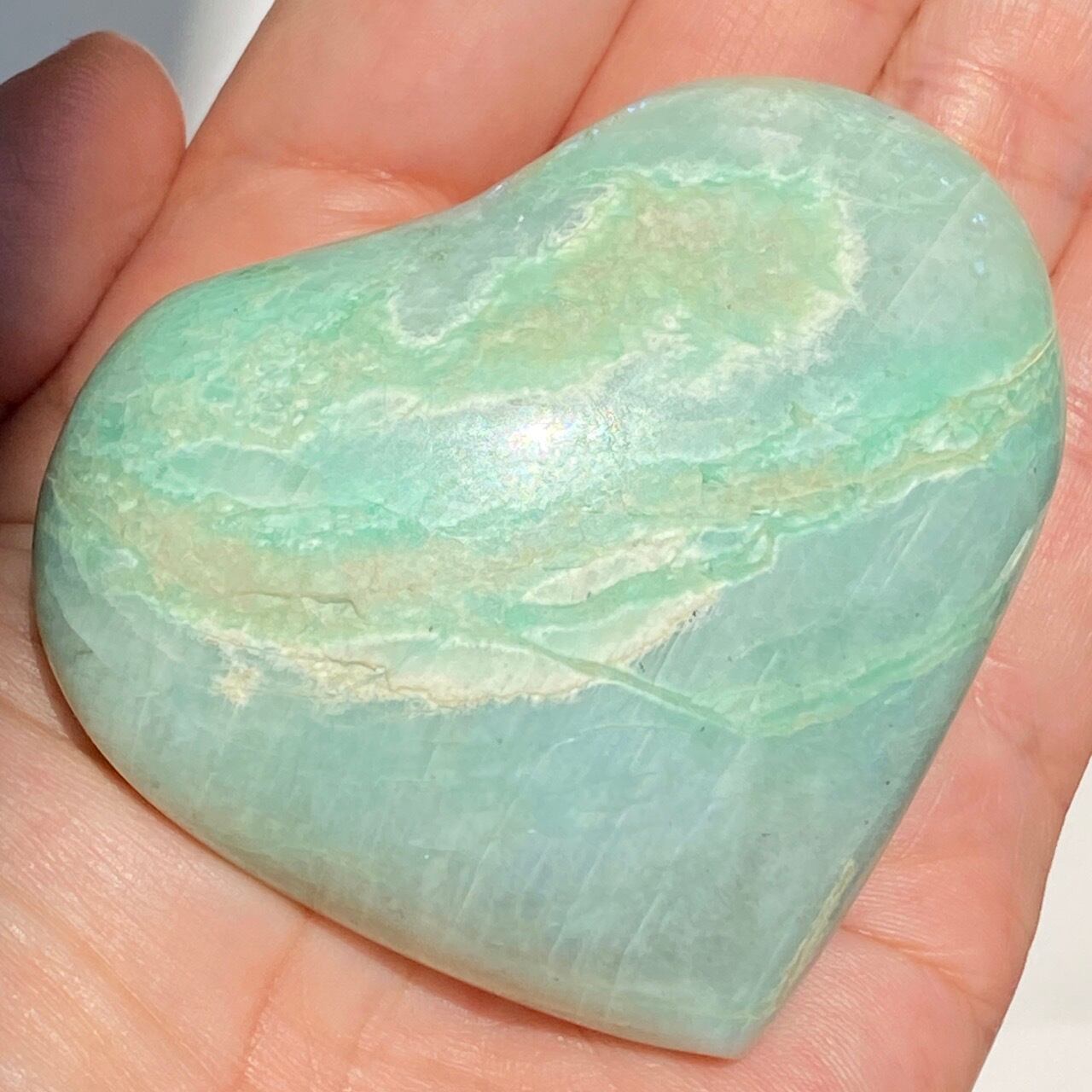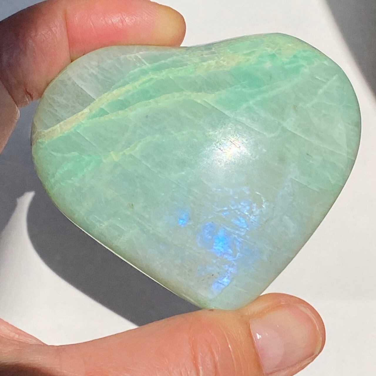 流通名がムーンライトと付く石の中で最も好きな、グリーンムーンストーン(ガーニエライト)のハートです。若干いびつな形も愛おしく、美しいブルーのシラーが浮かび上がる子になります。色味も柔らかいグリーンのトーンにソフトイエローがアクセントを加えていて、ハートに優しい感じがします。