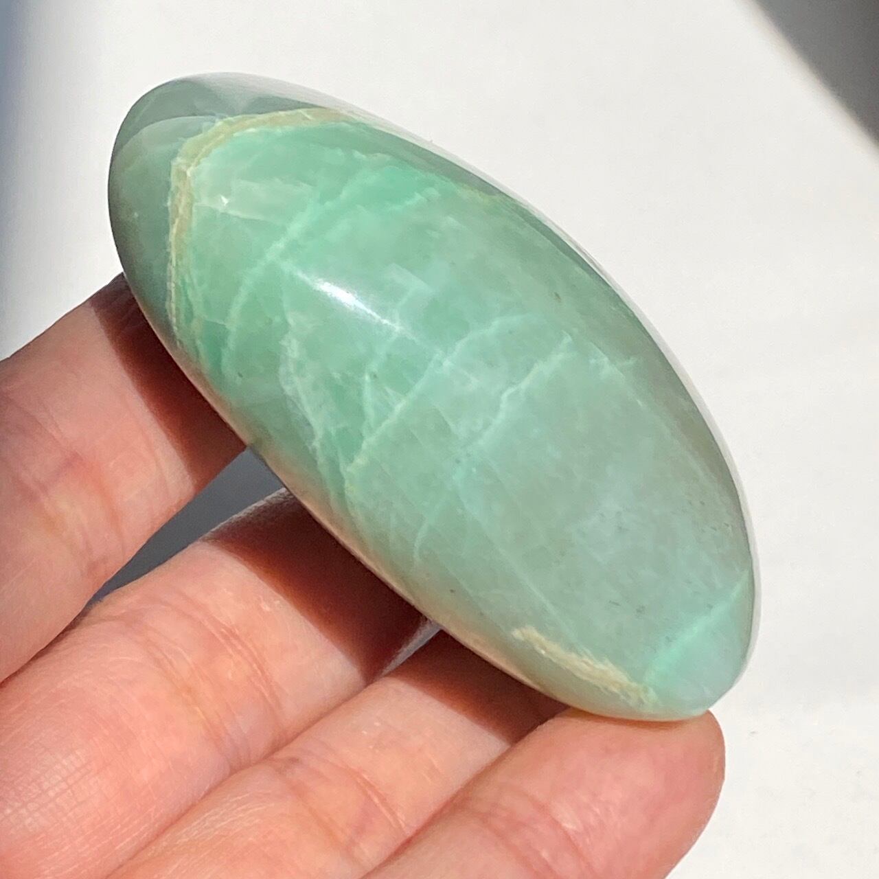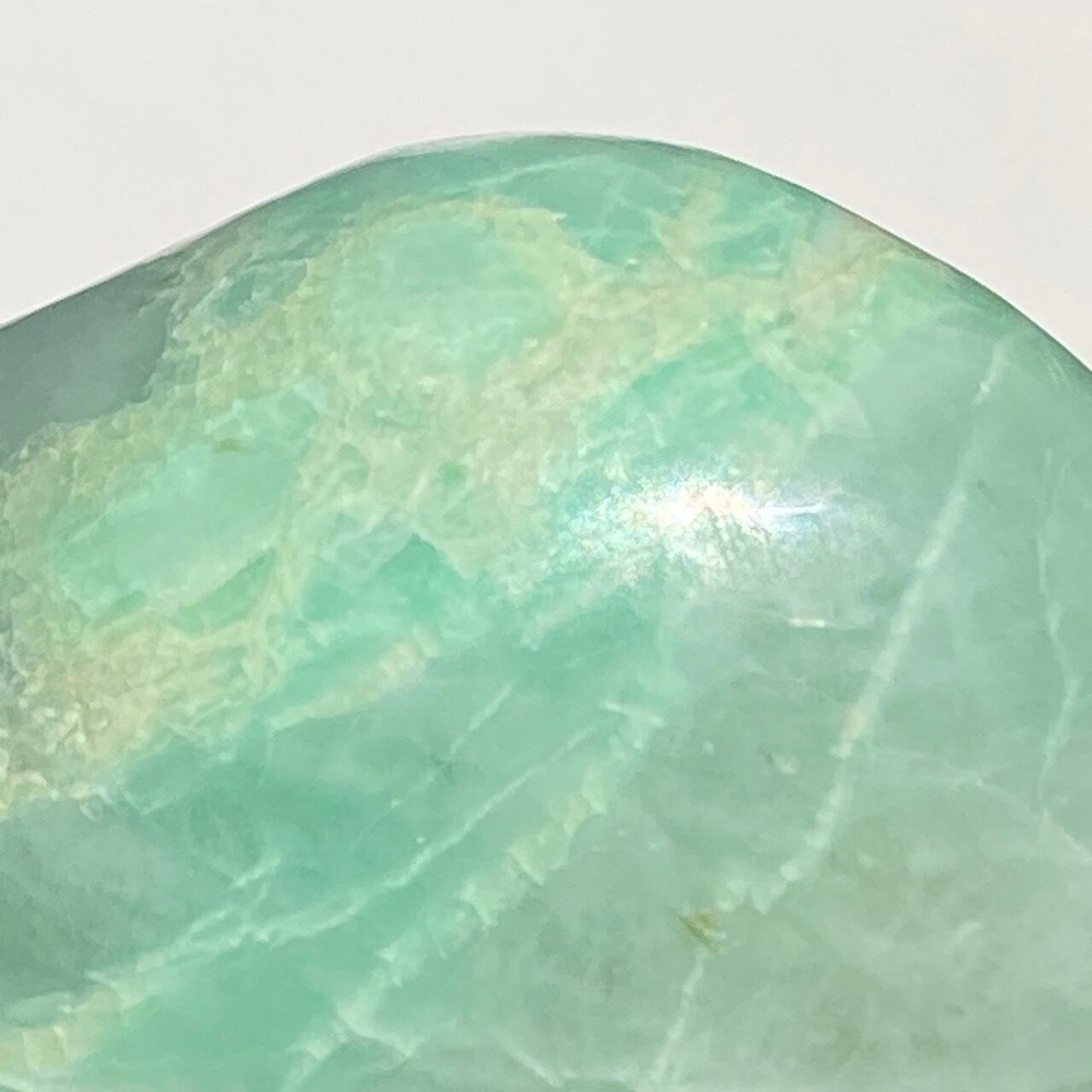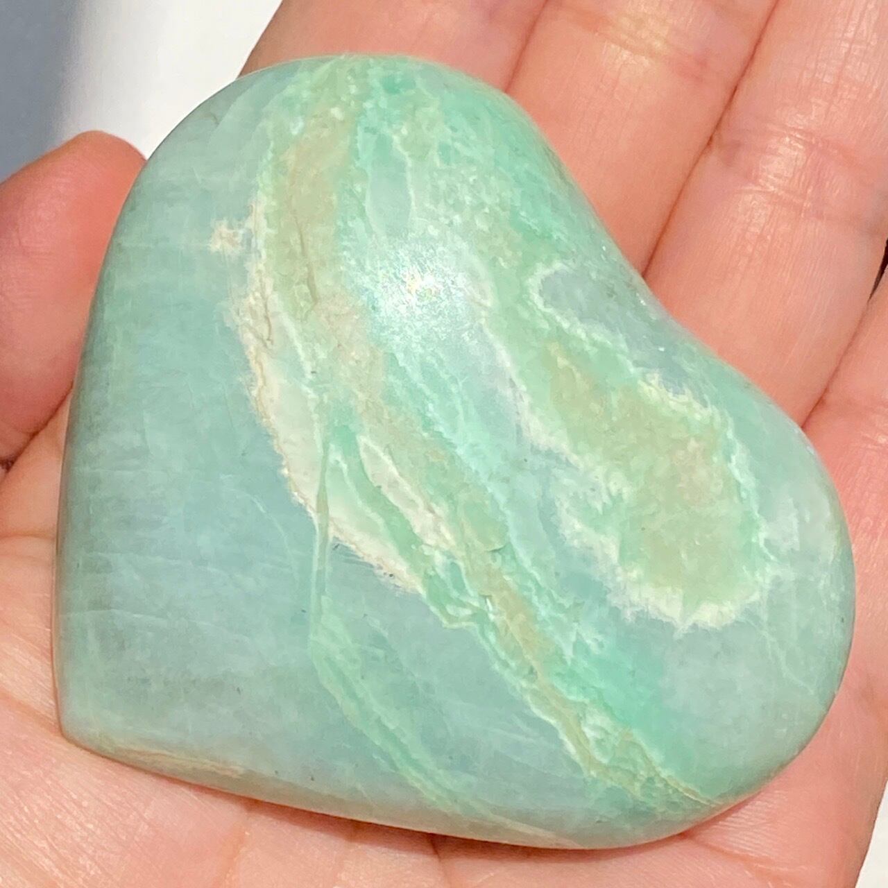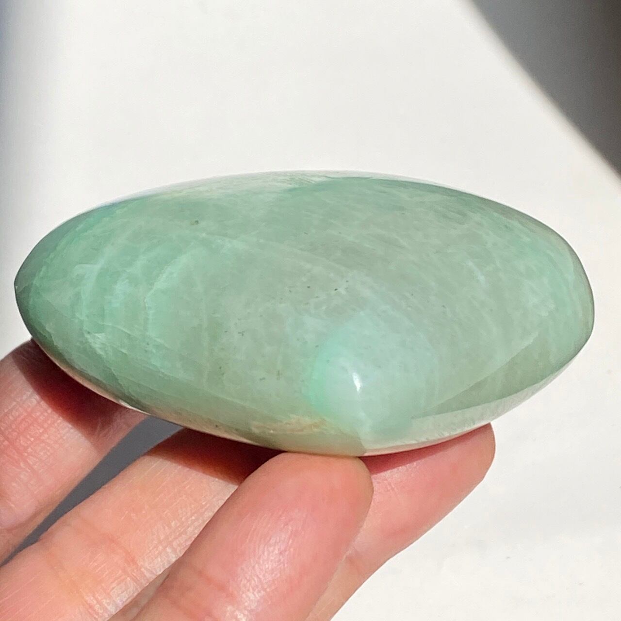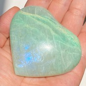 流通名がムーンライトと付く石の中で最も好きな、グリーンムーンストーン(ガーニエライト)のハートです。若干いびつな形も愛おしく、美しいブルーのシラーが浮かび上がる子になります。色味も柔らかいグリーンのトーンにソフトイエローがアクセントを加えていて、ハートに優しい感じがします。