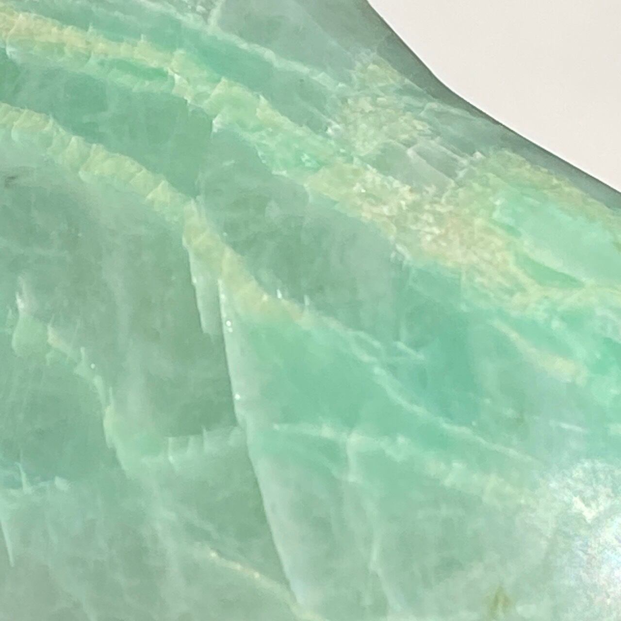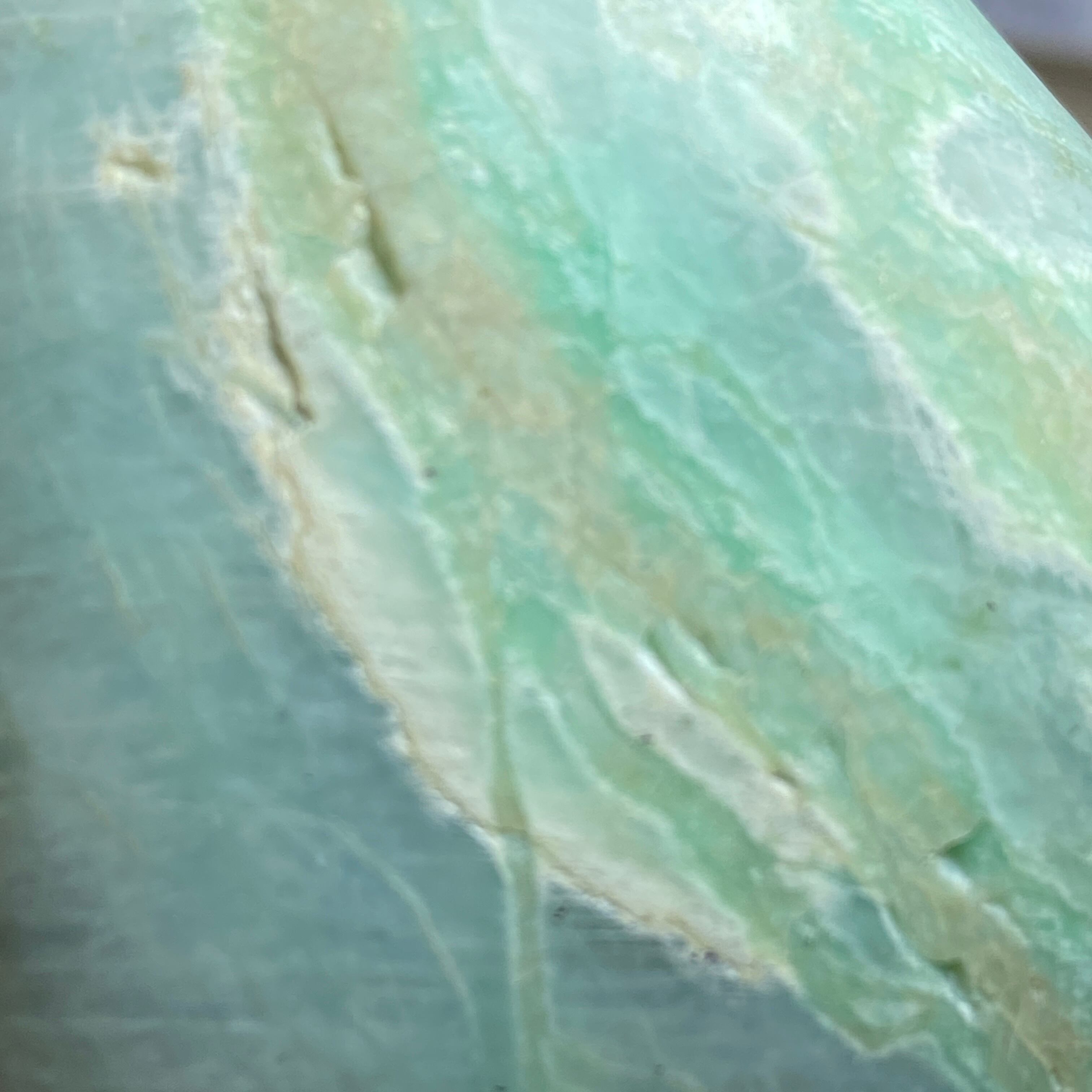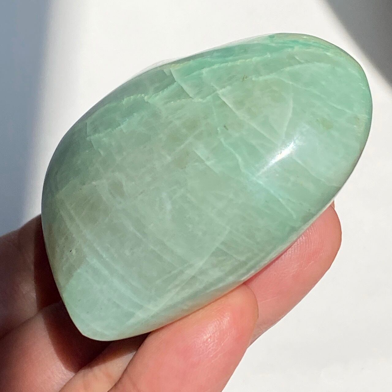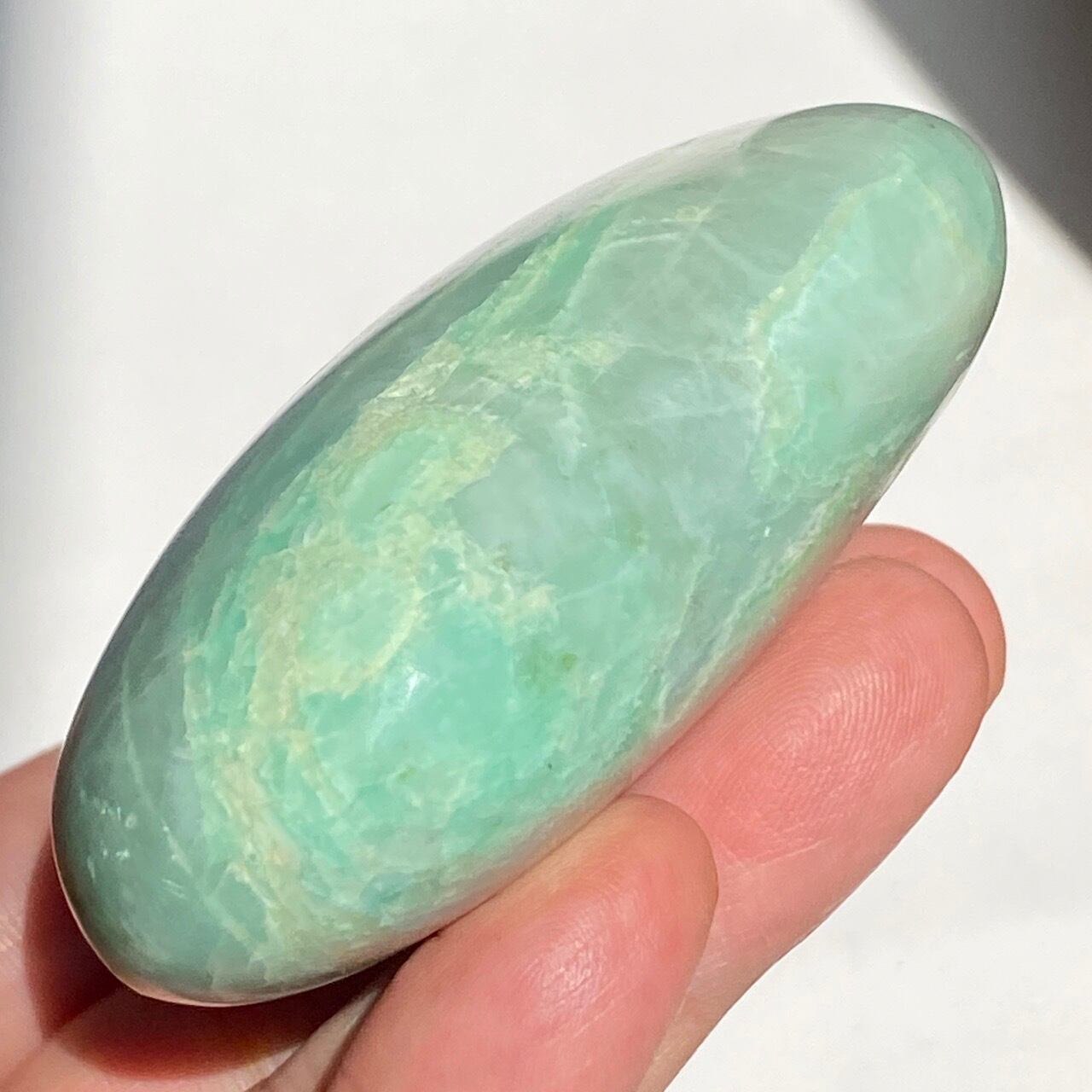 流通名がムーンライトと付く石の中で最も好きな、グリーンムーンストーン(ガーニエライト)のハートです。若干いびつな形も愛おしく、美しいブルーのシラーが浮かび上がる子になります。色味も柔らかいグリーンのトーンにソフトイエローがアクセントを加えていて、ハートに優しい感じがします。