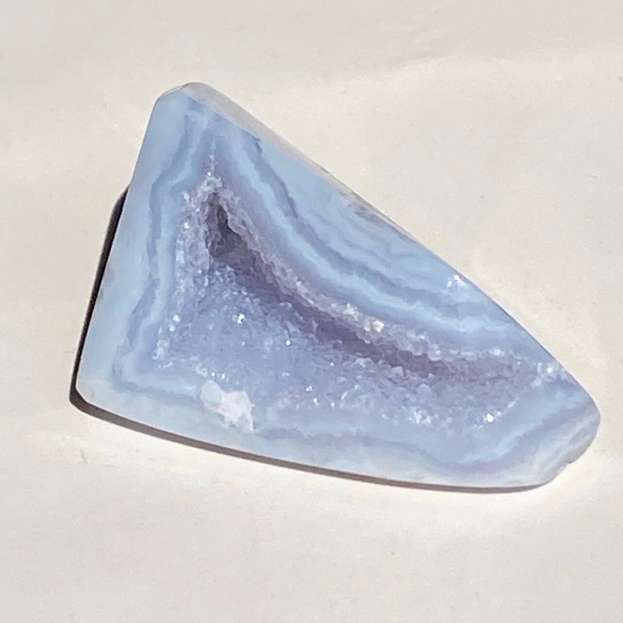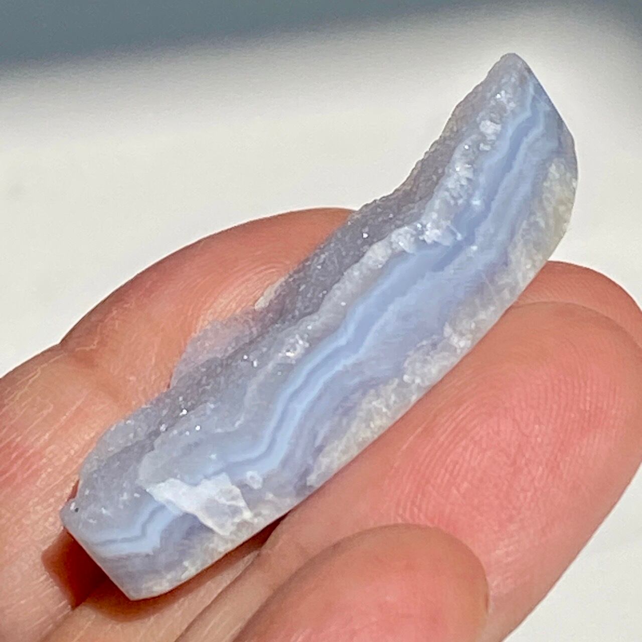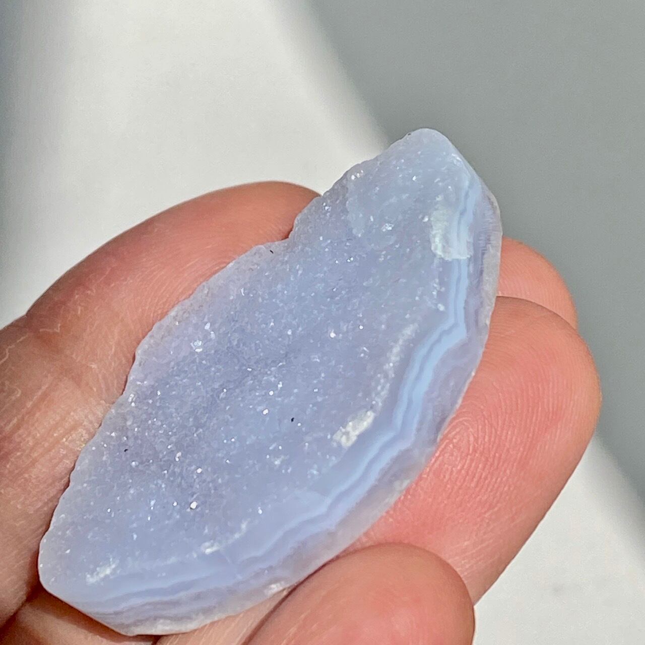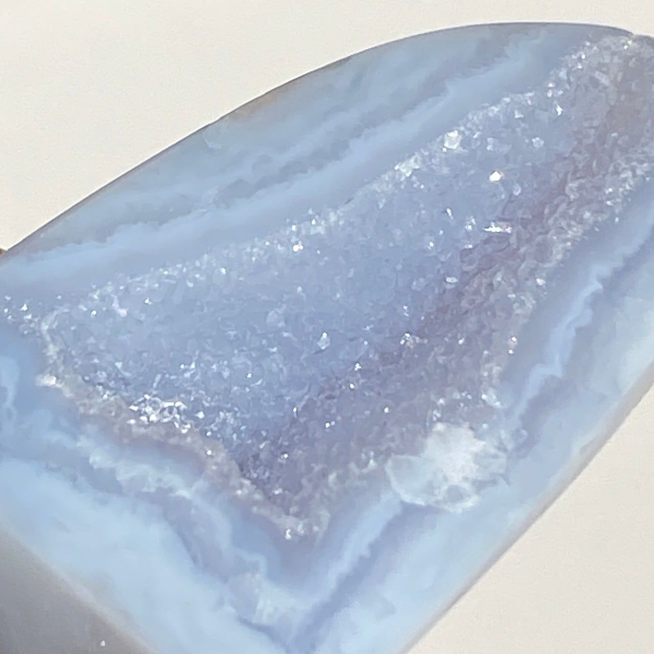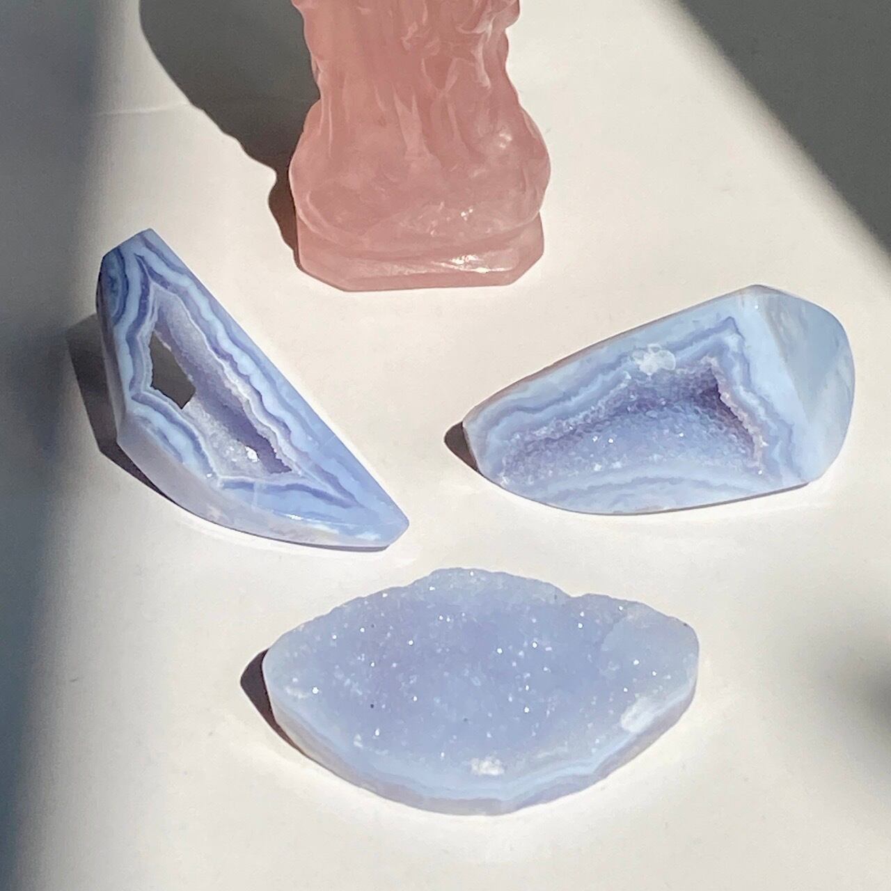 ブルーレースアゲート(和名:空色縞瑪瑙)のドゥルージー入りミニフリーフォームアソート3個セットなります。美しいバンディングと柔らかな煌めきを放つドゥルージー、そして心を穏やかにさせてくれる澄んだライトブルーが美しい子達です。アゲートの中でも算出量が少なく、世界中に愛好家がいるため、サイズが小さくても高値で取引されています。