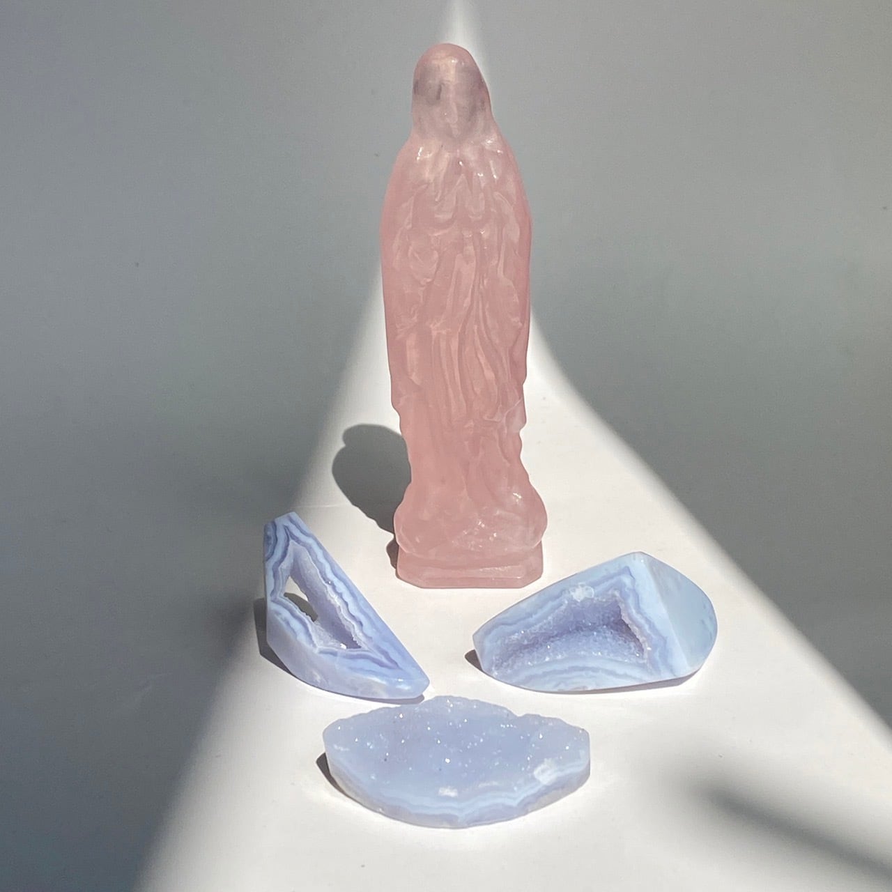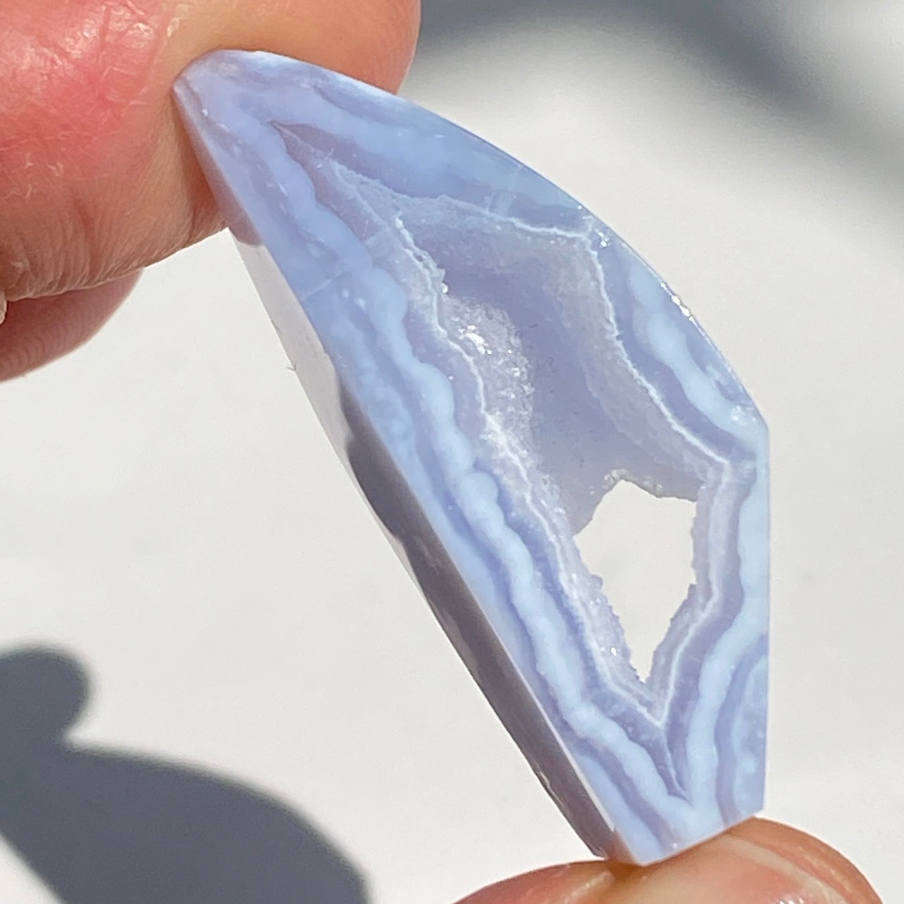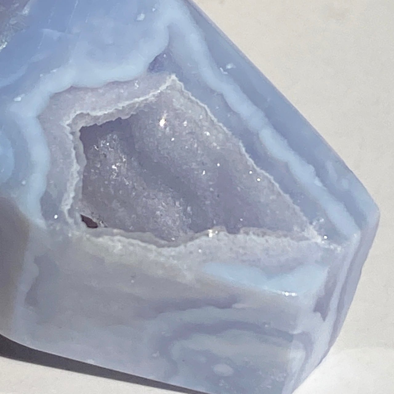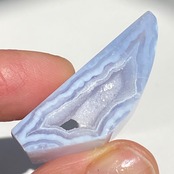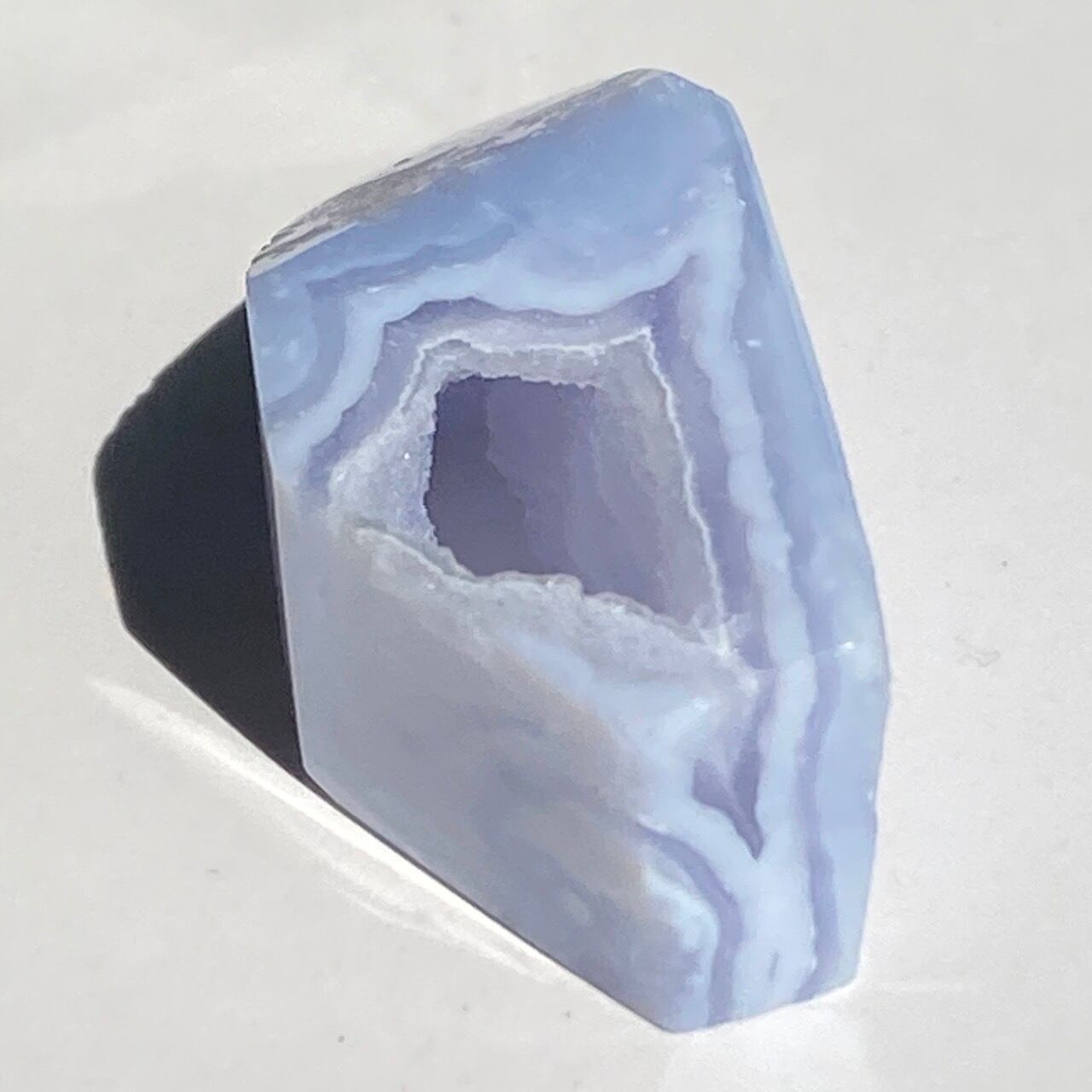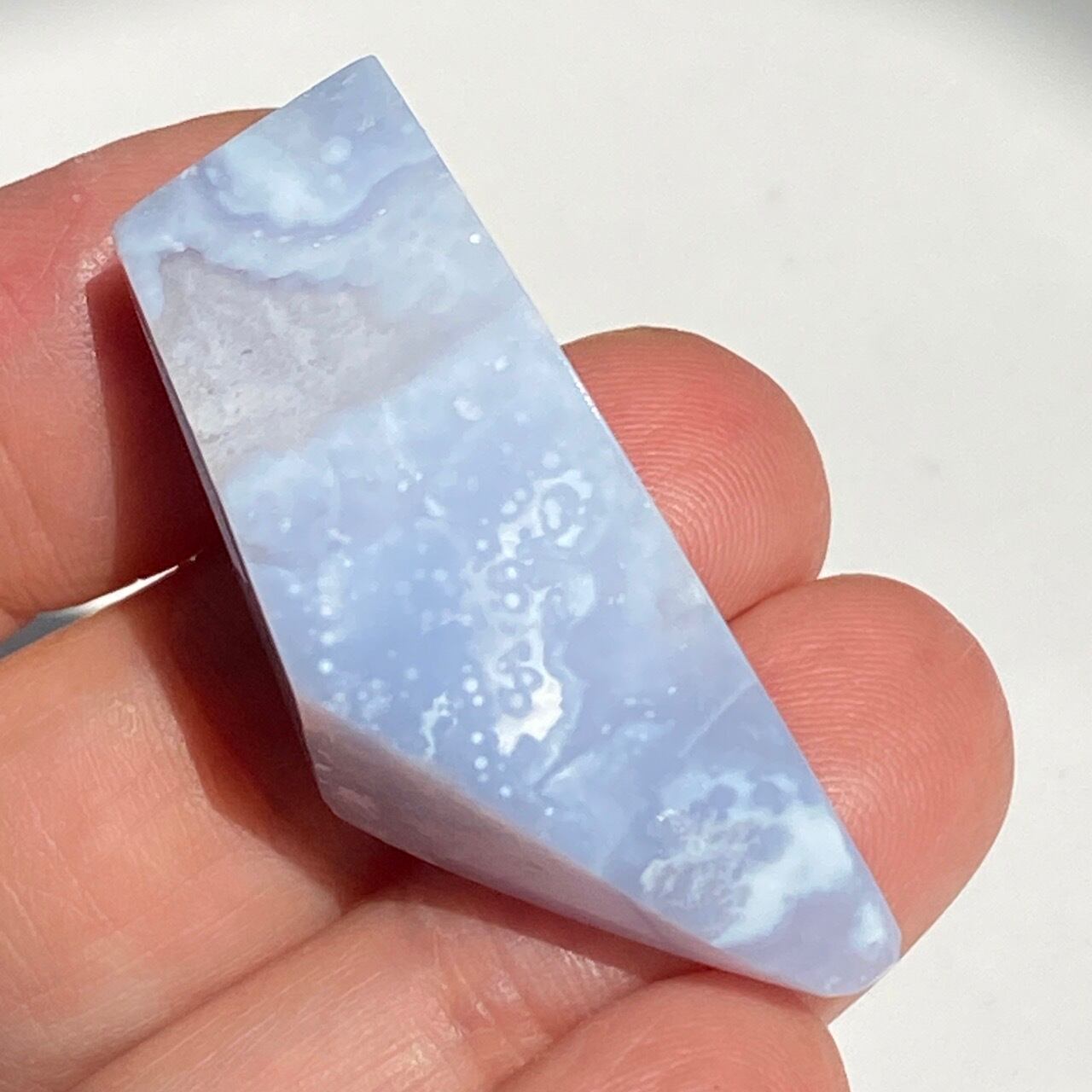 ブルーレースアゲート(和名:空色縞瑪瑙)のドゥルージー入りミニフリーフォームアソート3個セットなります。美しいバンディングと柔らかな煌めきを放つドゥルージー、そして心を穏やかにさせてくれる澄んだライトブルーが美しい子達です。アゲートの中でも算出量が少なく、世界中に愛好家がいるため、サイズが小さくても高値で取引されています。