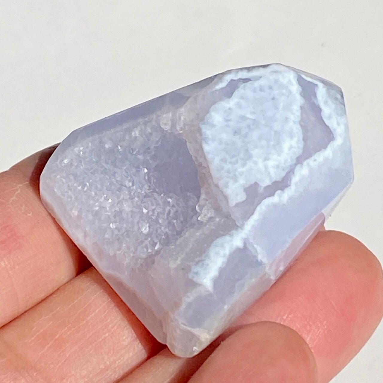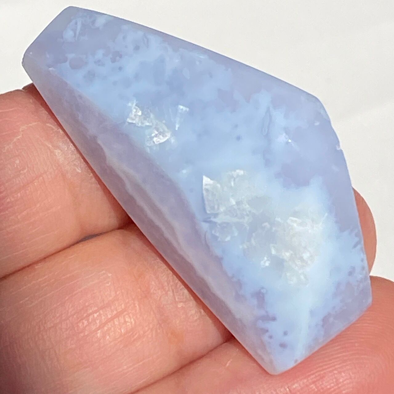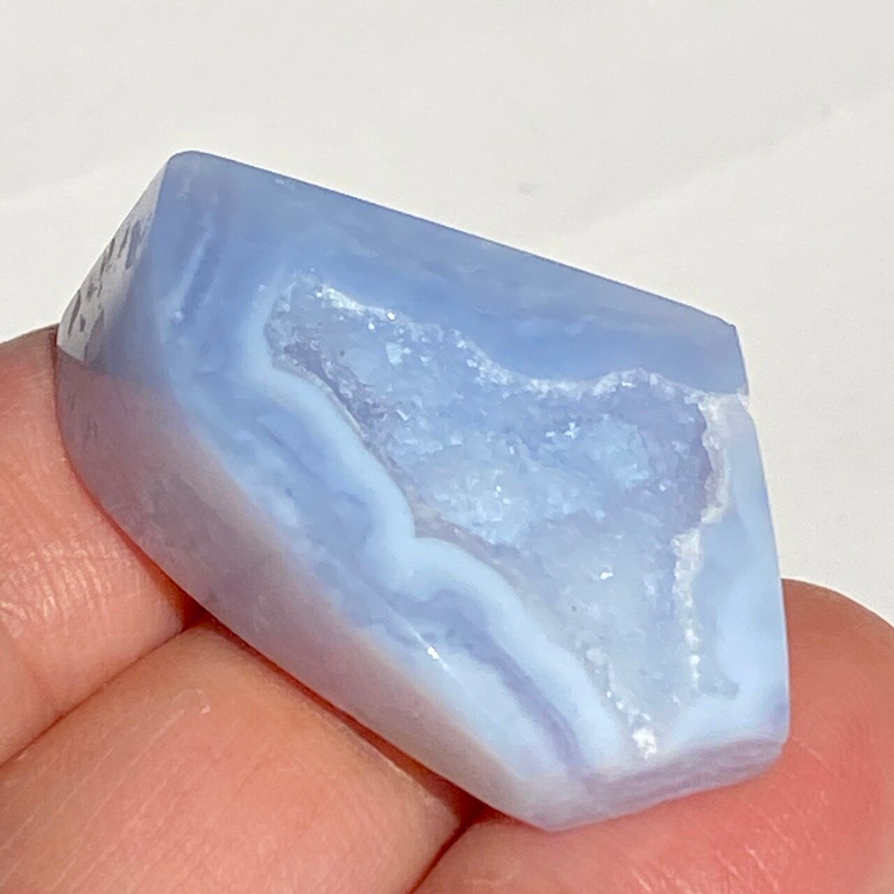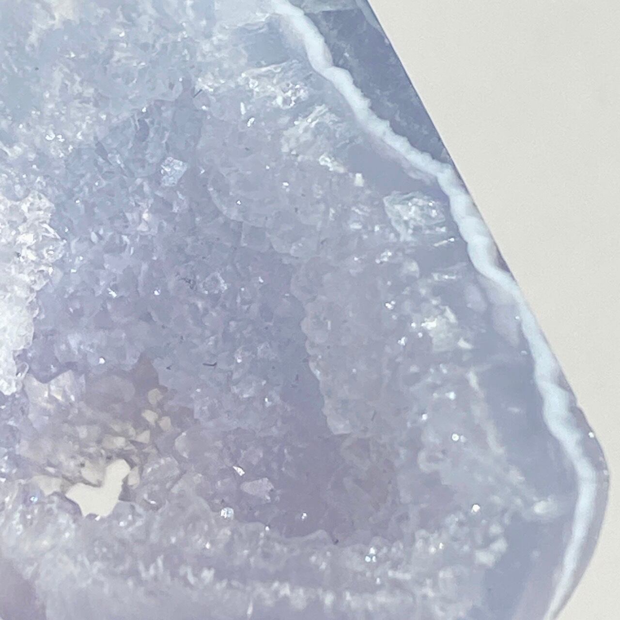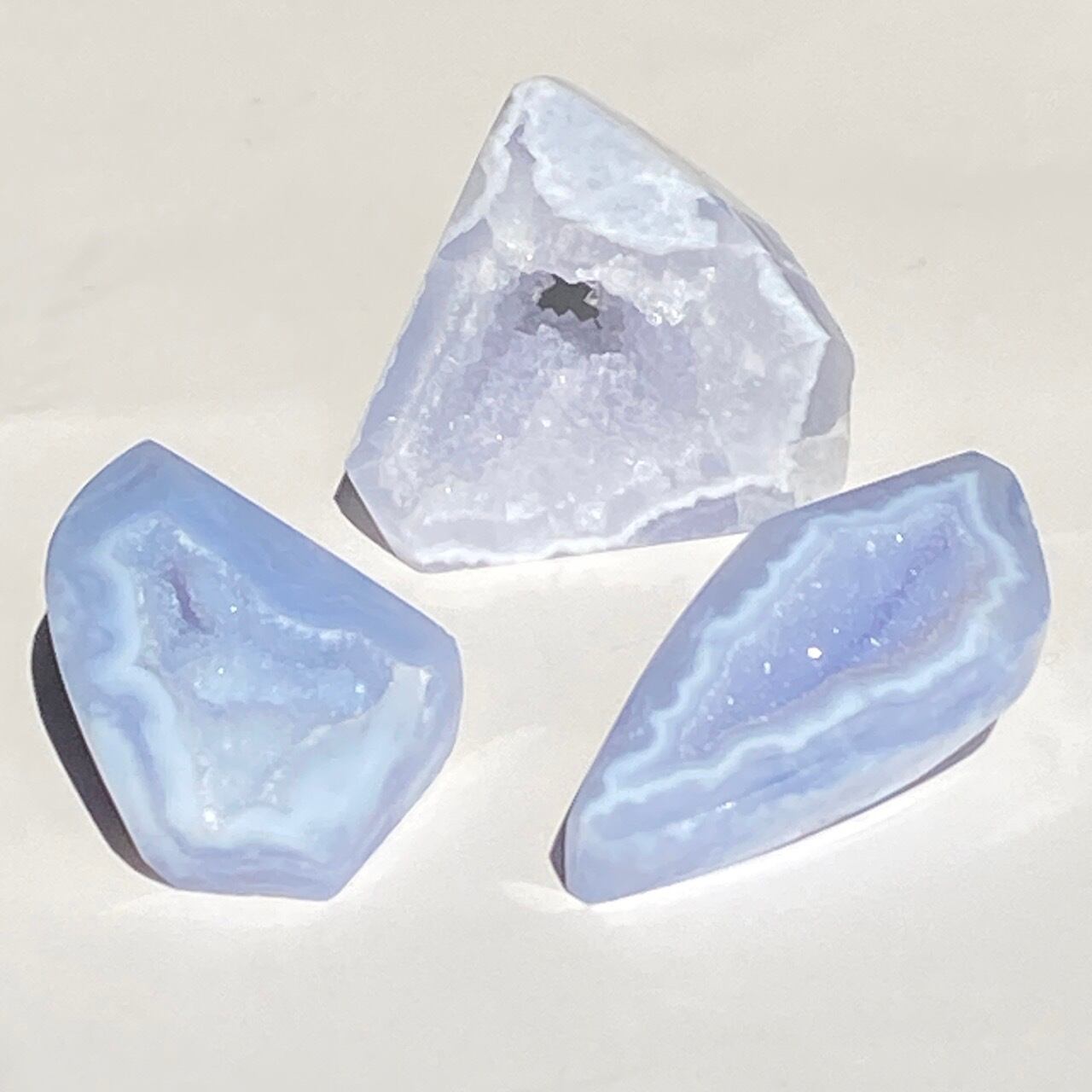 ブルーレースアゲート(和名:空色縞瑪瑙)のドゥルージー入りミニフリーフォームアソート3個セットなります。美しいバンディングと柔らかな煌めきを放つドゥルージー、そして心を穏やかにさせてくれる澄んだライトブルーが美しい子達です。アゲートの中でも算出量が少なく、世界中に愛好家がいるため、サイズが小さくても高値で取引されています。
