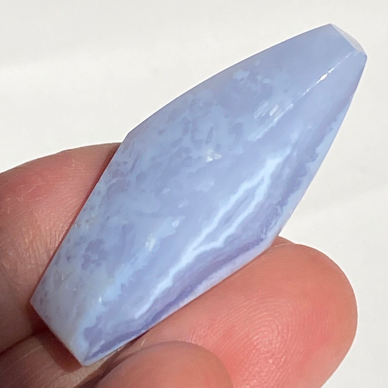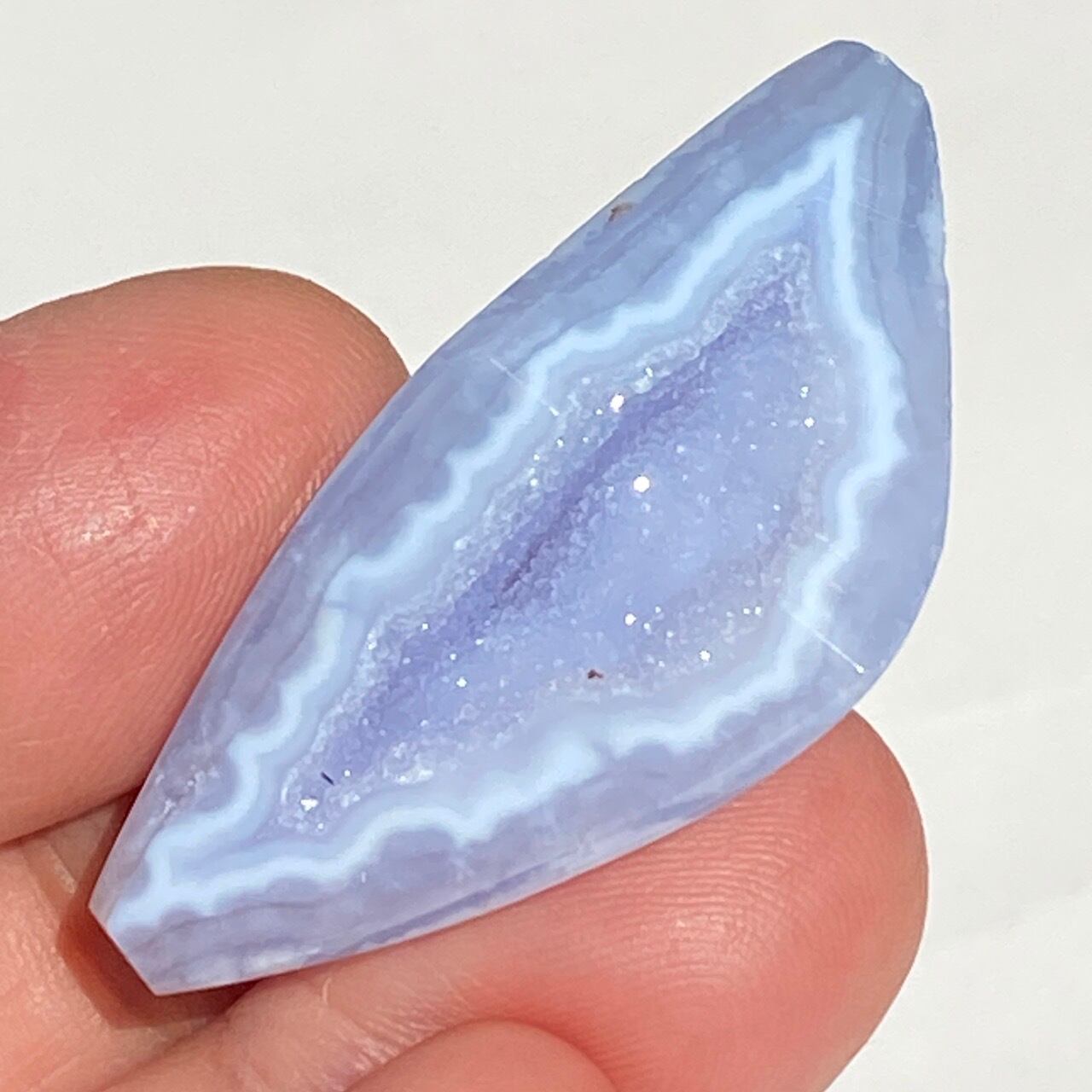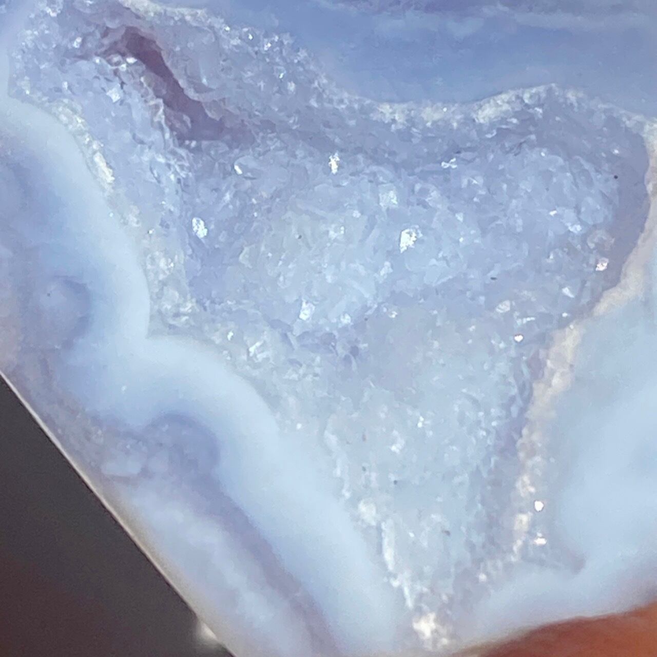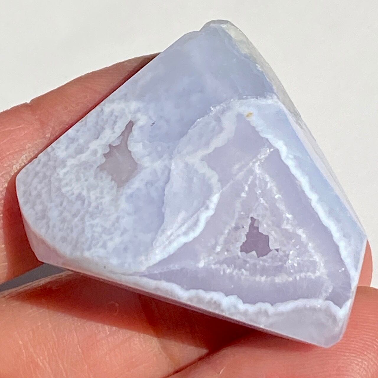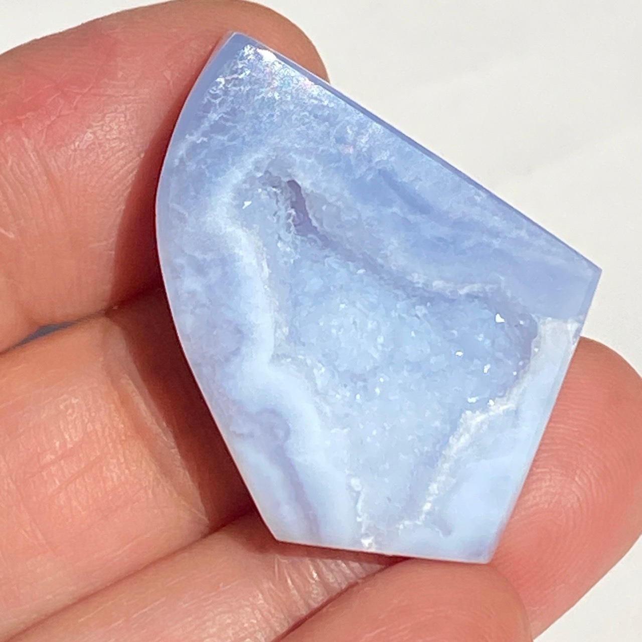 ブルーレースアゲート(和名:空色縞瑪瑙)のドゥルージー入りミニフリーフォームアソート3個セットなります。美しいバンディングと柔らかな煌めきを放つドゥルージー、そして心を穏やかにさせてくれる澄んだライトブルーが美しい子達です。アゲートの中でも算出量が少なく、世界中に愛好家がいるため、サイズが小さくても高値で取引されています。