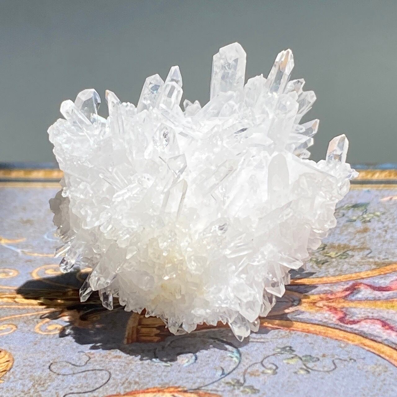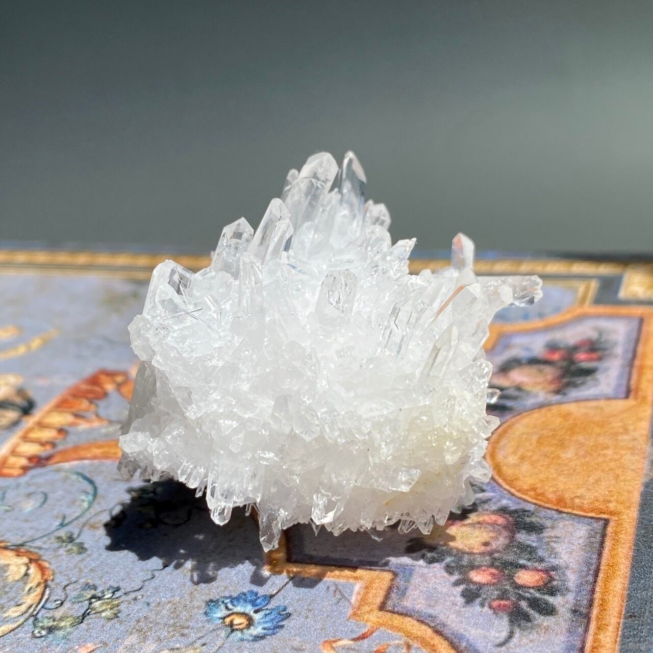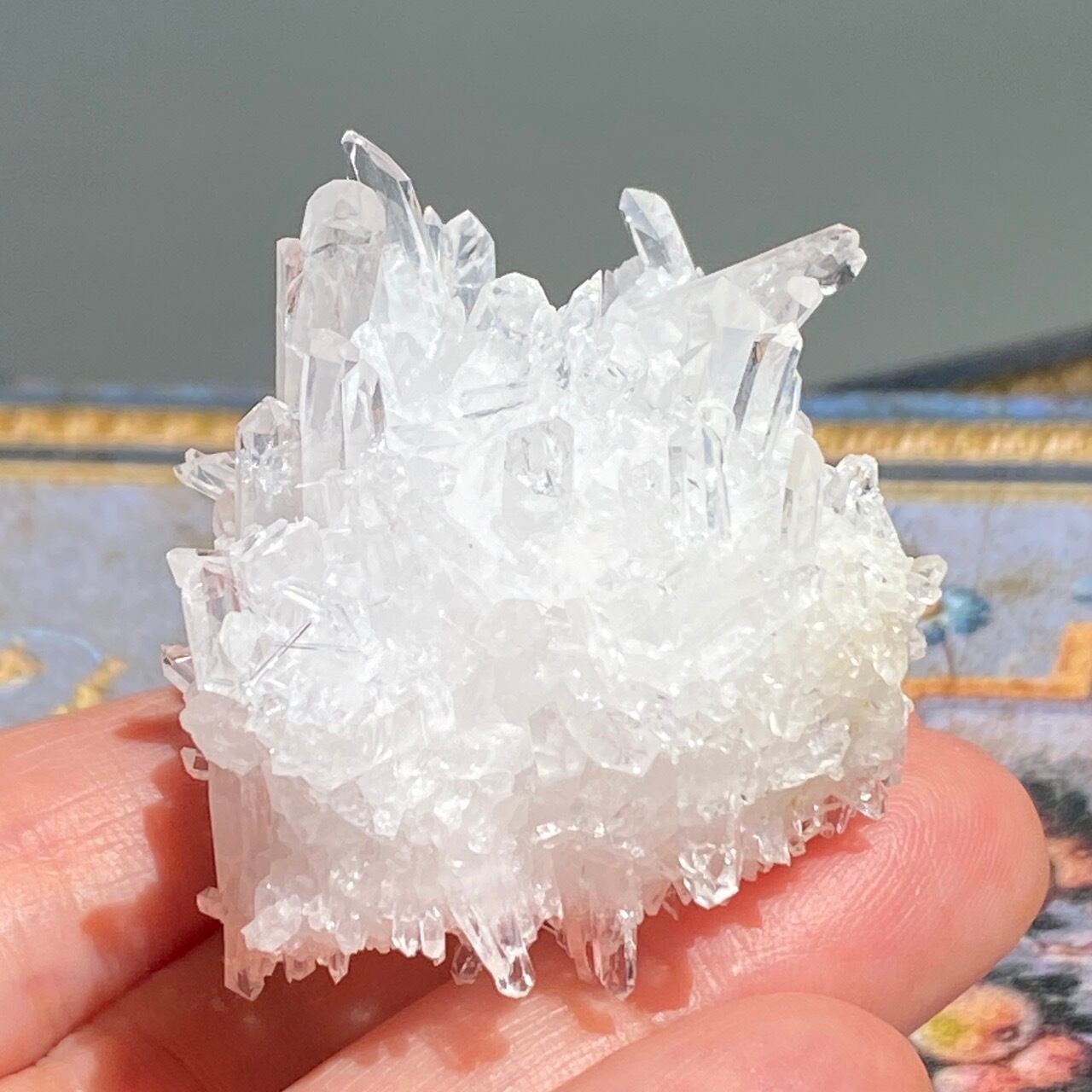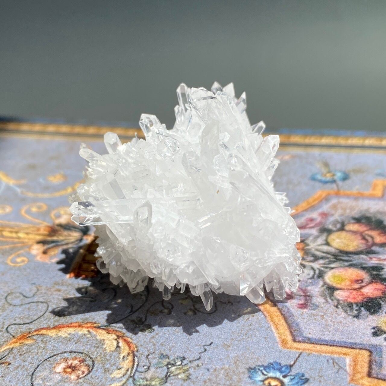 氷の様な清涼感と非常に繊細な極細ポイントが可愛い、ピュアホワイトのプチサイズ水晶クラスターになります。ちょこんと座った姿が愛おしいです。