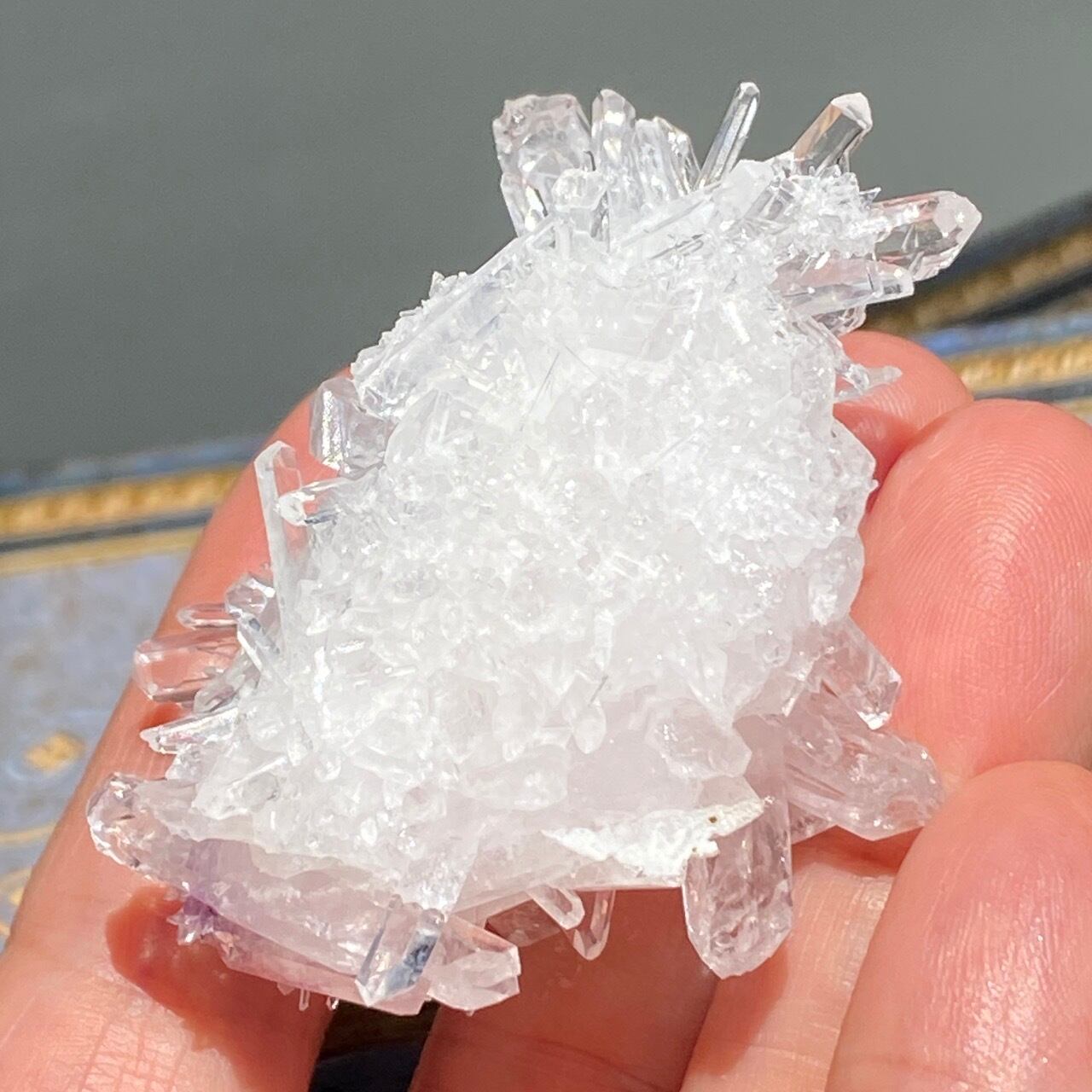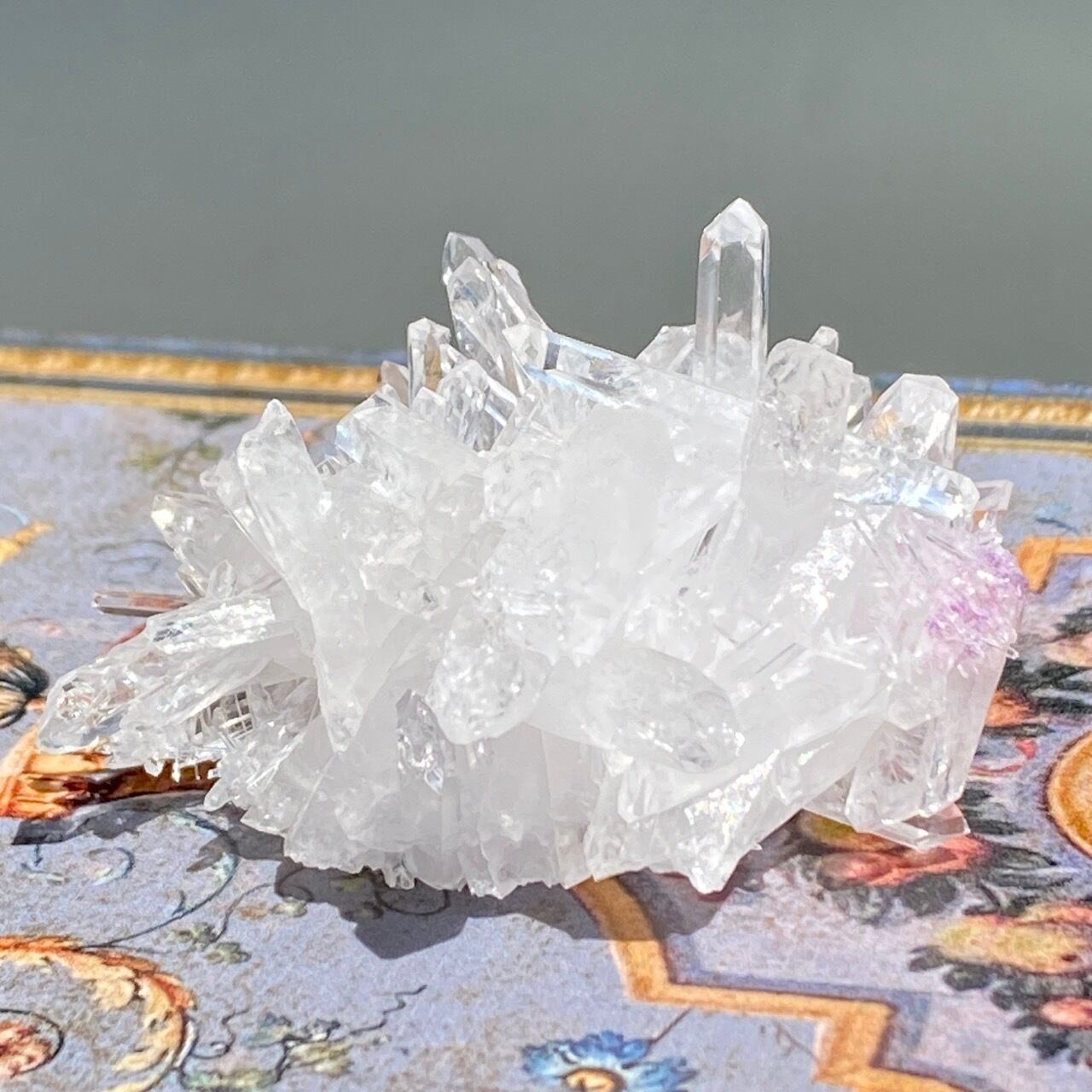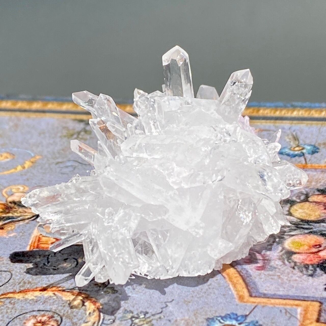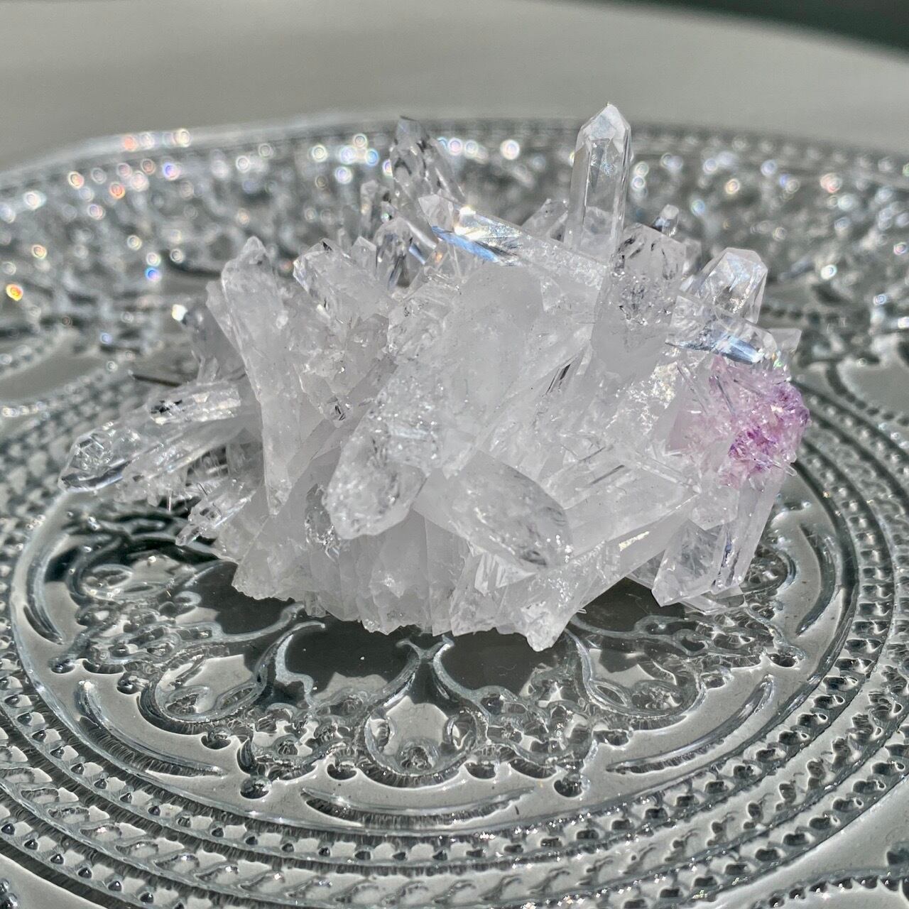 氷の様な清涼感と非常に繊細な極細ポイントが可愛い、ピュアホワイトのプチサイズ水晶クラスターになります。ちょこんと座った姿が愛おしいです。