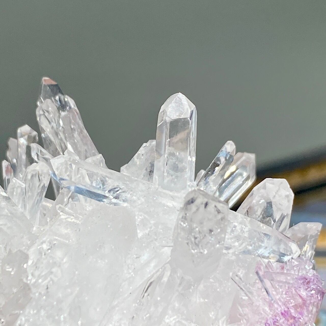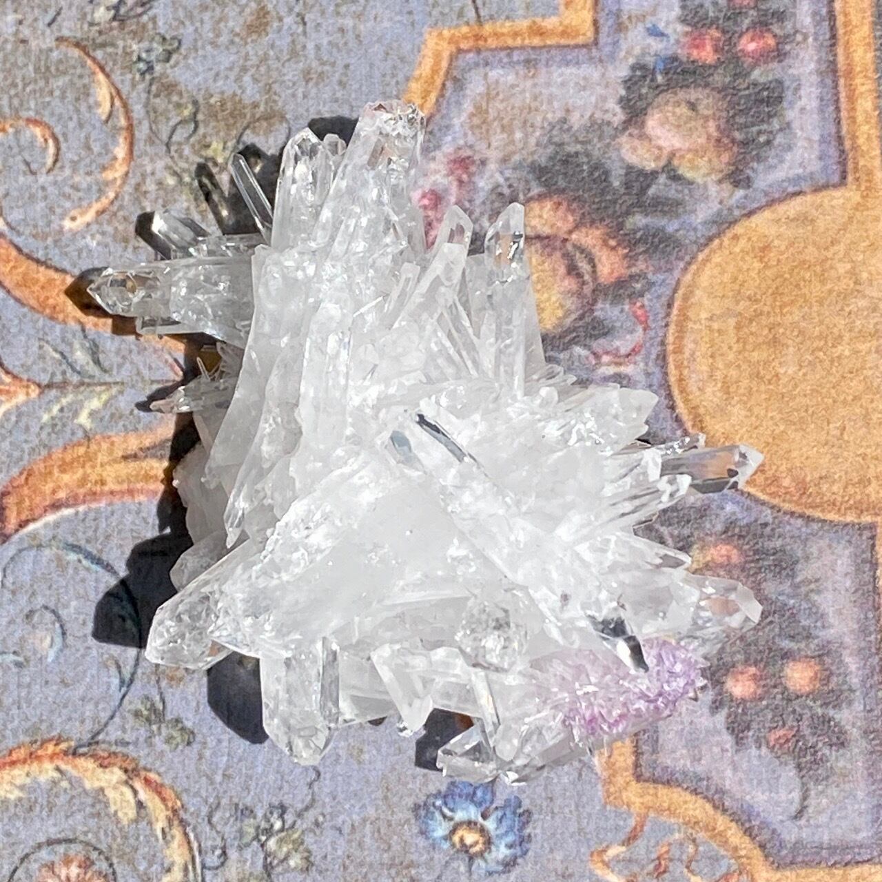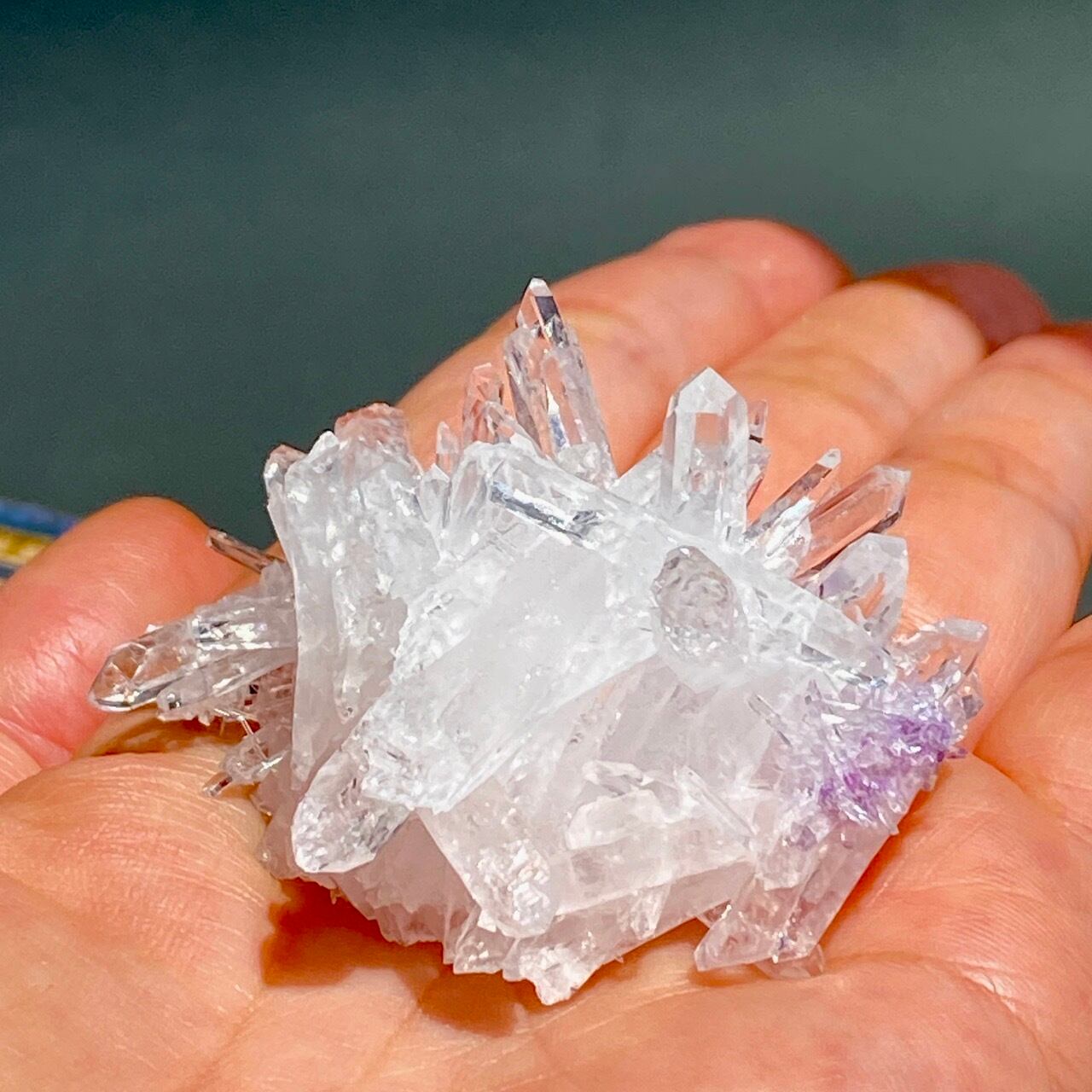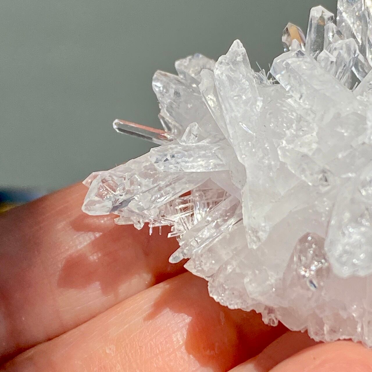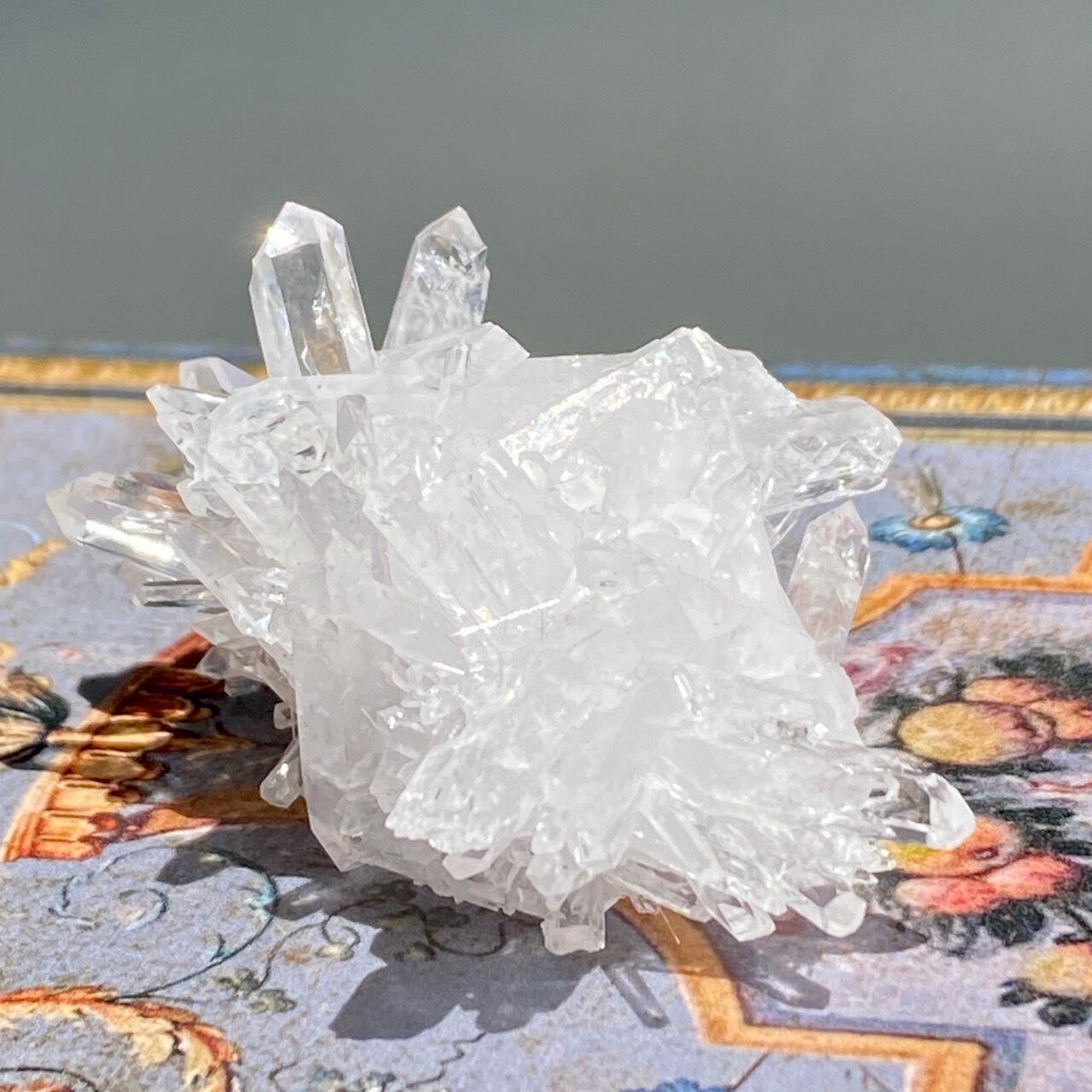 氷の様な清涼感と非常に繊細な極細ポイントが可愛い、ピュアホワイトのプチサイズ水晶クラスターになります。ちょこんと座った姿が愛おしいです。
