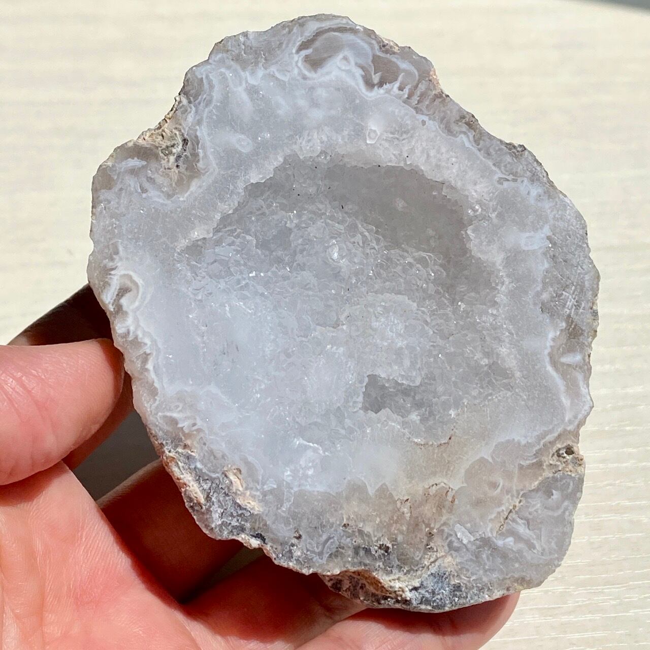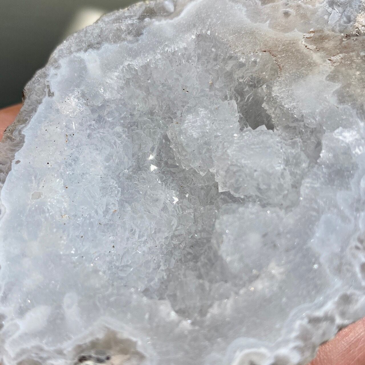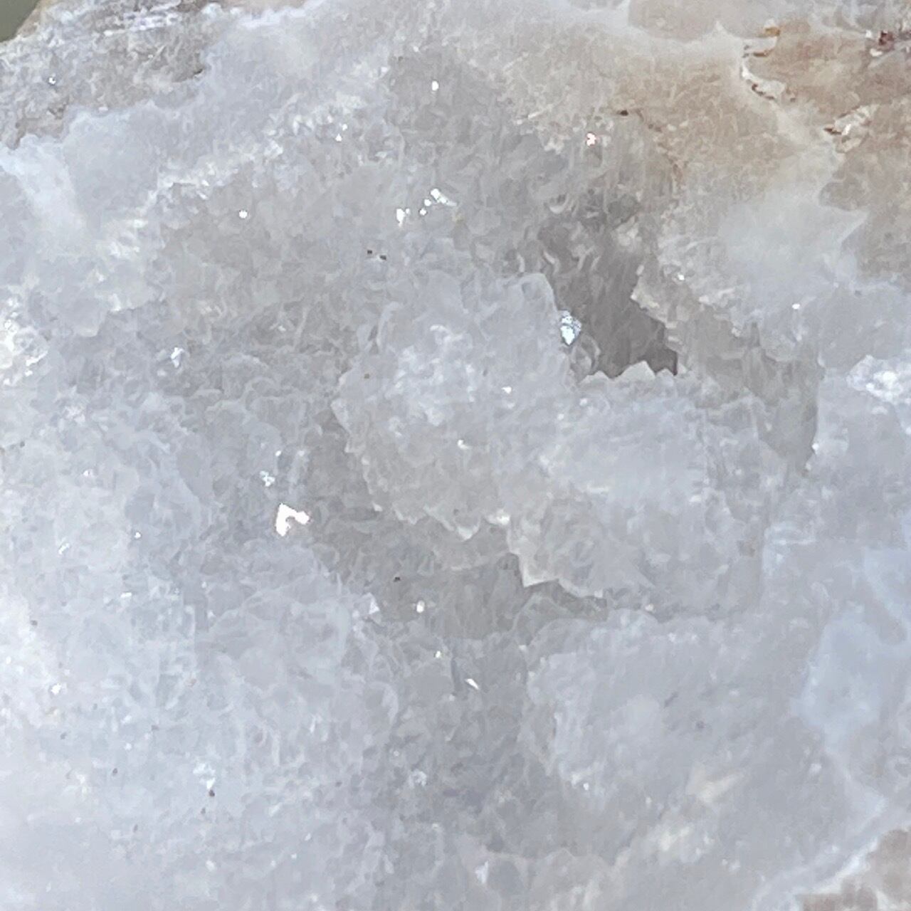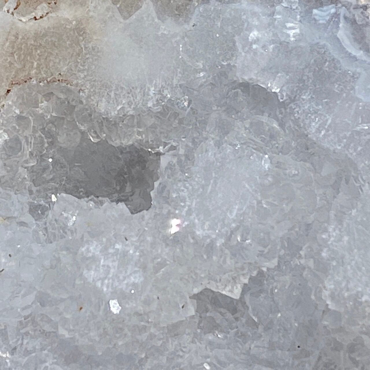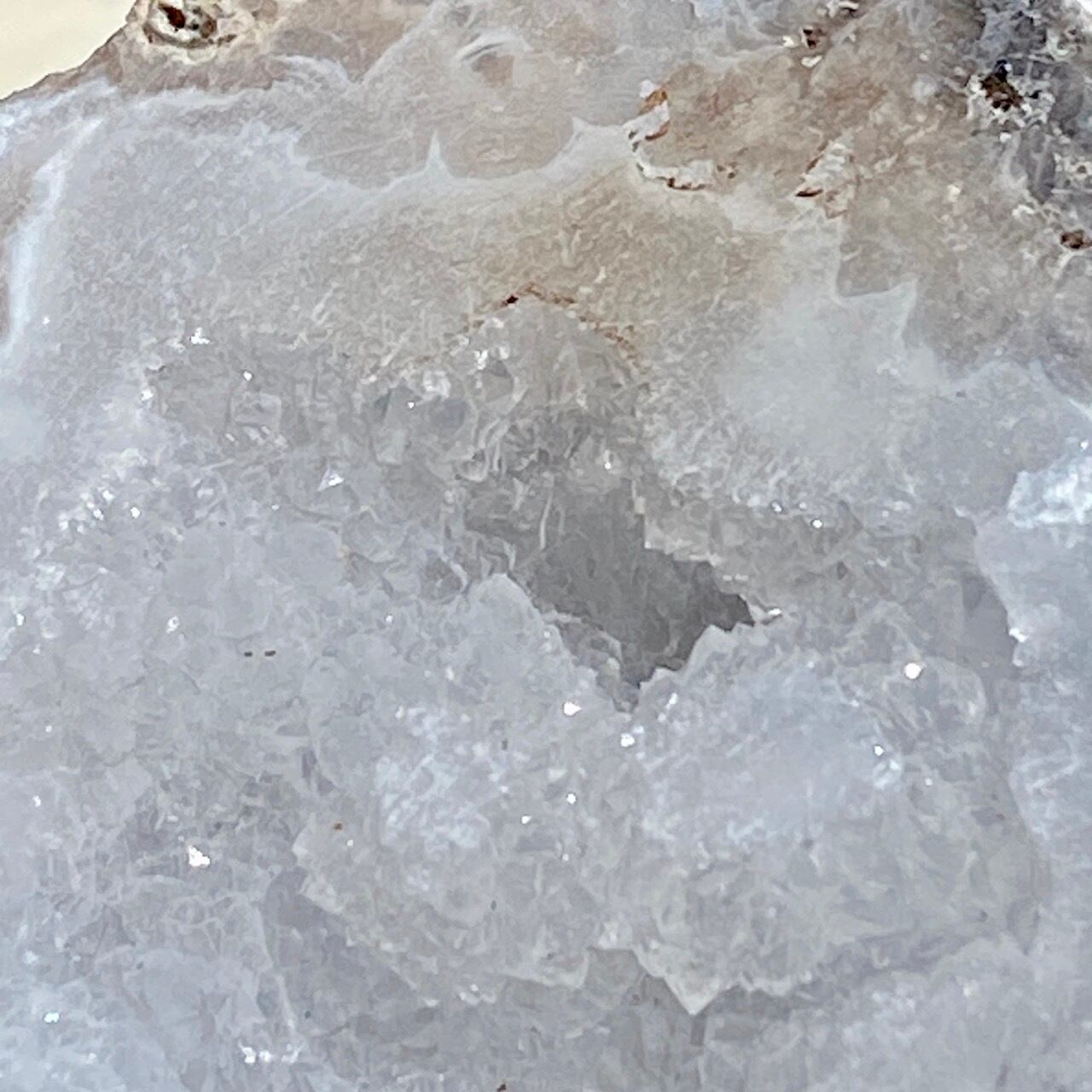 開口部には砂糖菓子のようなクォーツのドゥルージーが顔を覗かせており、氷を思わせるようなころころしたクラスターが可愛い子です。氷を思わせるような涼しげな見た目です。