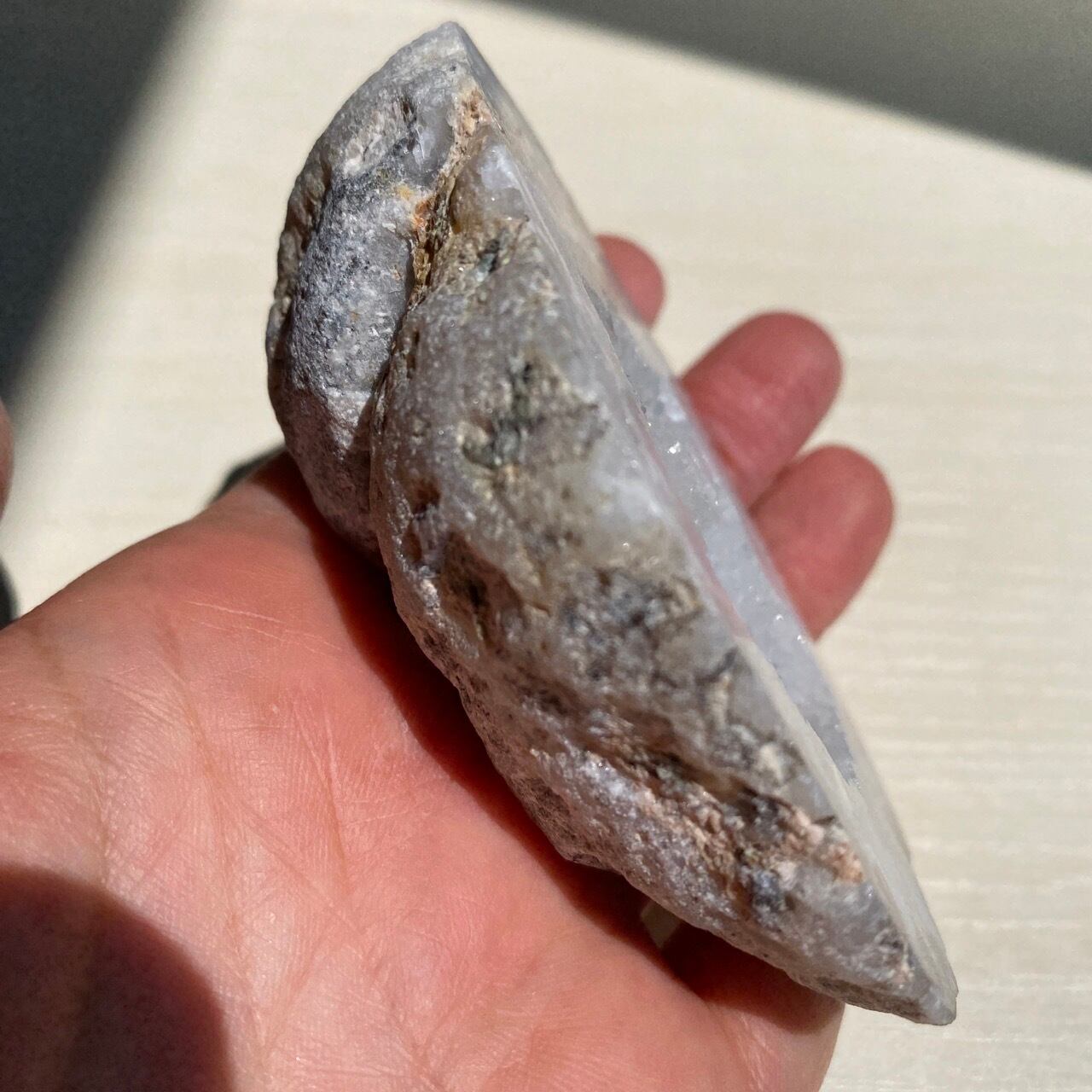 カットされたアゲート表面部分は研磨されていますが、外側の母岩は天然そのままで、研磨されていません。
