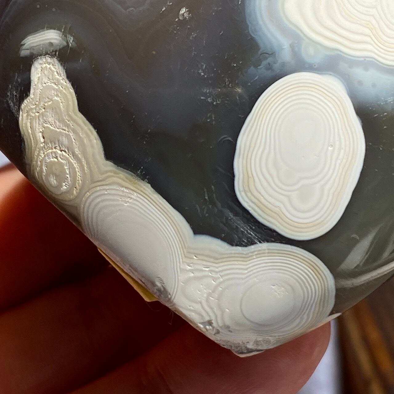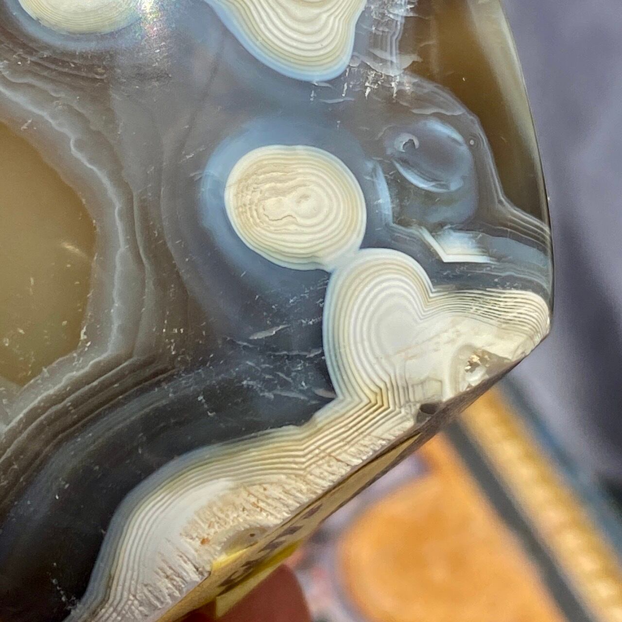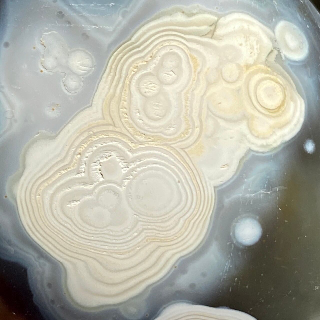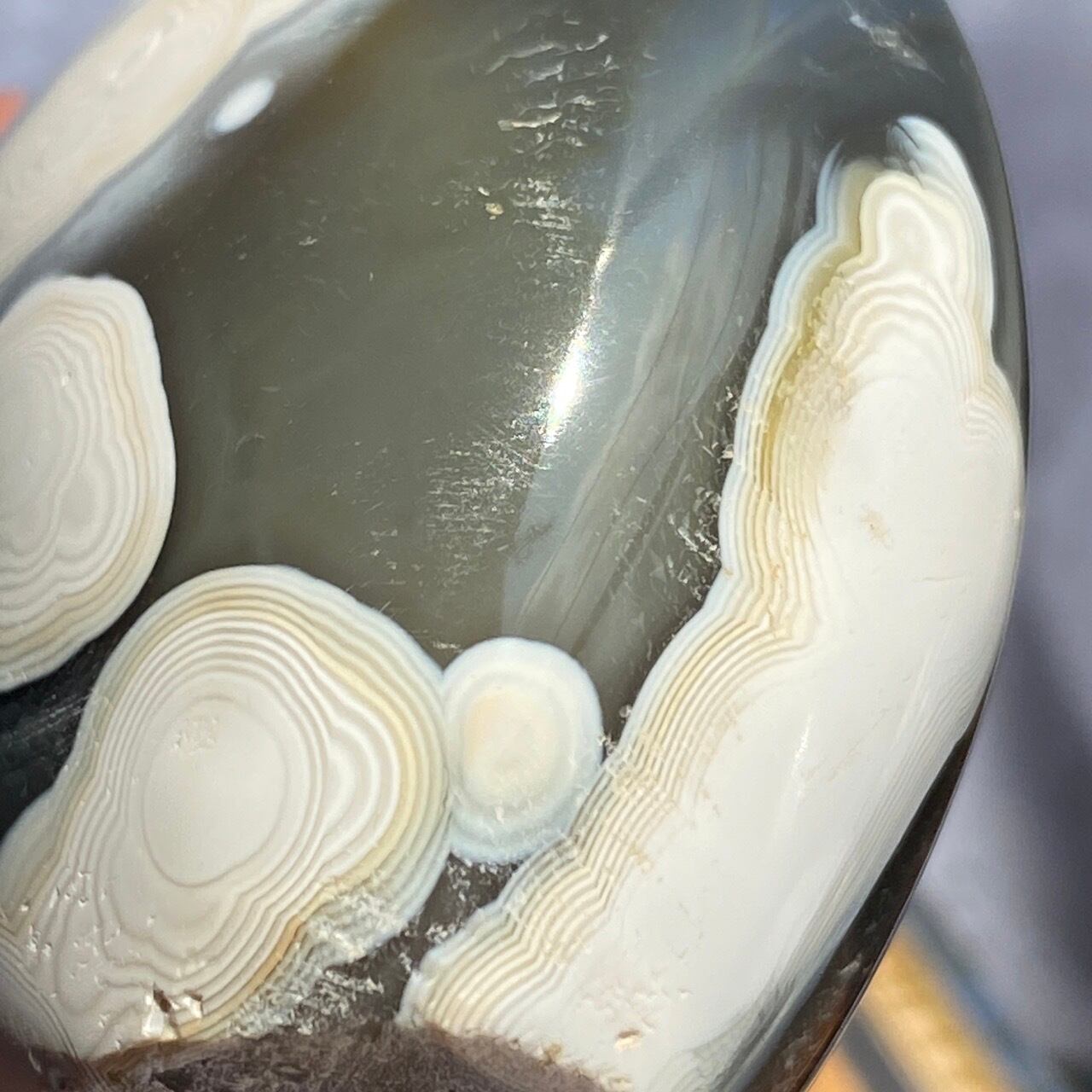 、そのうちのいくつかには、角度を変えるとのような、神秘的な模様が見られます。これを発見したときはその素晴らしさに感動して心臓がバクバクしました。アゲート特有のバンディングも見られる店主おすすめの子です。