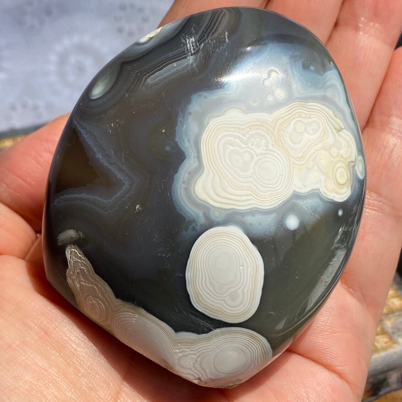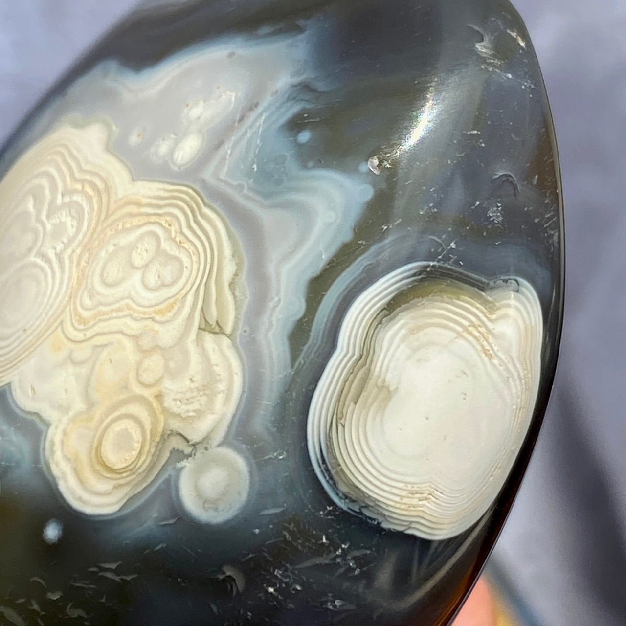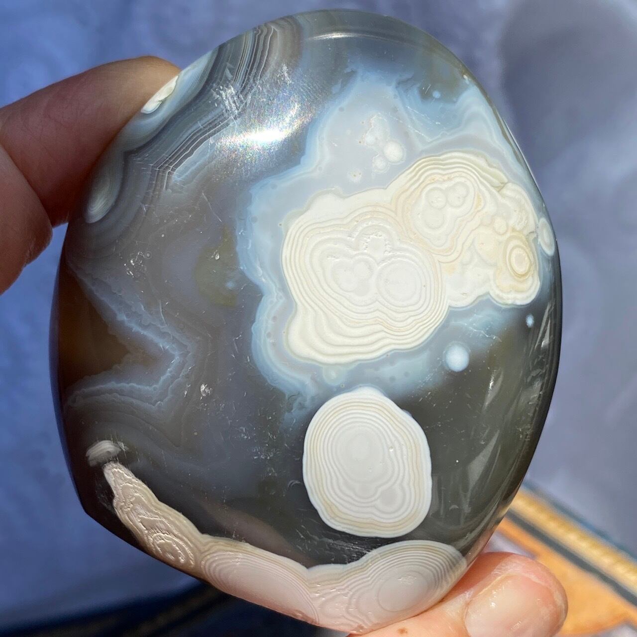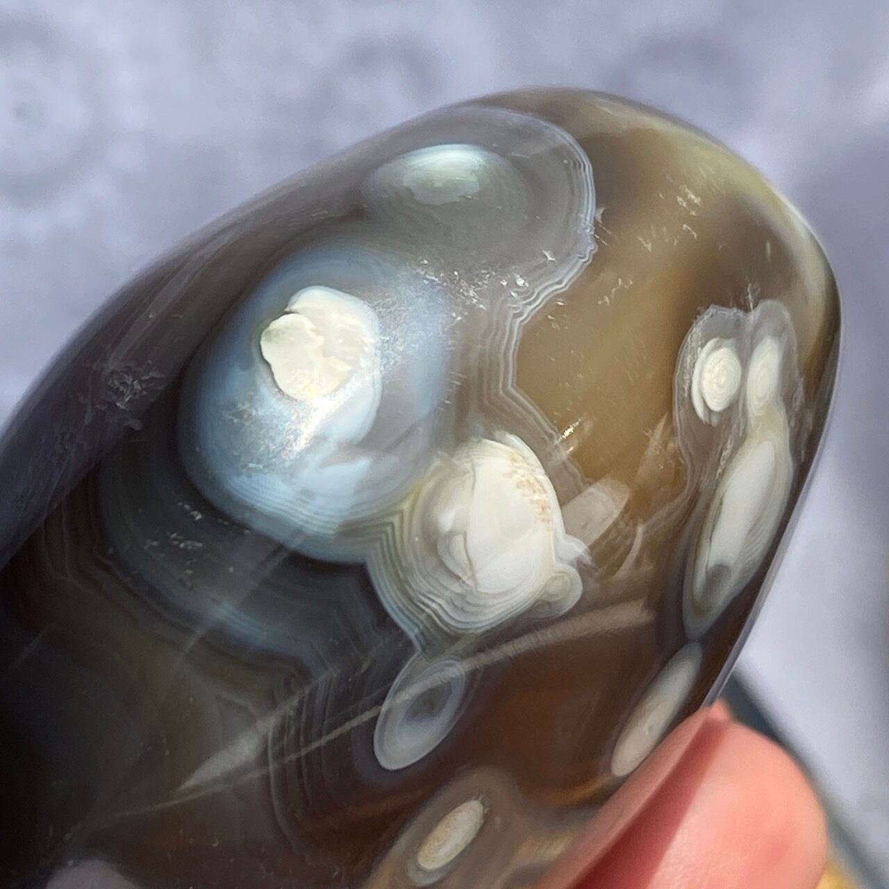 、そのうちのいくつかには、角度を変えるとのような、神秘的な模様が見られます。これを発見したときはその素晴らしさに感動して心臓がバクバクしました。アゲート特有のバンディングも見られる店主おすすめの子です。