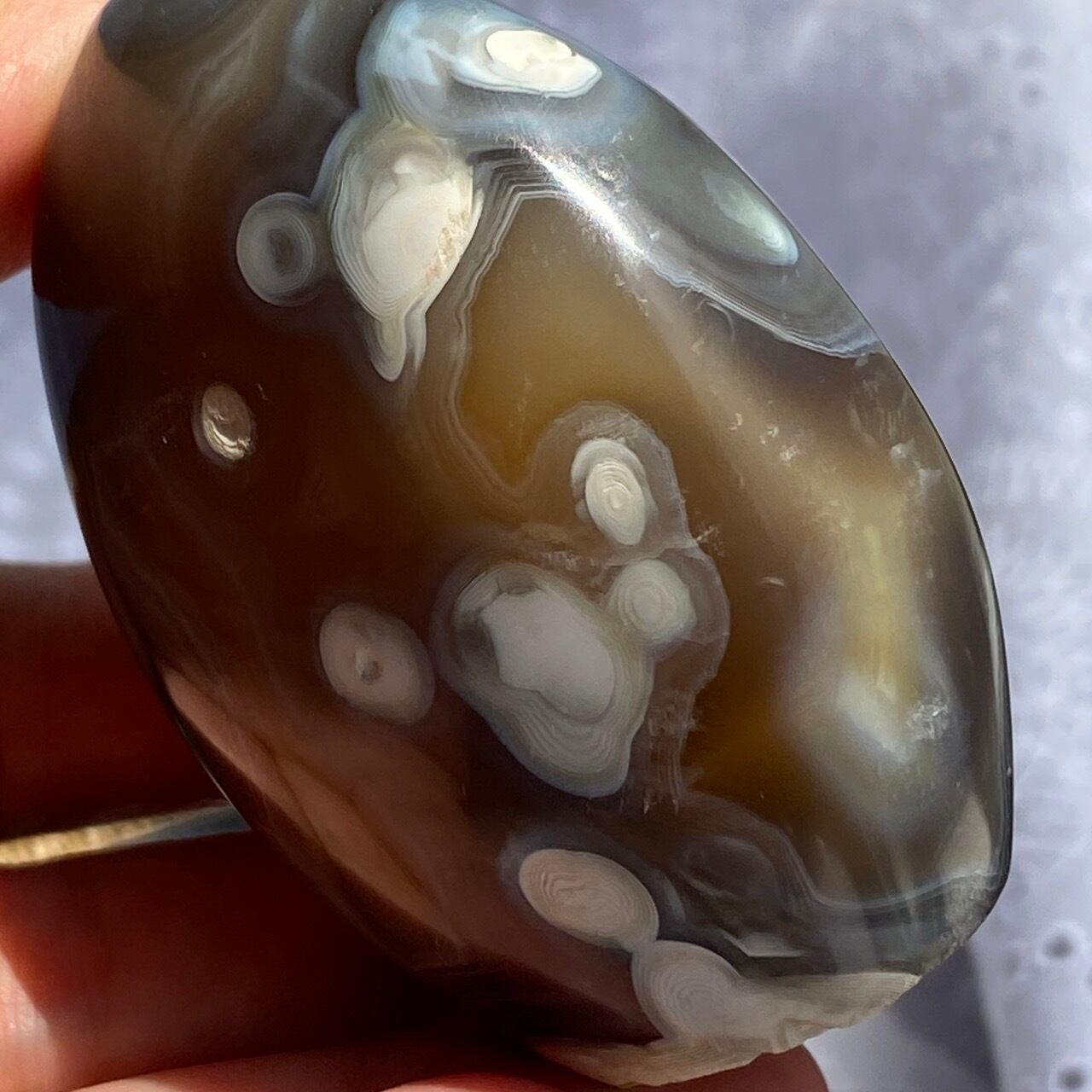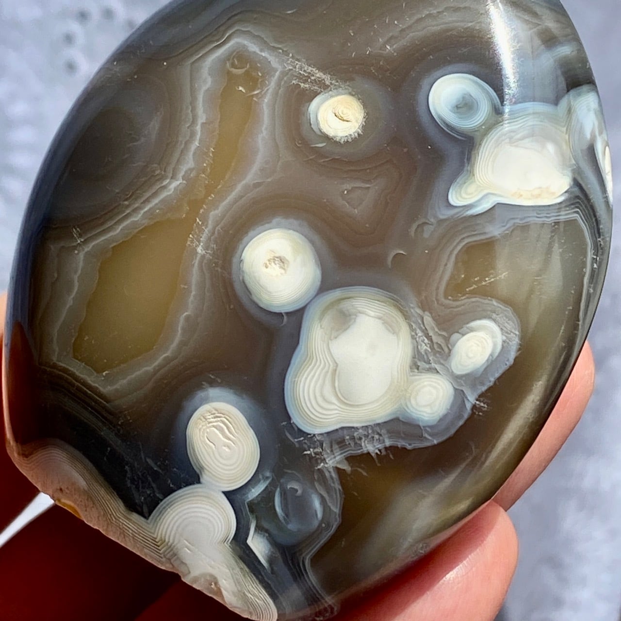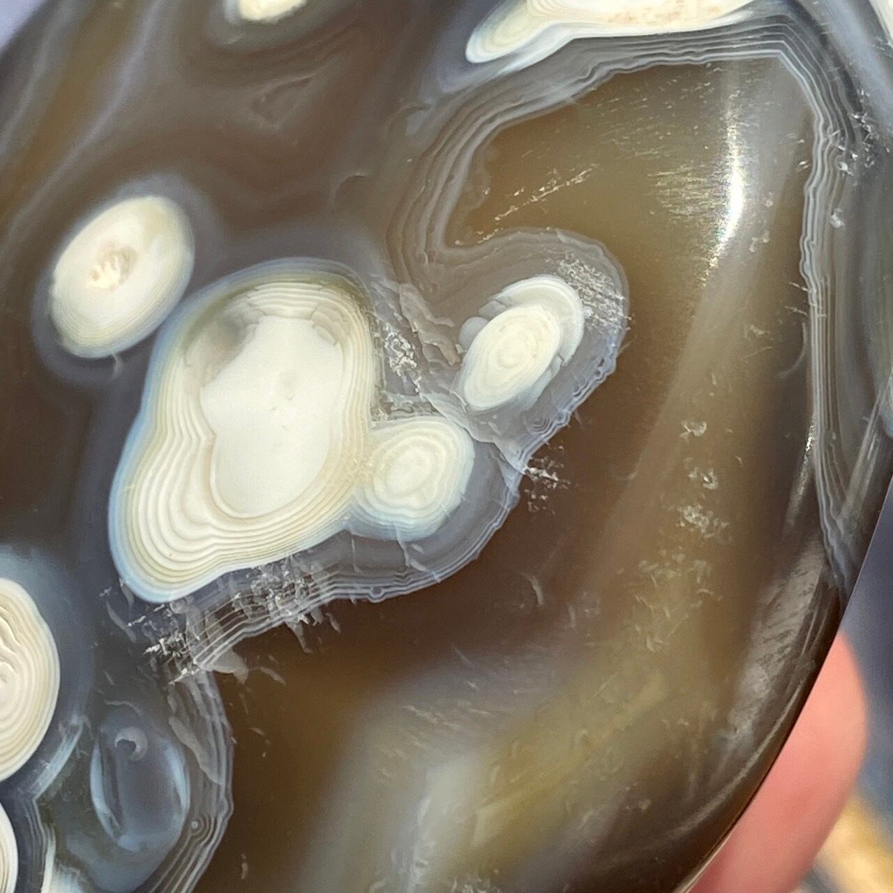 この非常に個性的な子には、芸術作品のタイトルとして、『泡(あぶく)』が相応しいかと思います。あぶくが両面に配されており、角度を変えるとその内のいくつかに波紋の様な同色のバンディングが見られ(例:11枚目画像掲載)、最初この神秘のアートを発見した時には驚きと感動で震えました。アゲート特有のバンディング模様も入っており、お部屋を彩る、唯一無二のアートとしてお迎えいただければと思います。