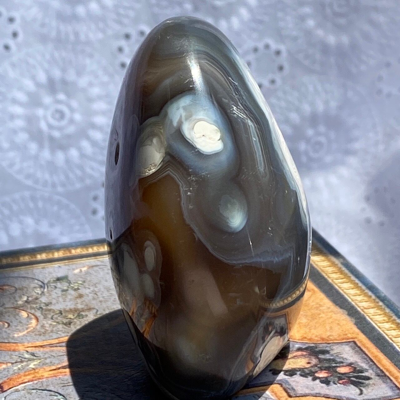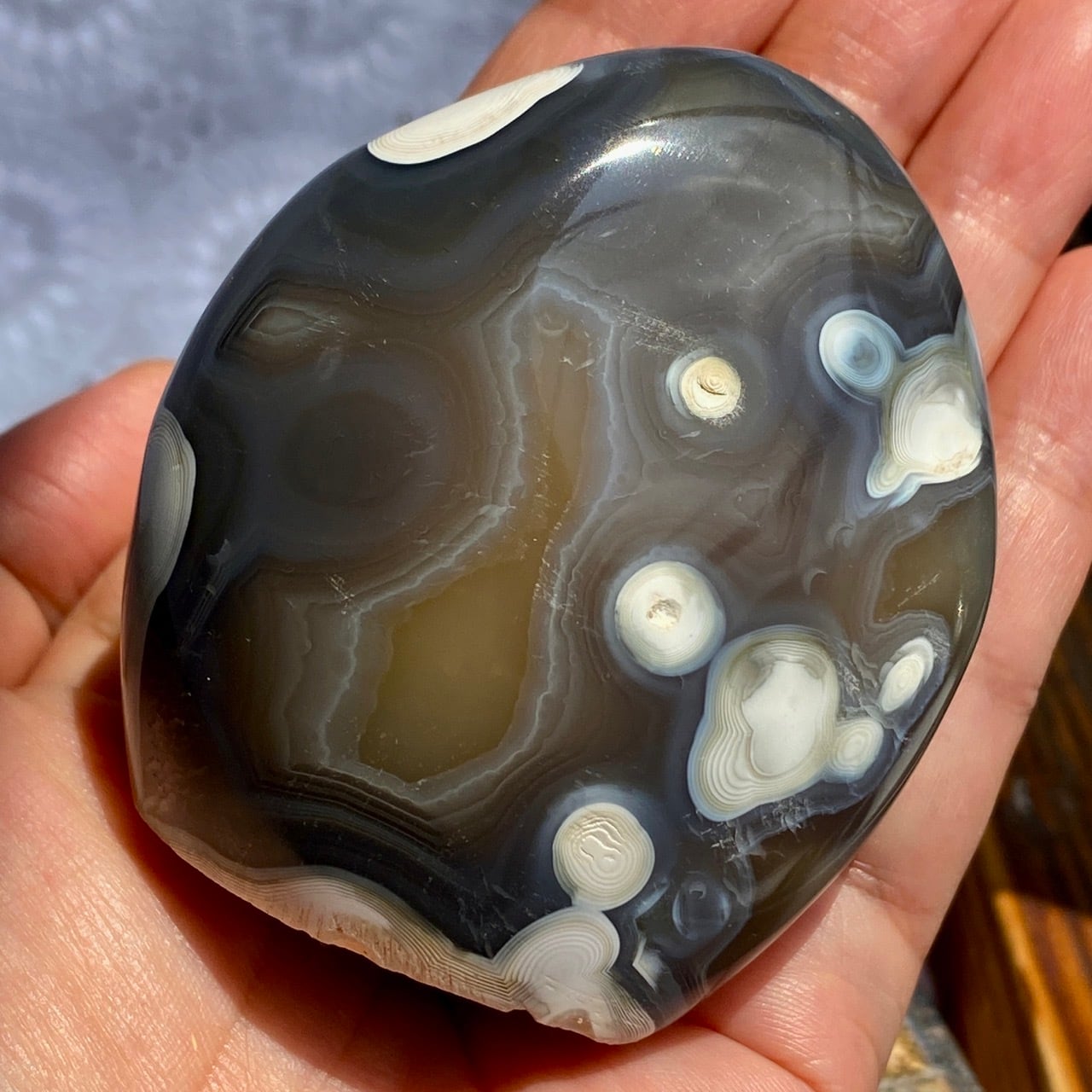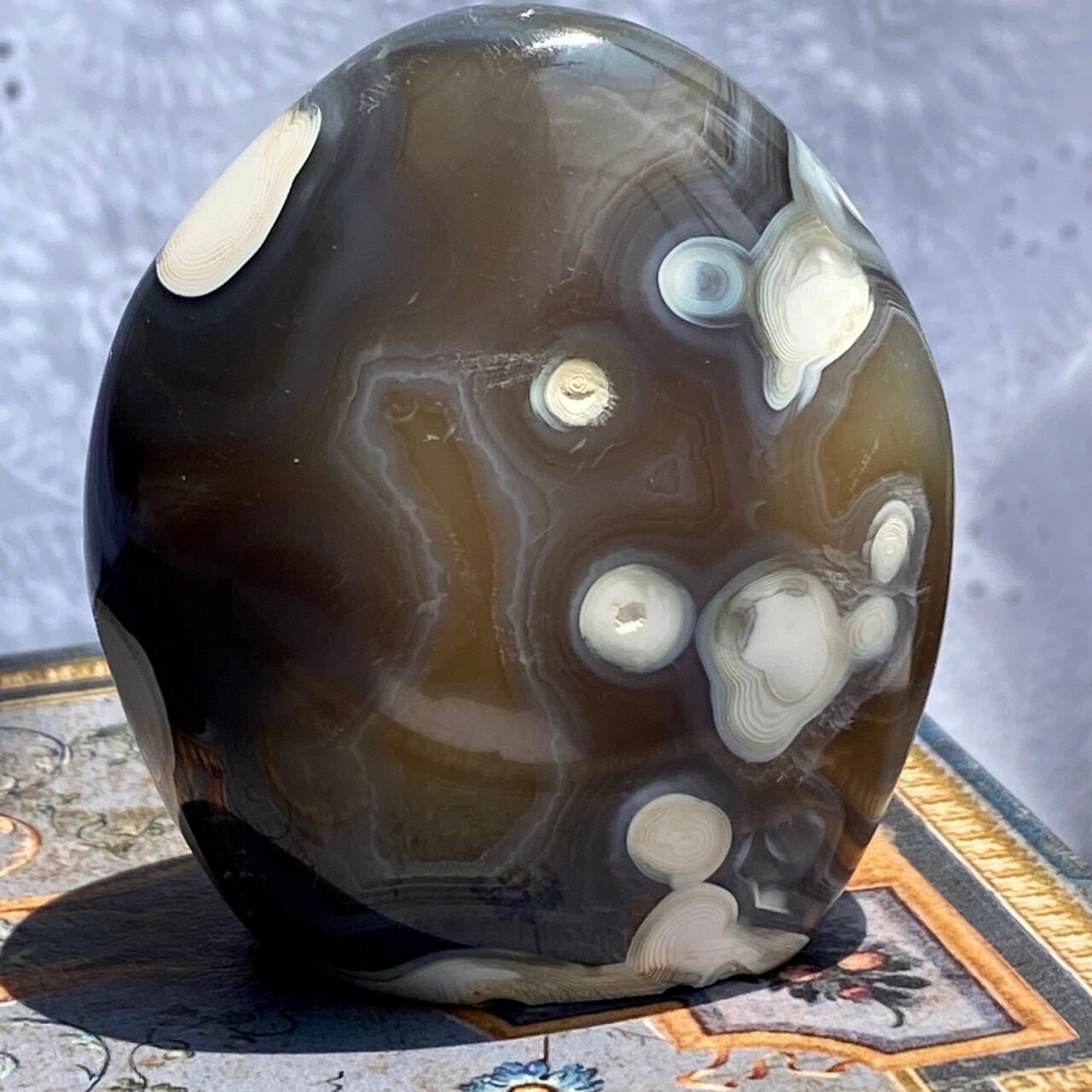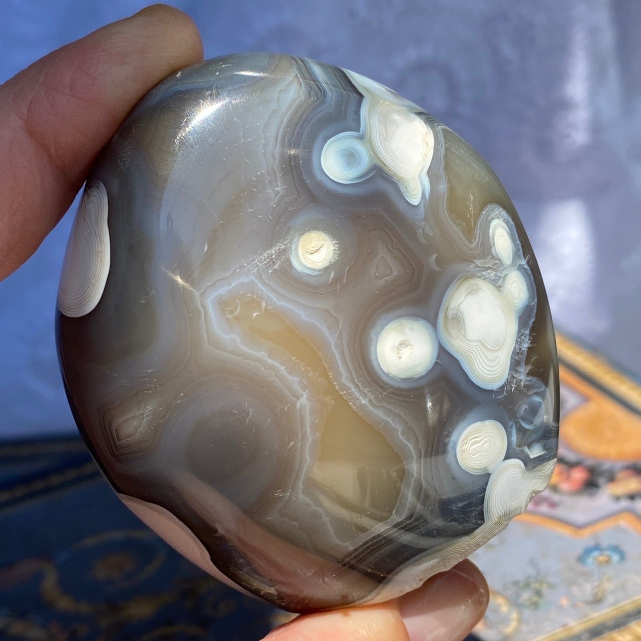 この非常に個性的な子には、芸術作品のタイトルとして、『泡(あぶく)』が相応しいかと思います。あぶくが両面に配されており、角度を変えるとその内のいくつかに波紋の様な同色のバンディングが見られ(例:11枚目画像掲載)、最初この神秘のアートを発見した時には驚きと感動で震えました。アゲート特有のバンディング模様も入っており、お部屋を彩る、唯一無二のアートとしてお迎えいただければと思います。
