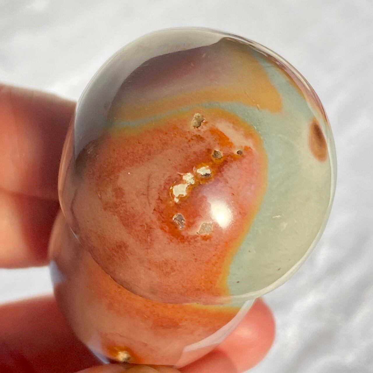 欧米で人気のある、パステルカラーが入ったポリクロームジャスパーのロットより選びました。この子も水色やピンクの濃淡、そして黄色などのカラーパレットから成ります。見る角度によって印象が変わるので、360度お楽しみいただけます。