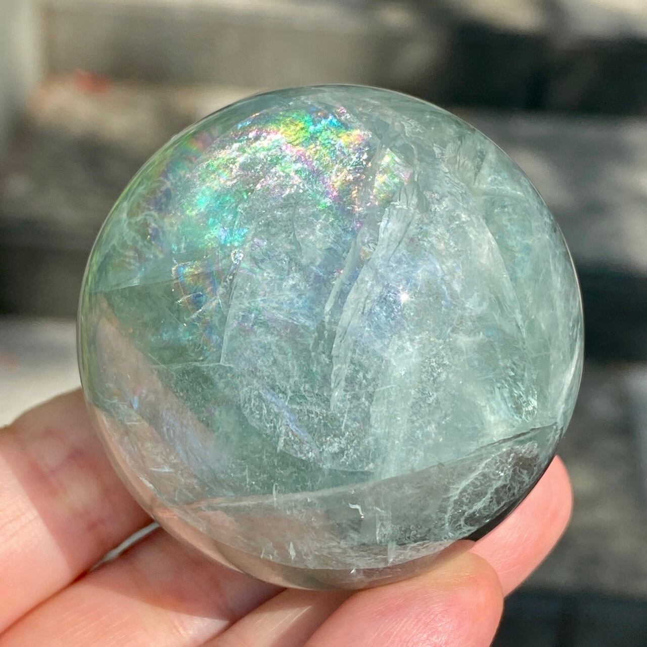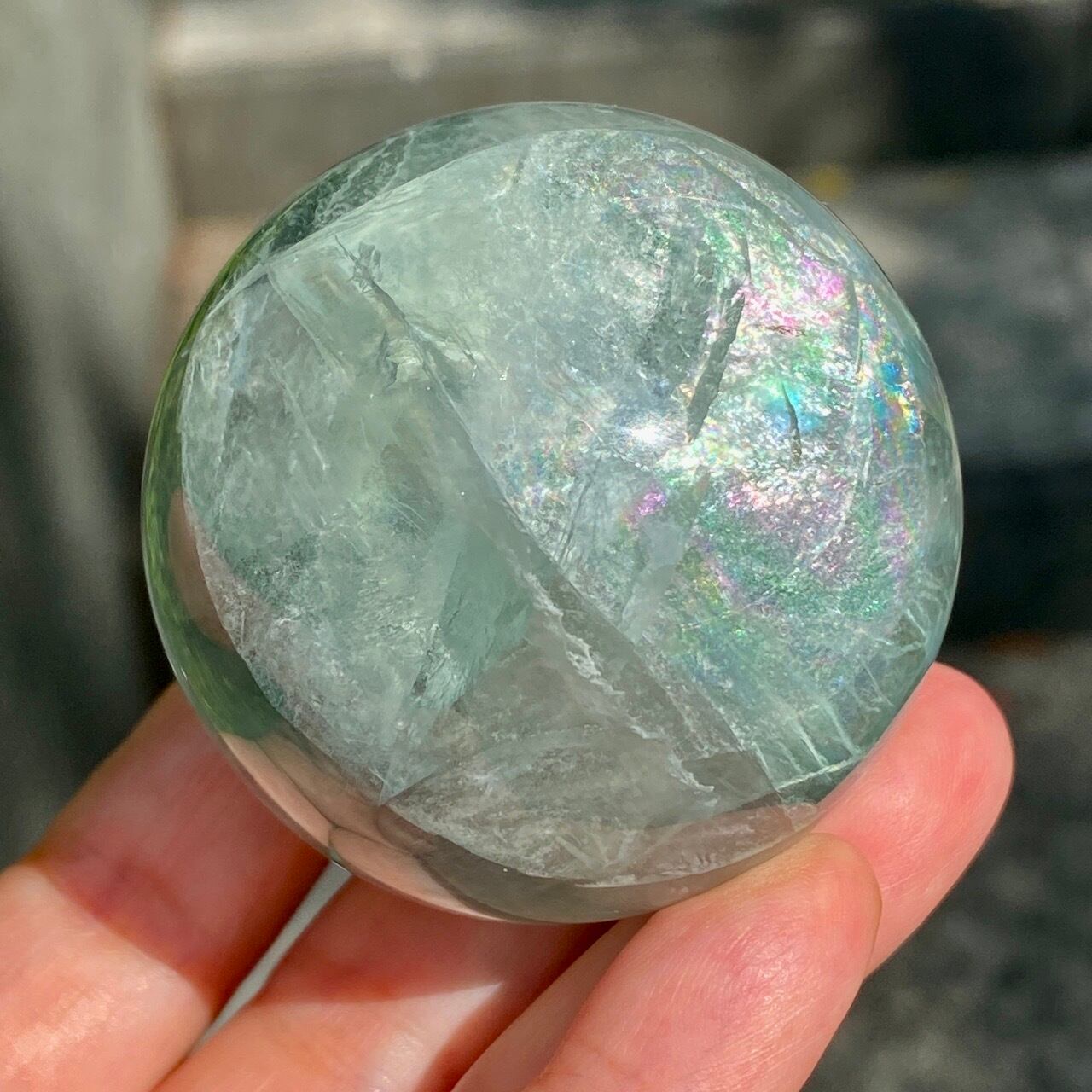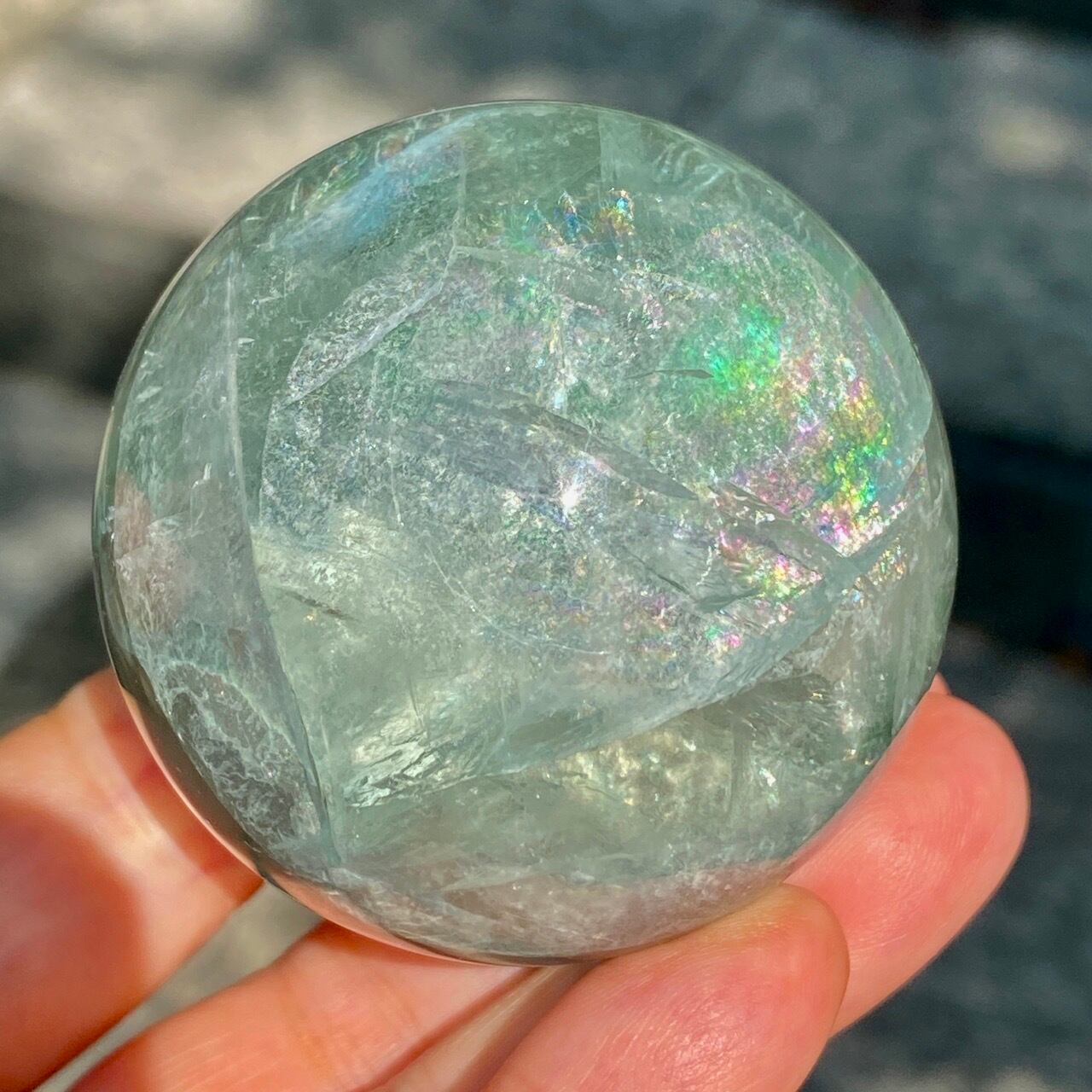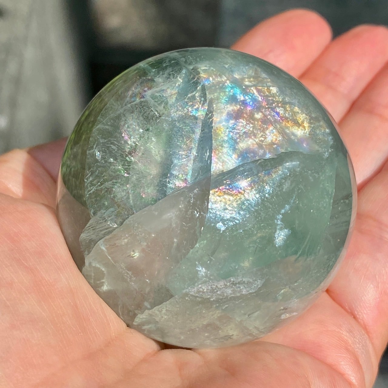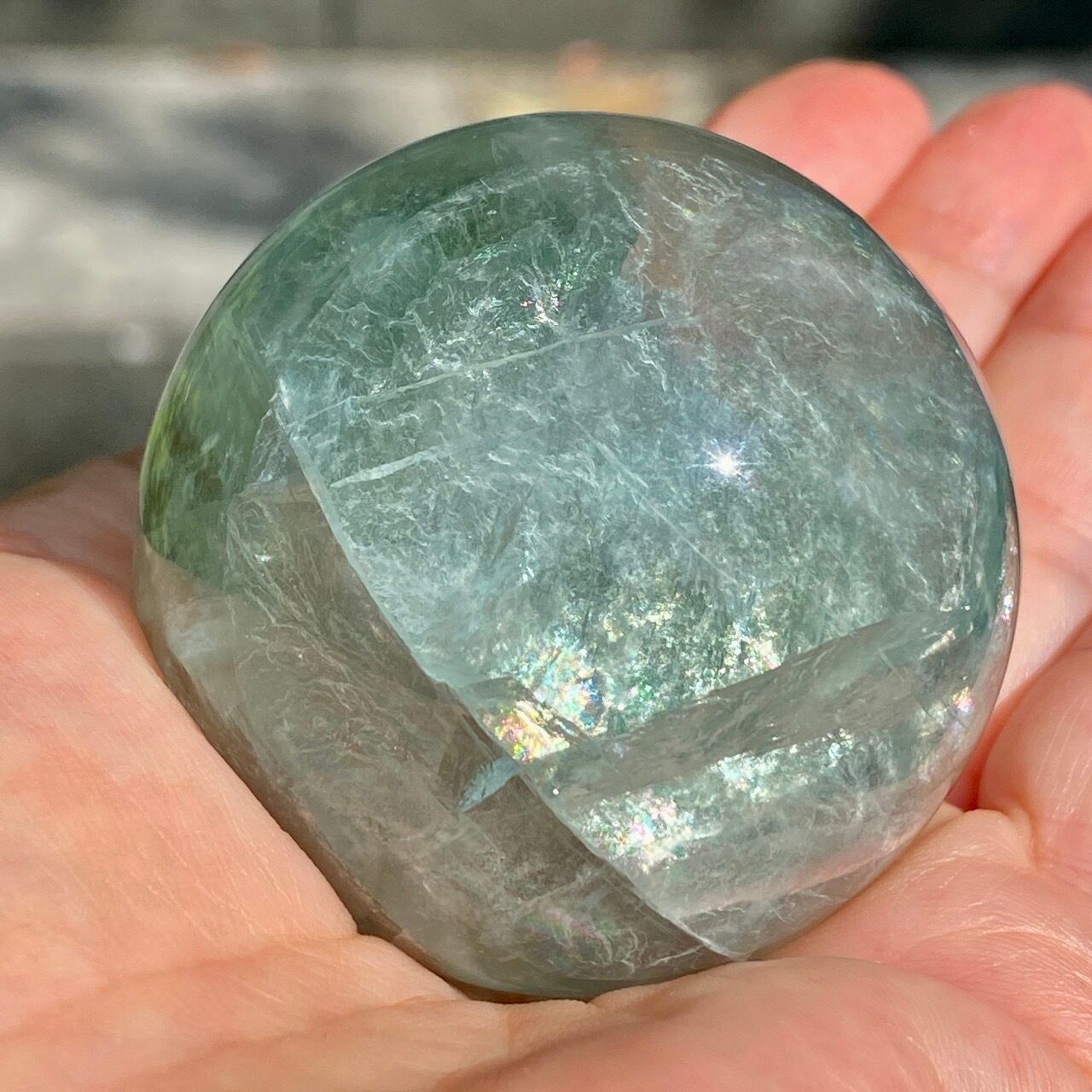 複数箇所に美しい虹が浮かび上がるグリーンフローライトのスフィアです。