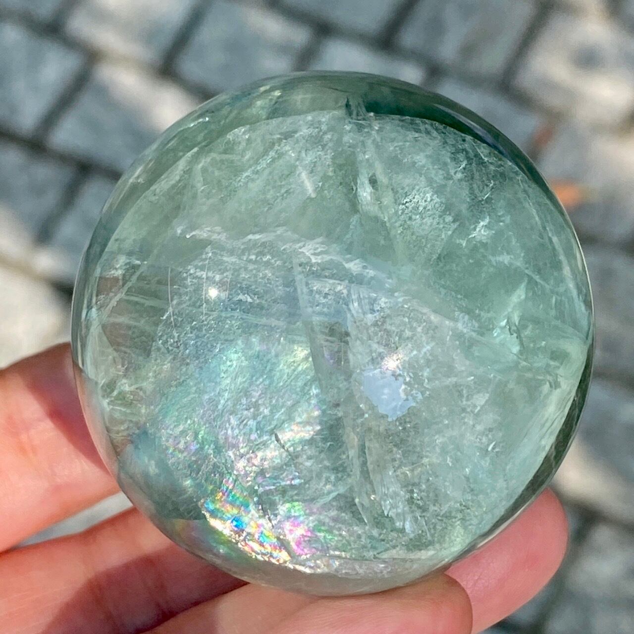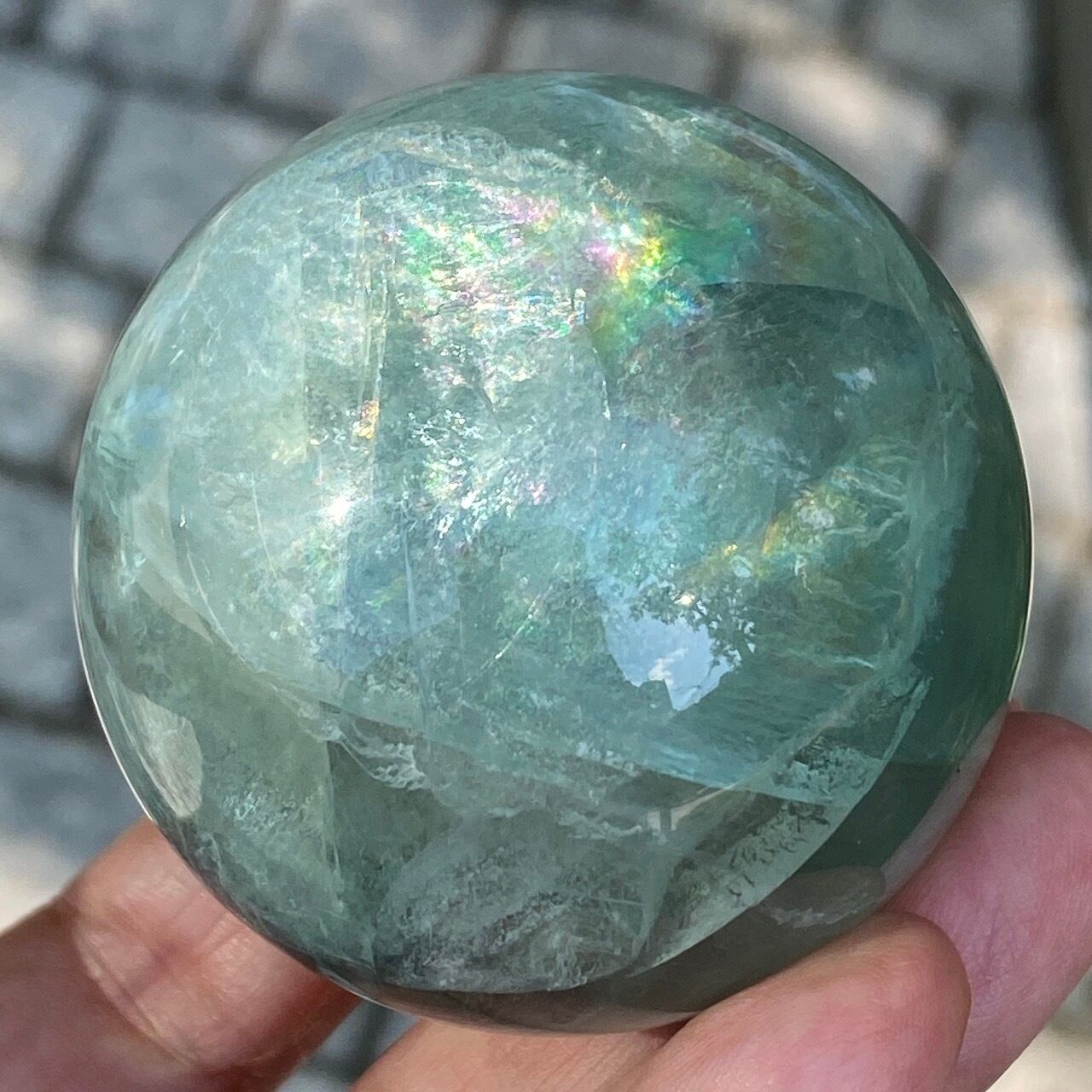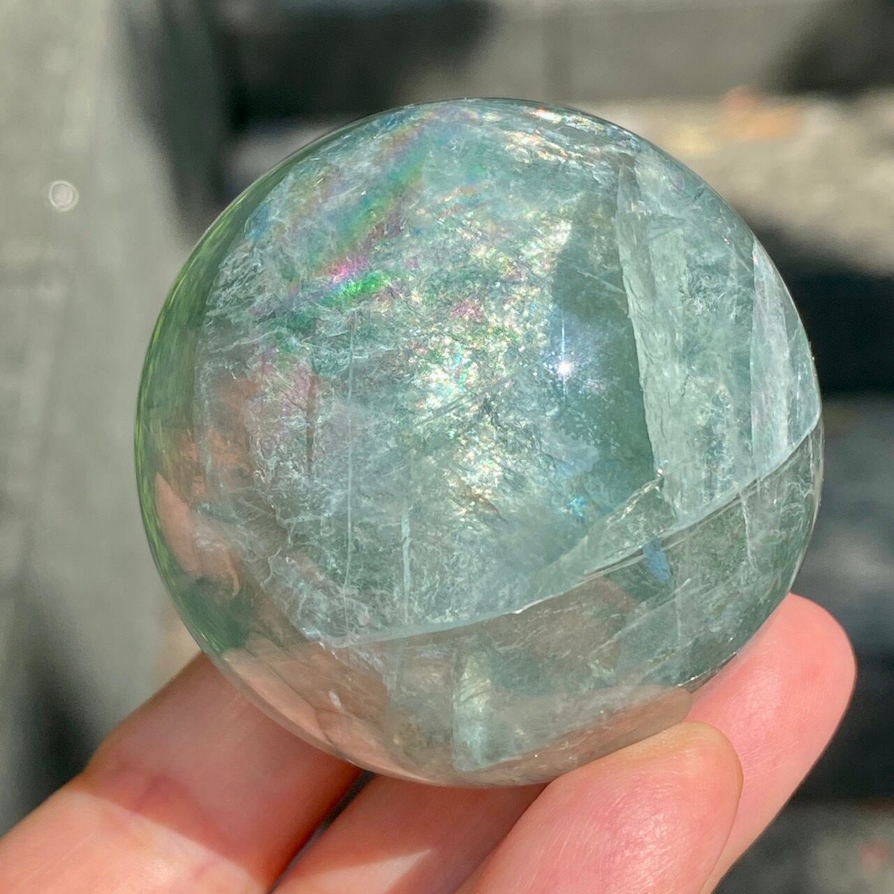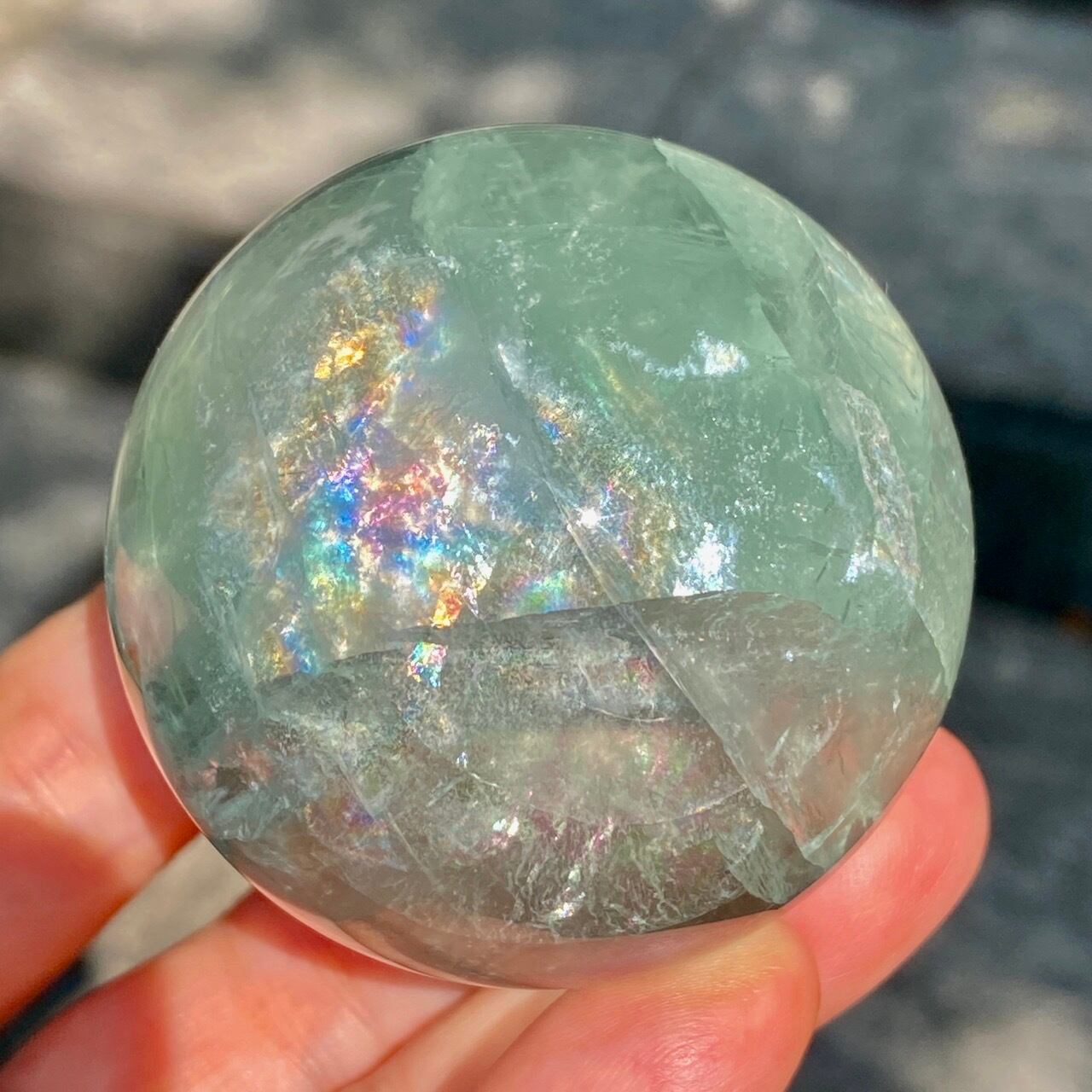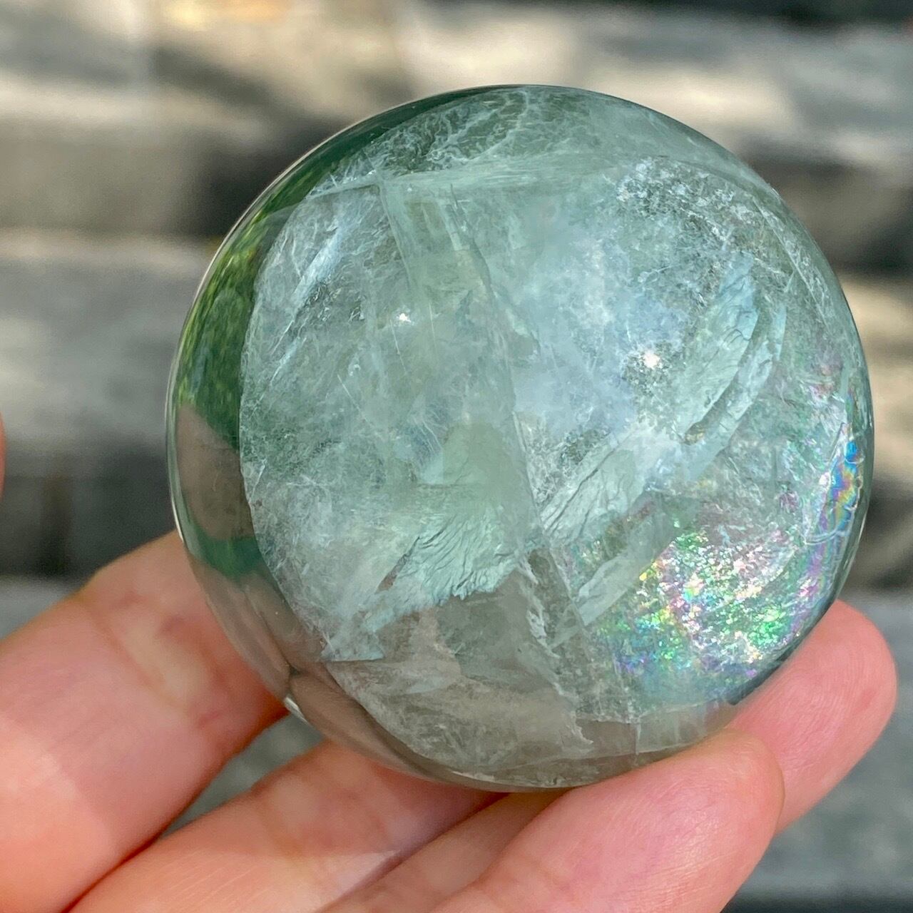 複数箇所に美しい虹が浮かび上がるグリーンフローライトのスフィアです。
