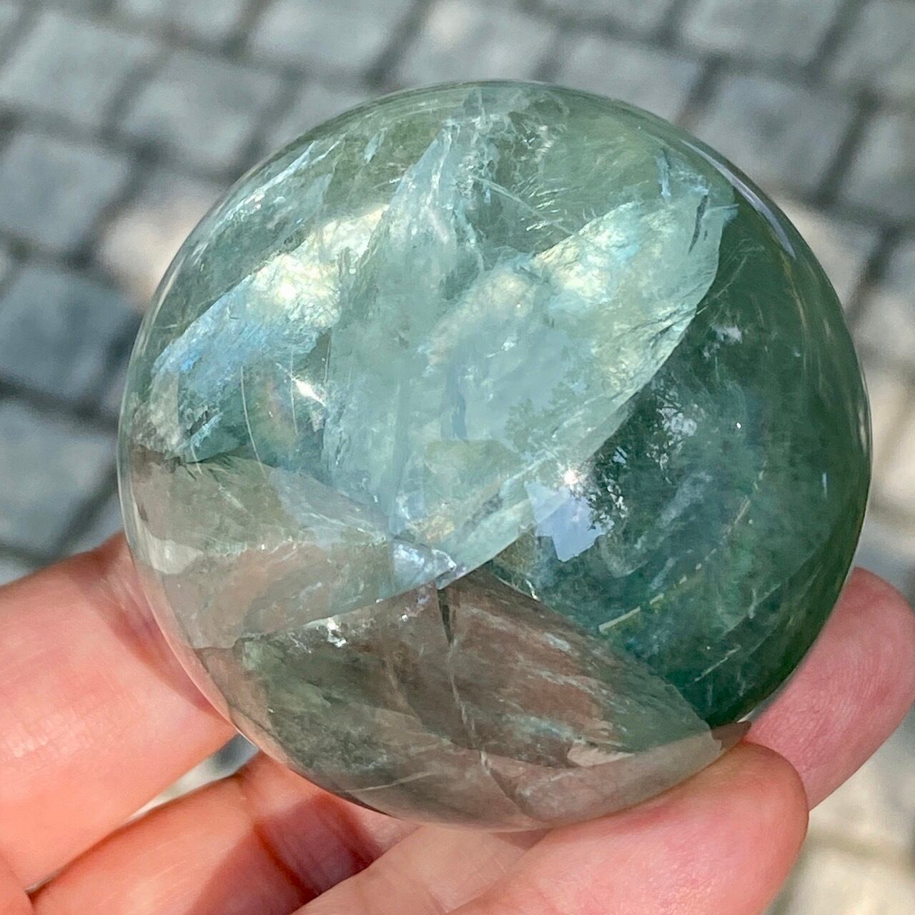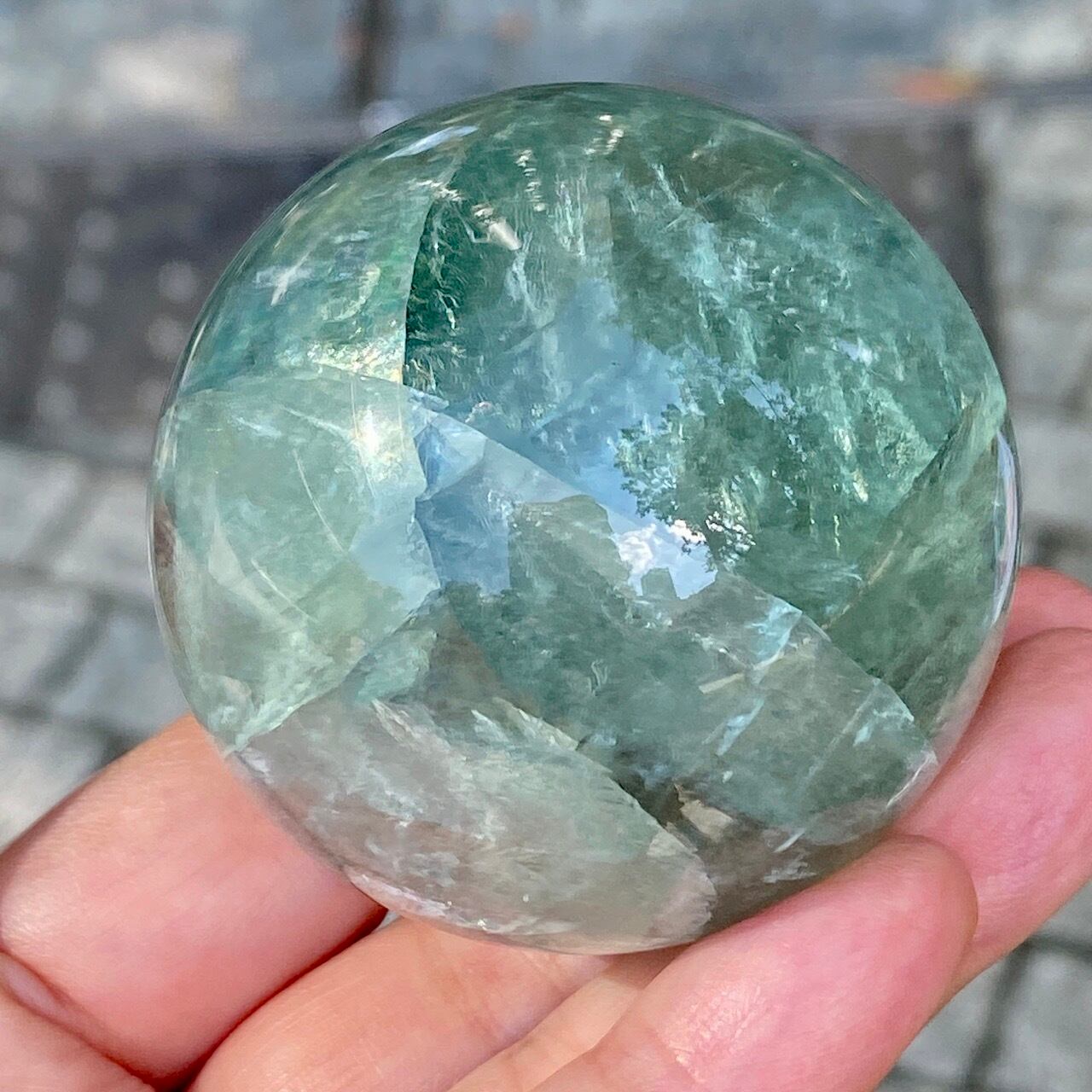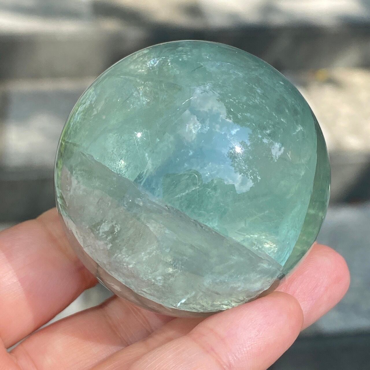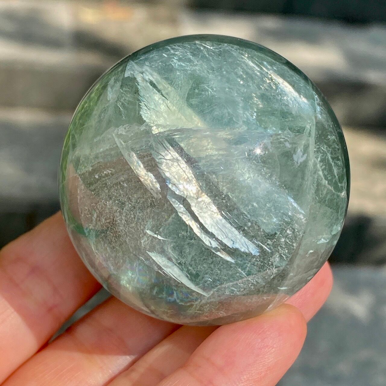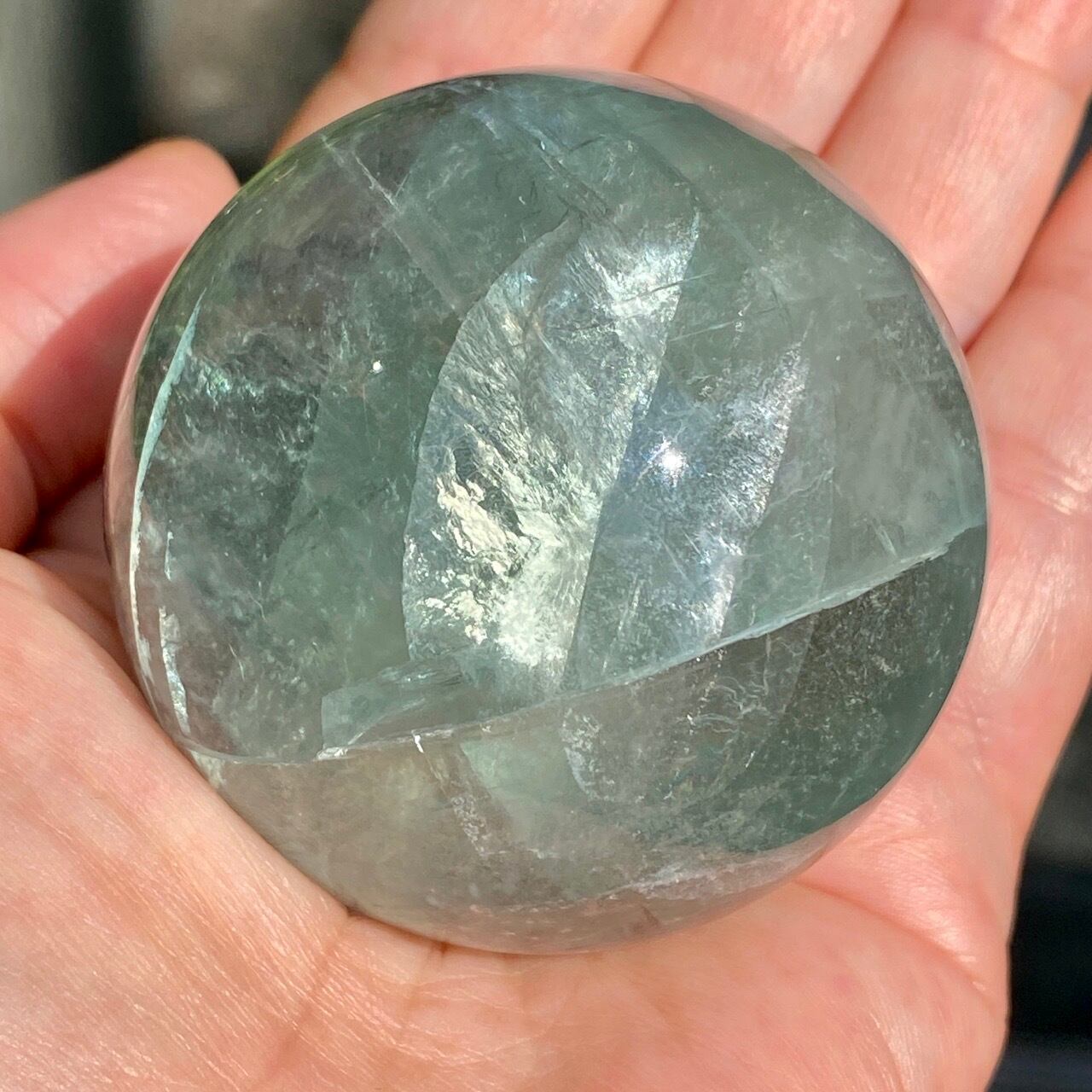 複数箇所に美しい虹が浮かび上がるグリーンフローライトのスフィアです。