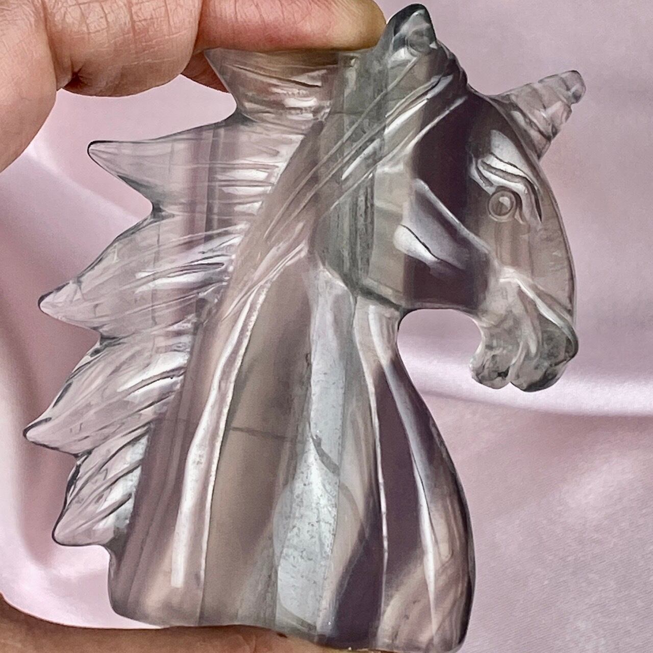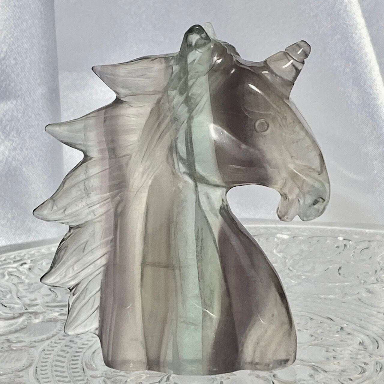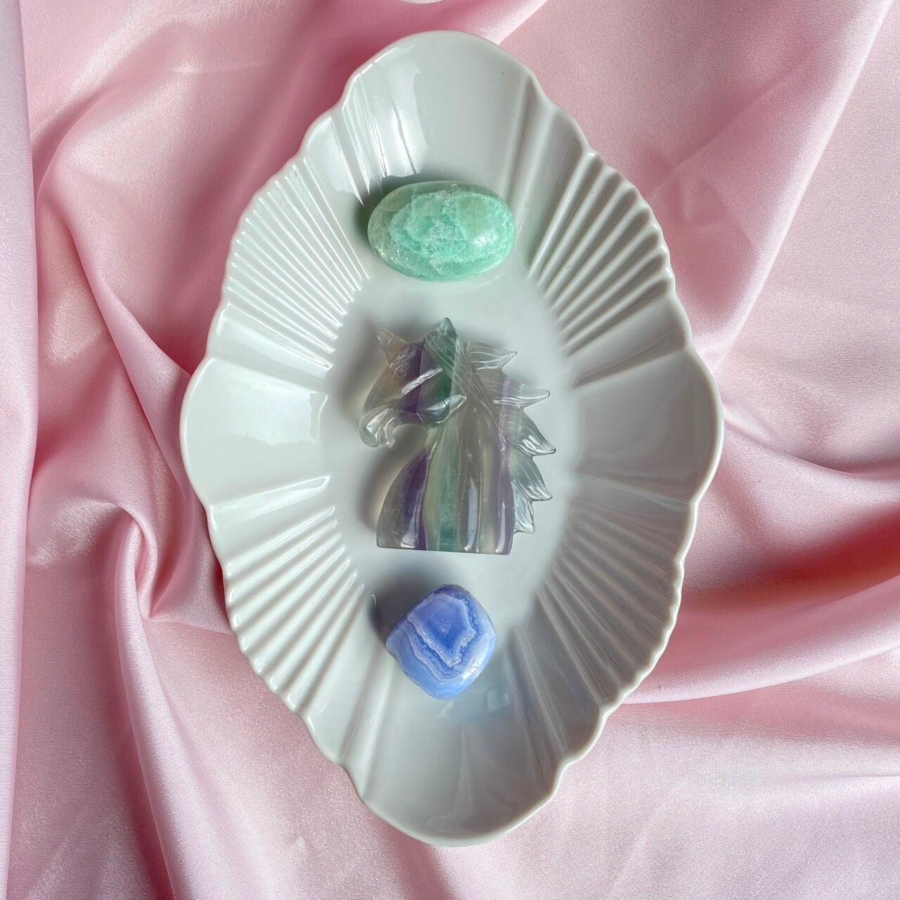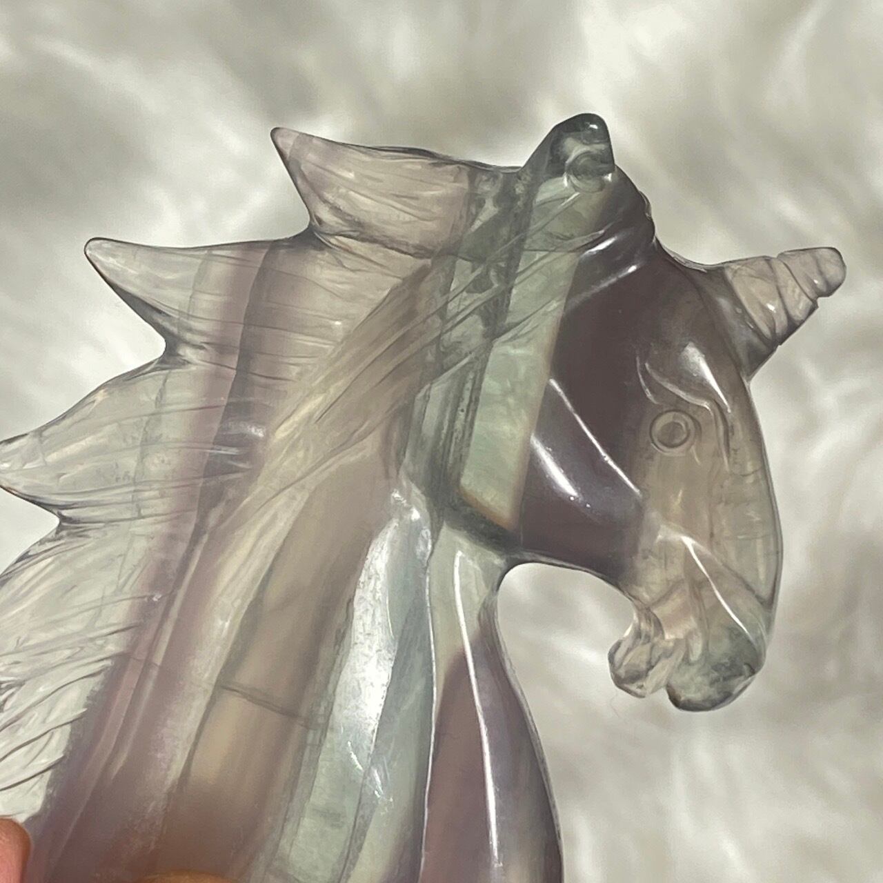ラベンダーフローライトはイットリウムフローライトと呼ばれ、他のフローライトと異なりその成分の約20%がイットリウムという鉱物に置き換わることにより、このラベンダーカラーが生み出されています。柔らかなミントグリーンカラーとのコンビネーションも本当に可愛くて、まさにユニコーンにうってつけの石だと感じます。