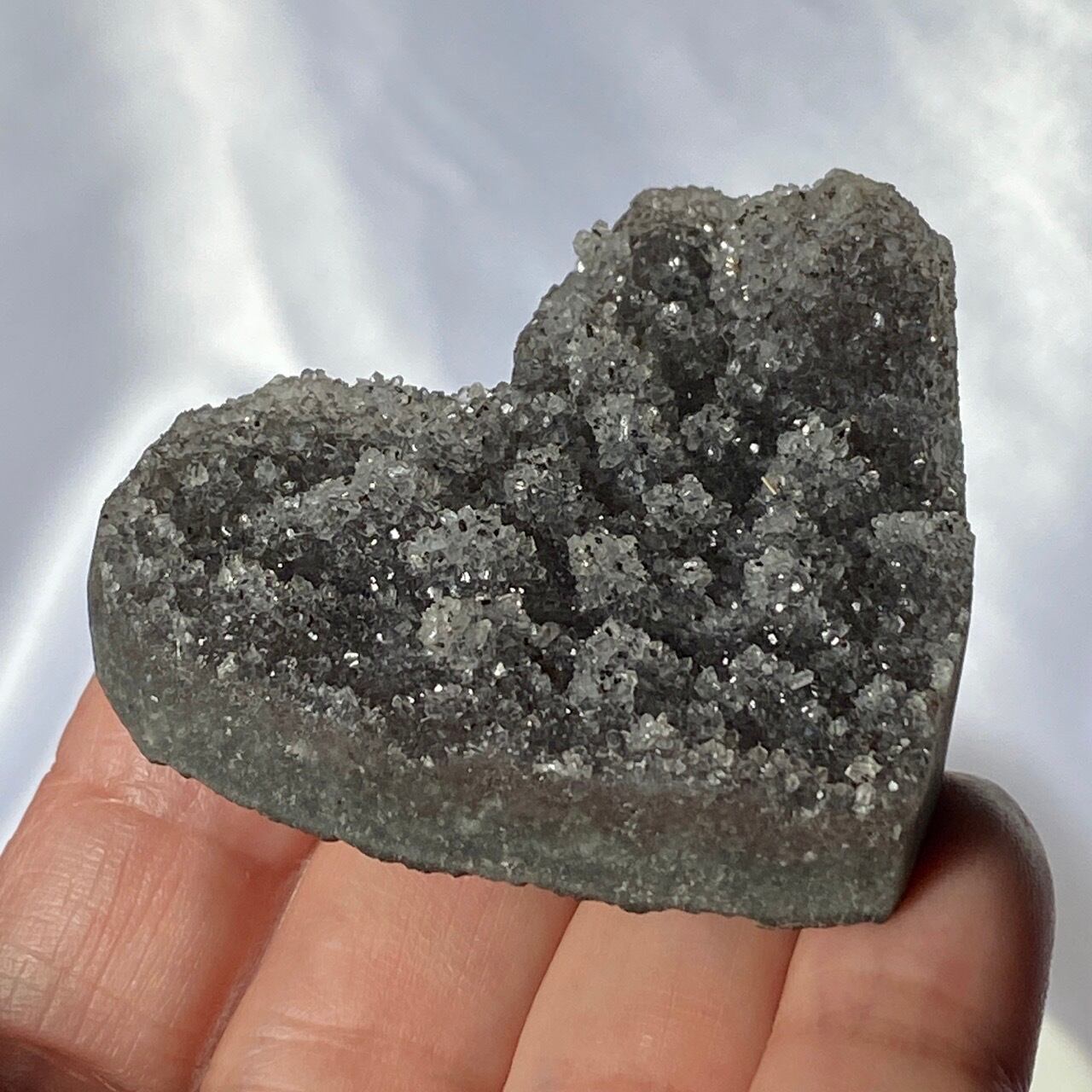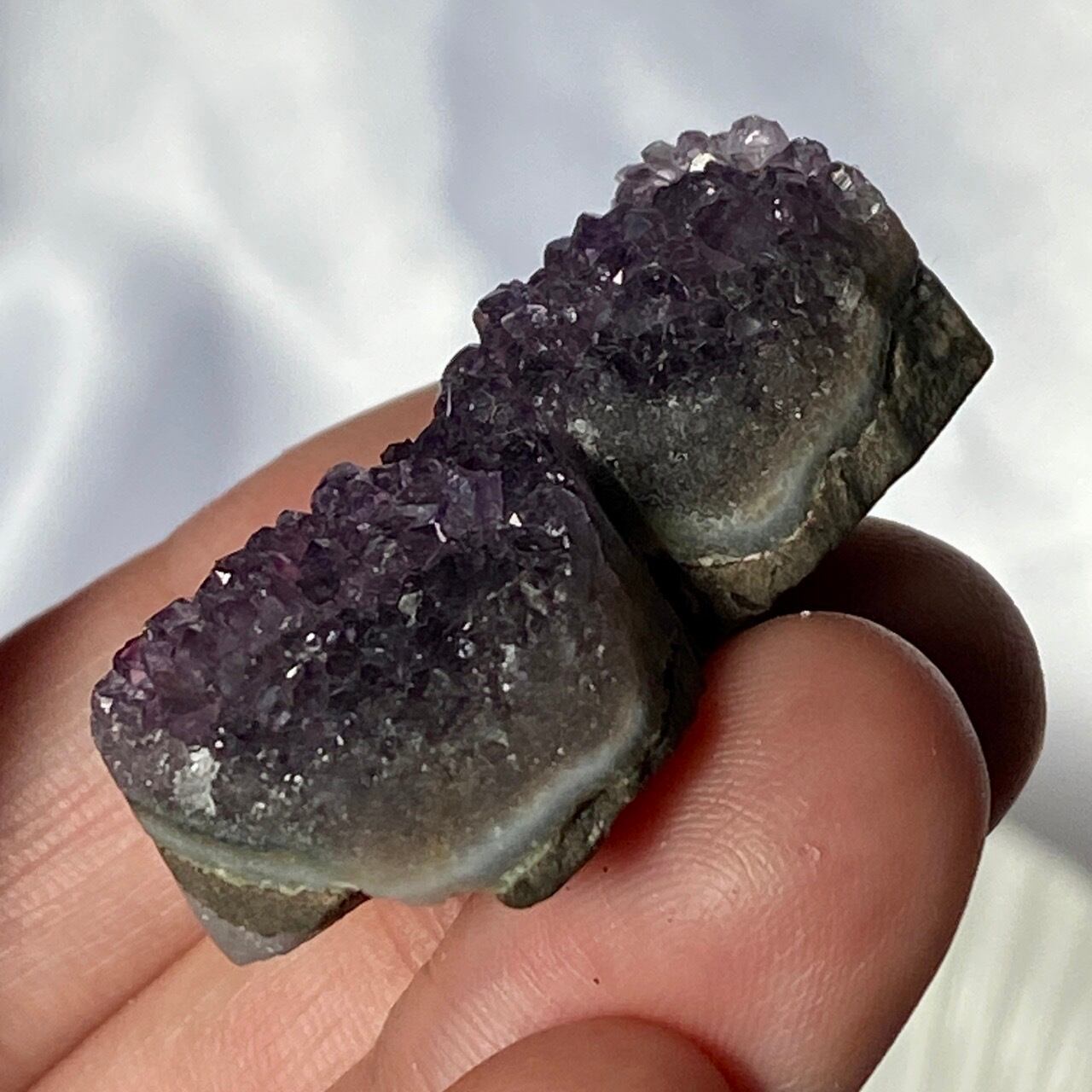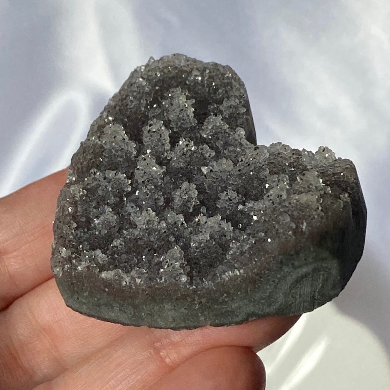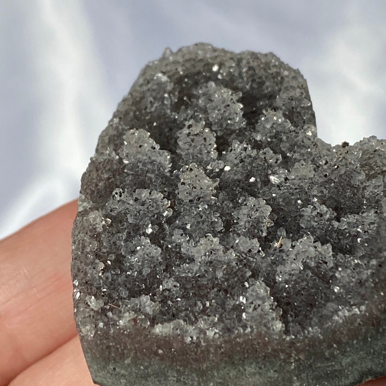 大きい子は、ブラジルではアメジストと呼ばれていますが、実際はドゥルージーな結晶が覆う沸石になります。表面から隆起した砂糖菓子のようなドゥルージーの可愛さと細かい結晶のちらちらとした煌めきの美しさがこの子の魅力です。グレーの濃淡も魅力を添えています。
