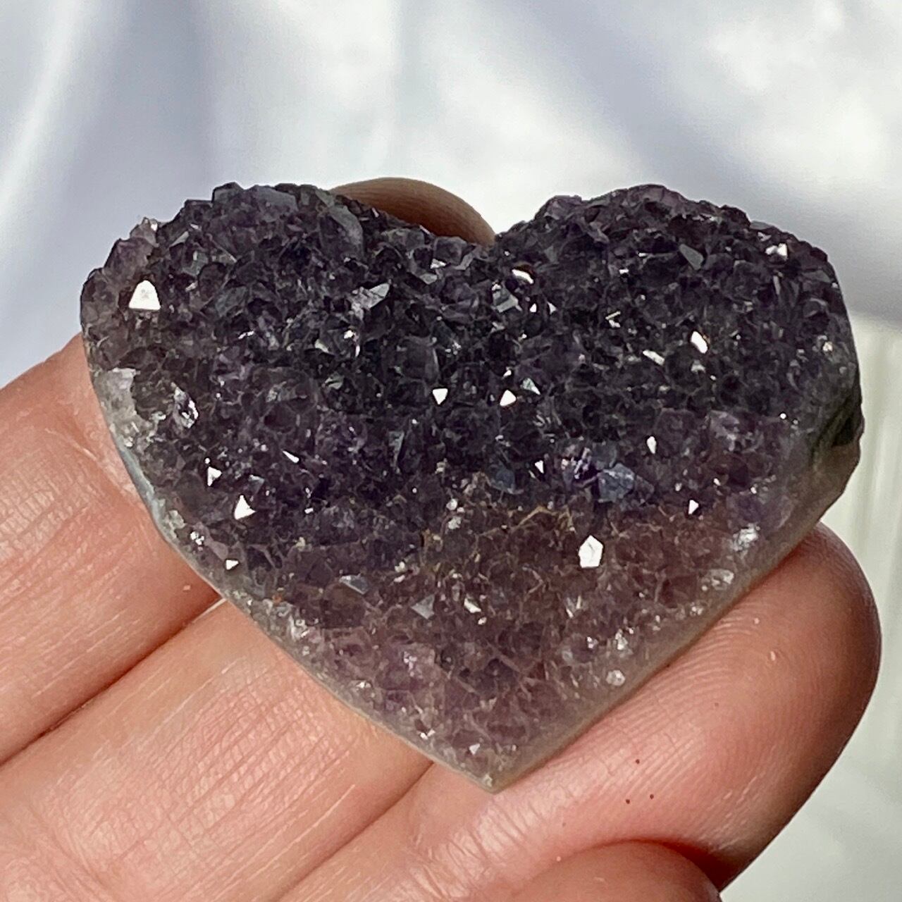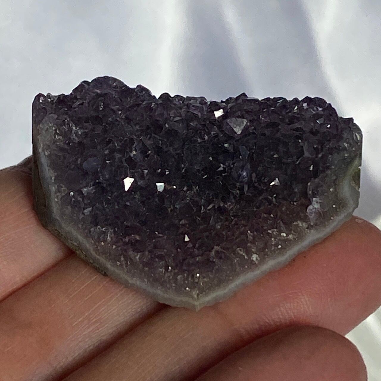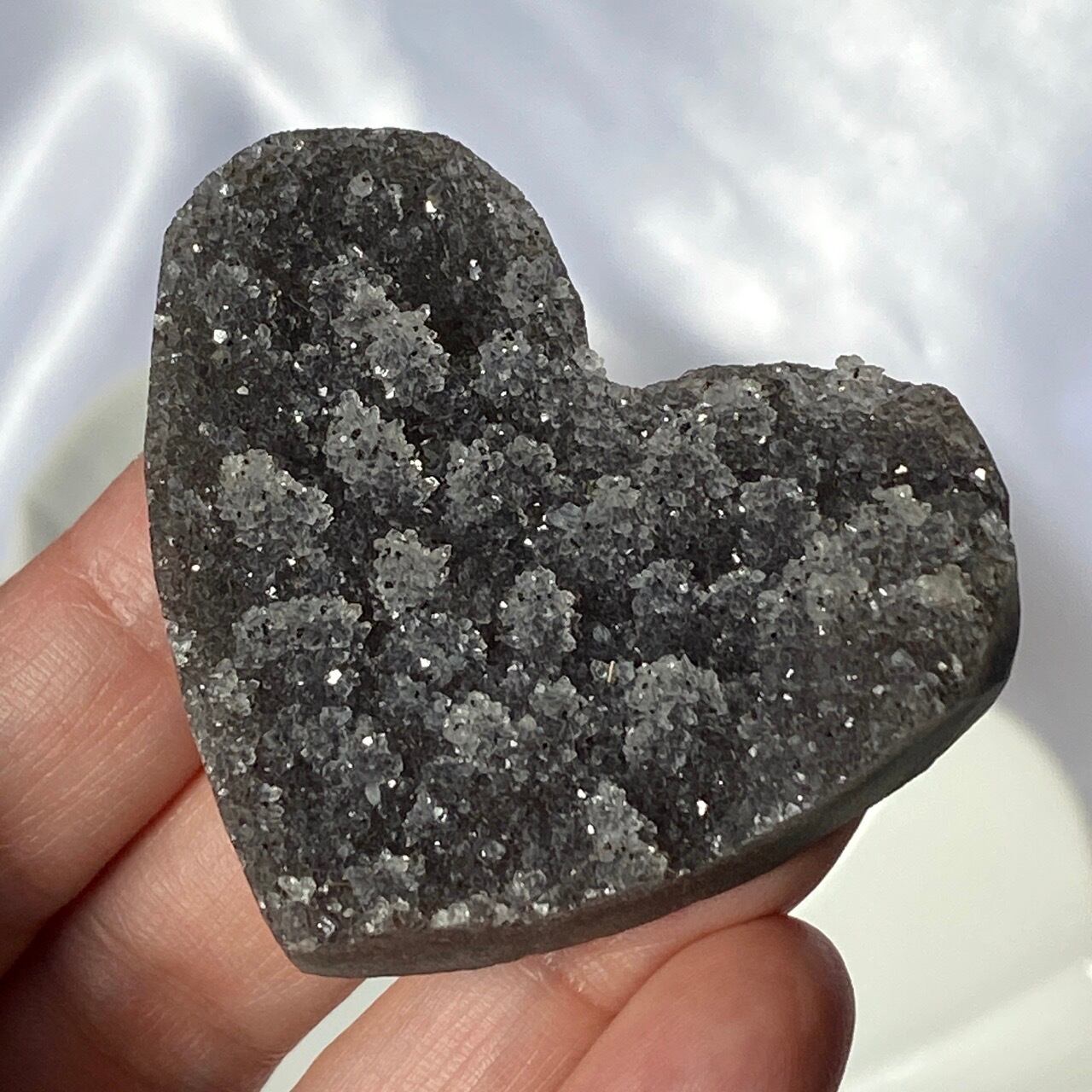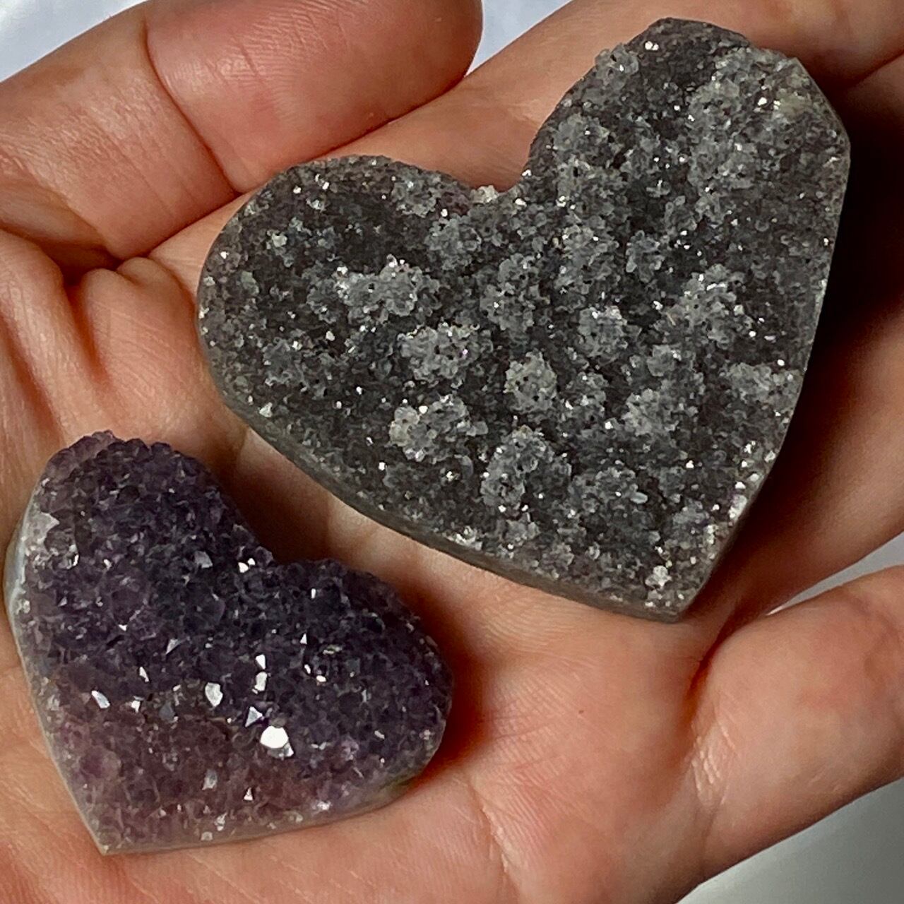 大きい子は、ブラジルではアメジストと呼ばれていますが、実際はドゥルージーな結晶が覆う沸石になります。表面から隆起した砂糖菓子のようなドゥルージーの可愛さと細かい結晶のちらちらとした煌めきの美しさがこの子の魅力です。グレーの濃淡も魅力を添えています。