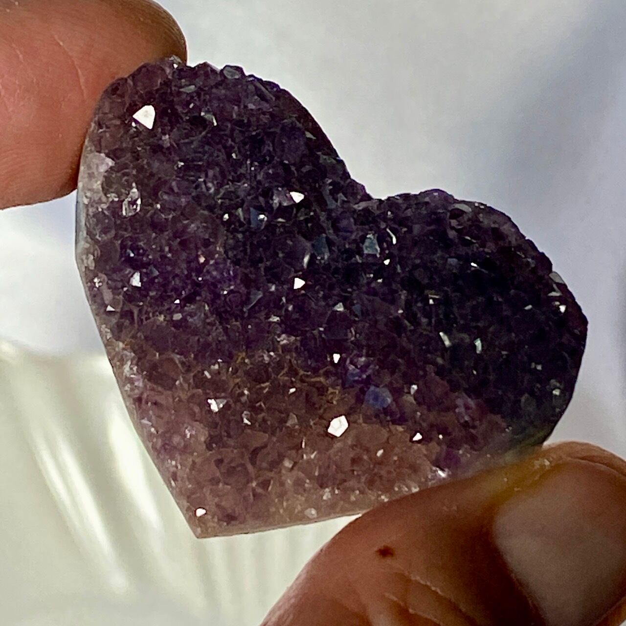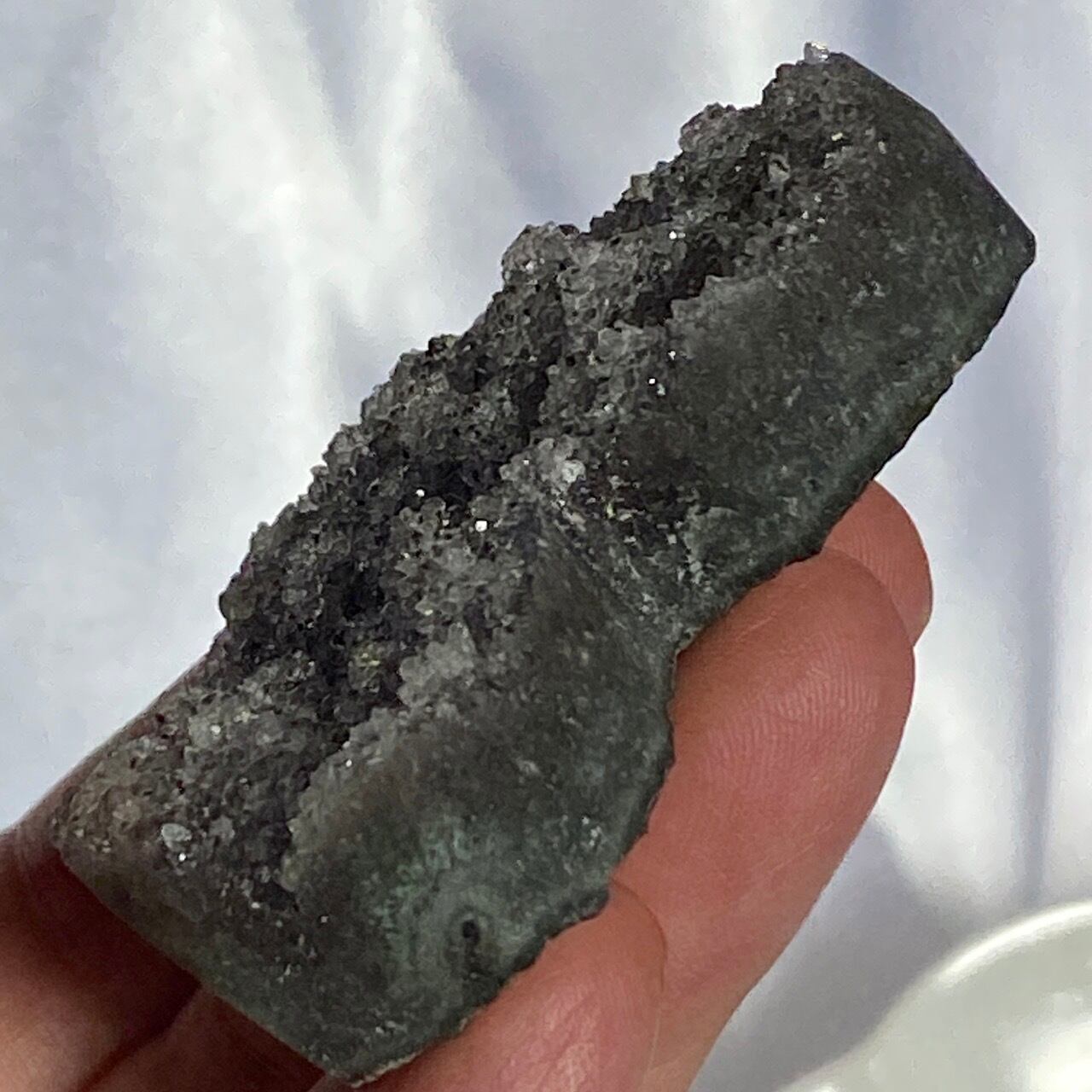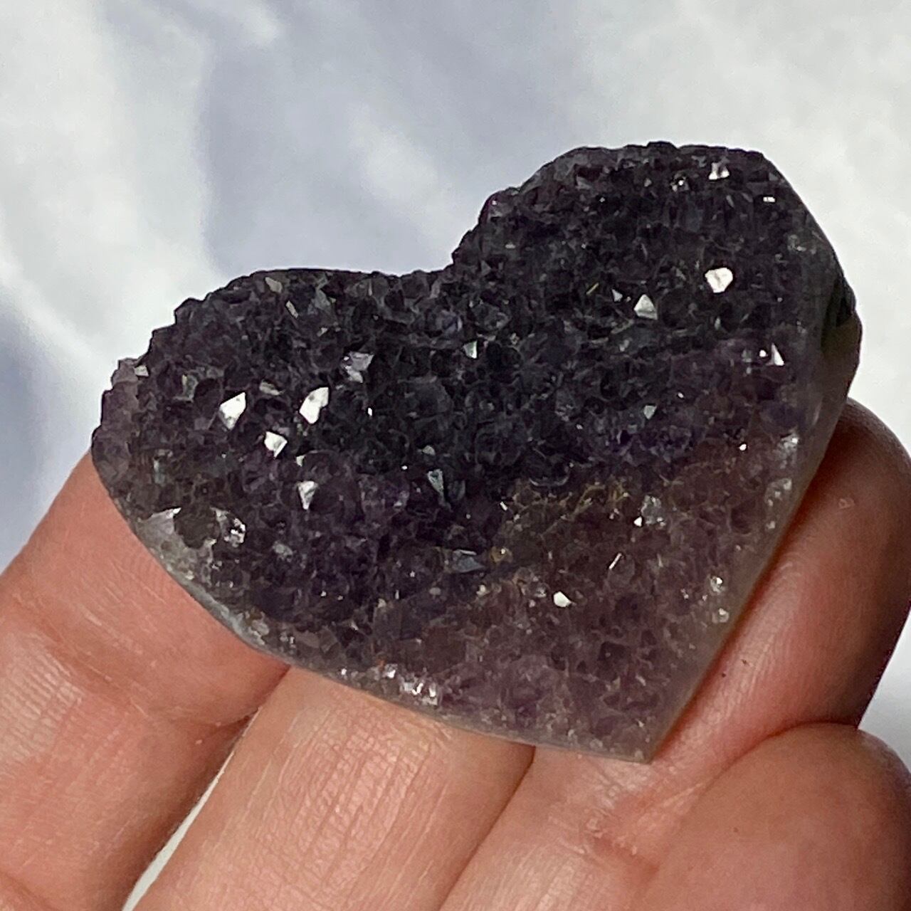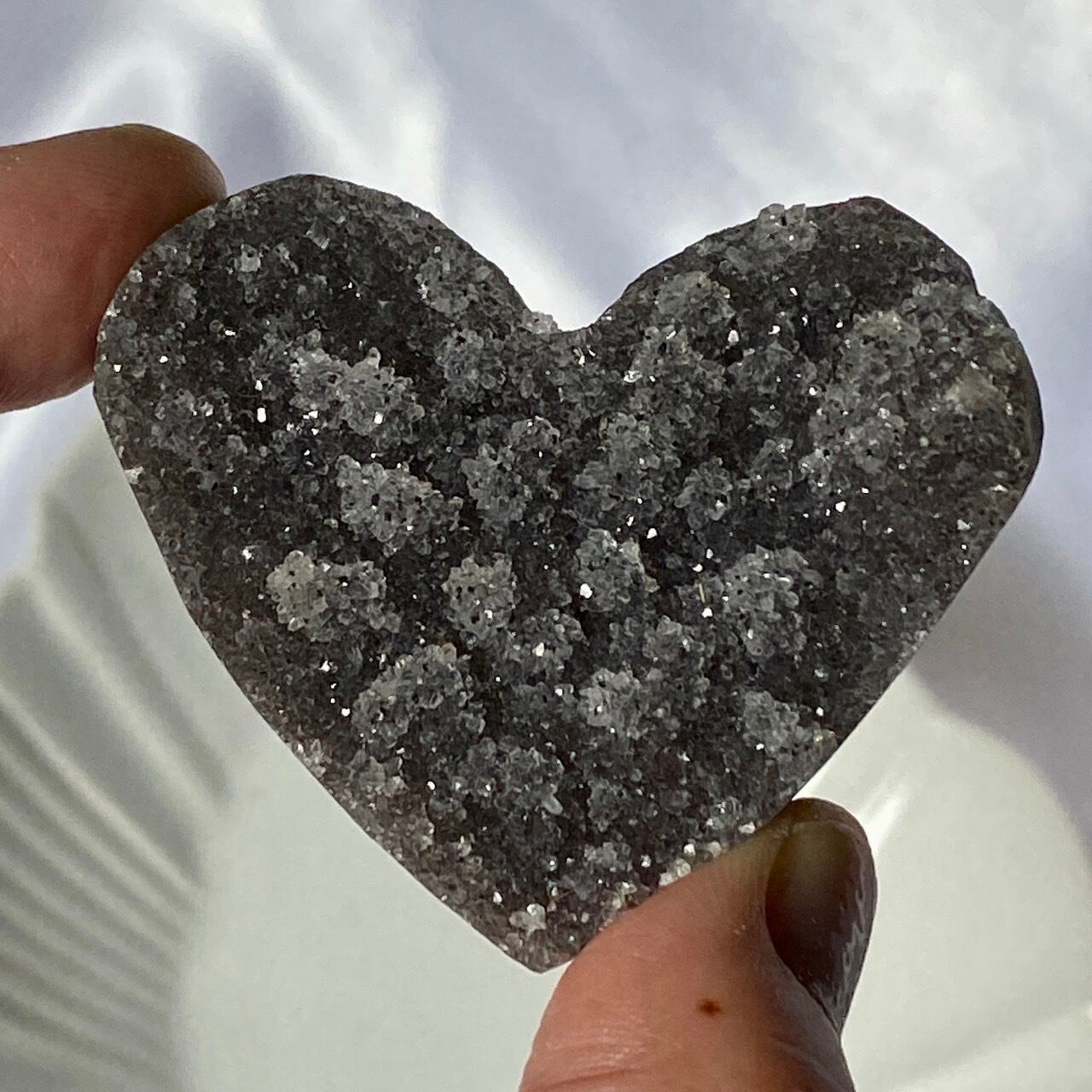大きい子は、ブラジルではアメジストと呼ばれていますが、実際はドゥルージーな結晶が覆う沸石になります。表面から隆起した砂糖菓子のようなドゥルージーの可愛さと細かい結晶のちらちらとした煌めきの美しさがこの子の魅力です。グレーの濃淡も魅力を添えています。