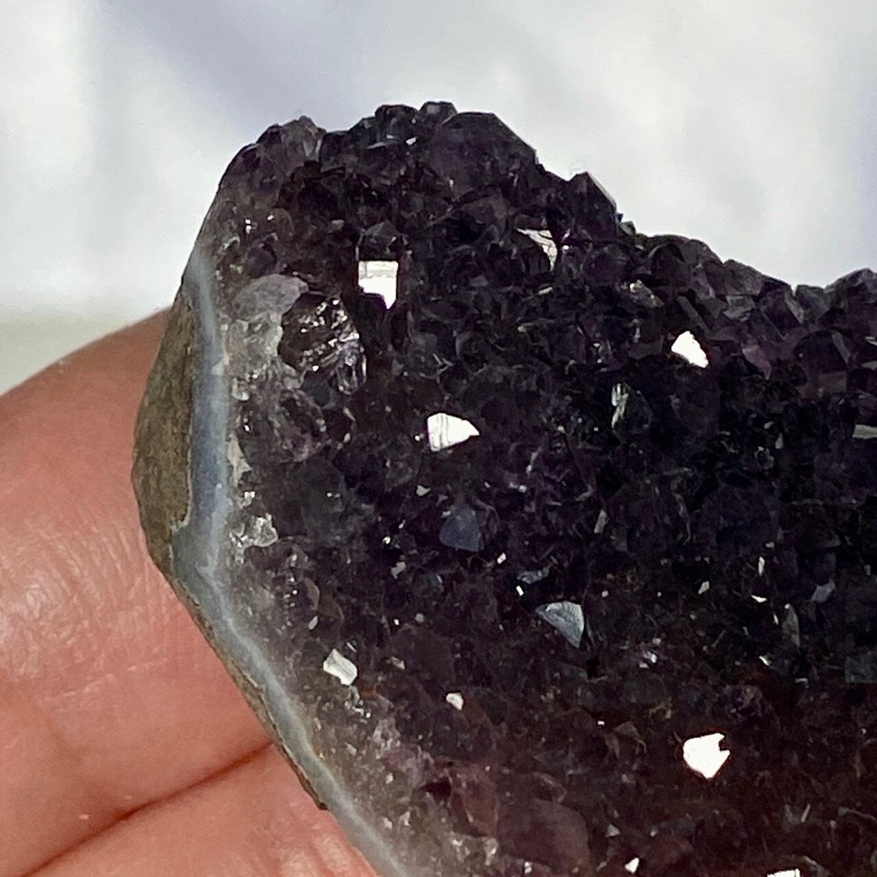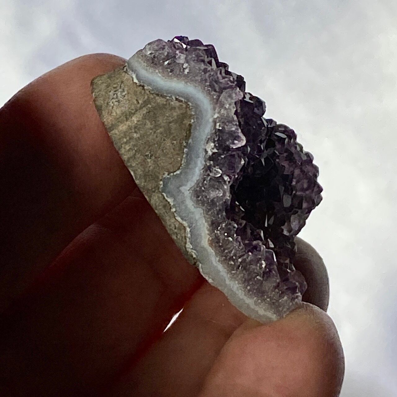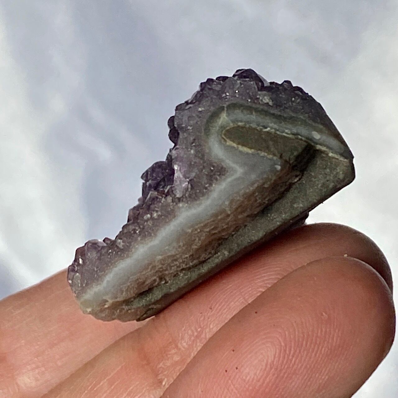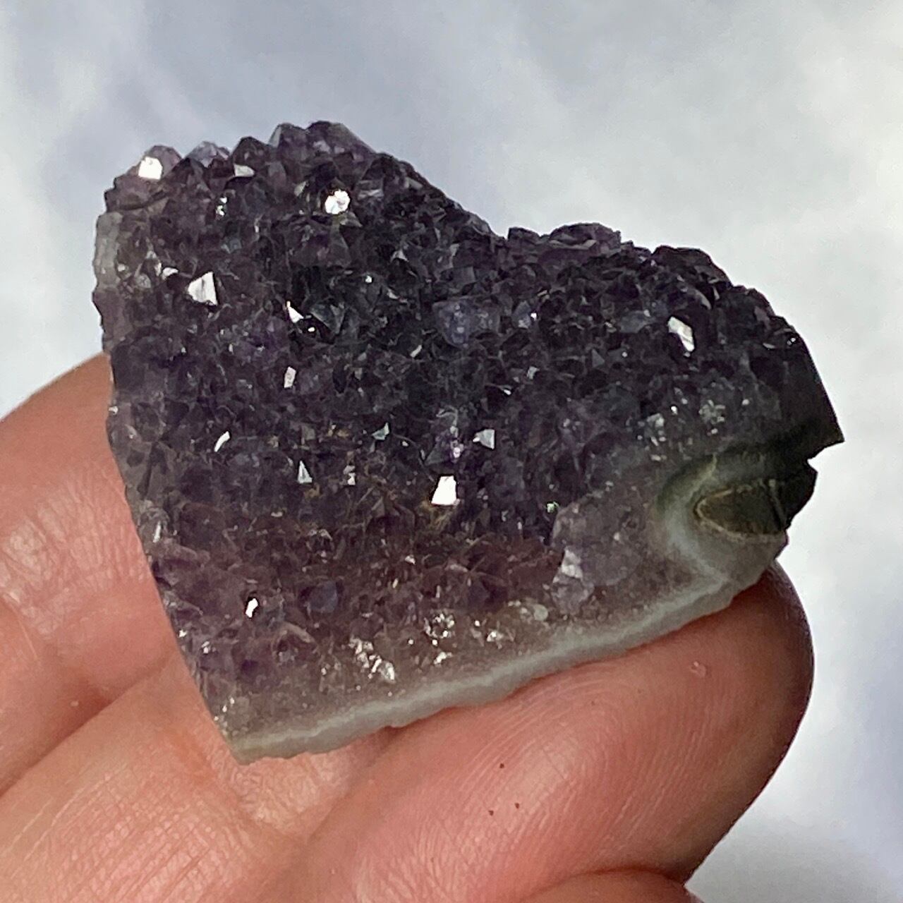 小さい子はスモーキーな紫のアメジストになります。半分から上側がこんもりとした結晶になっていて、ミニサイズながらも、美しい煌めきがあって可愛いです。