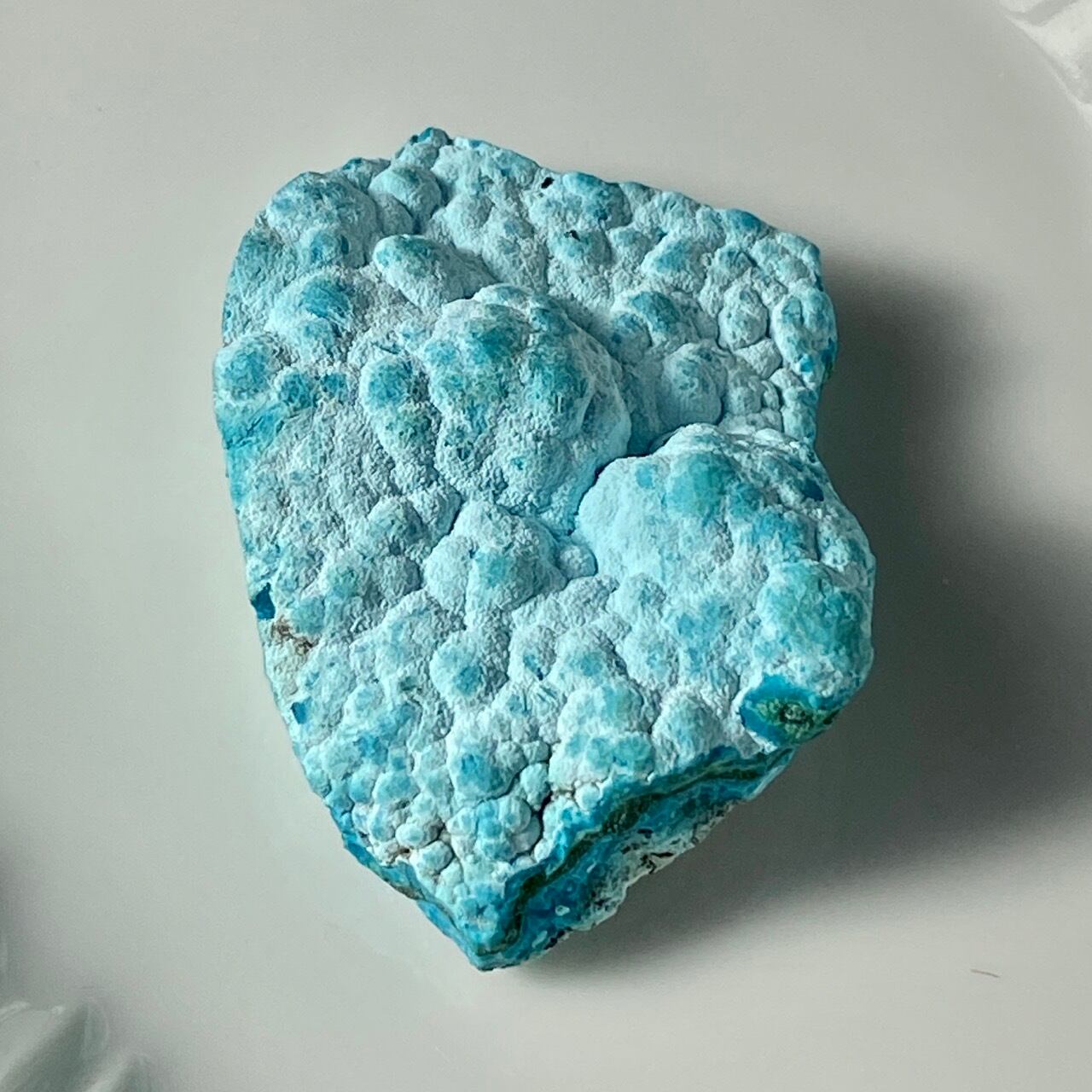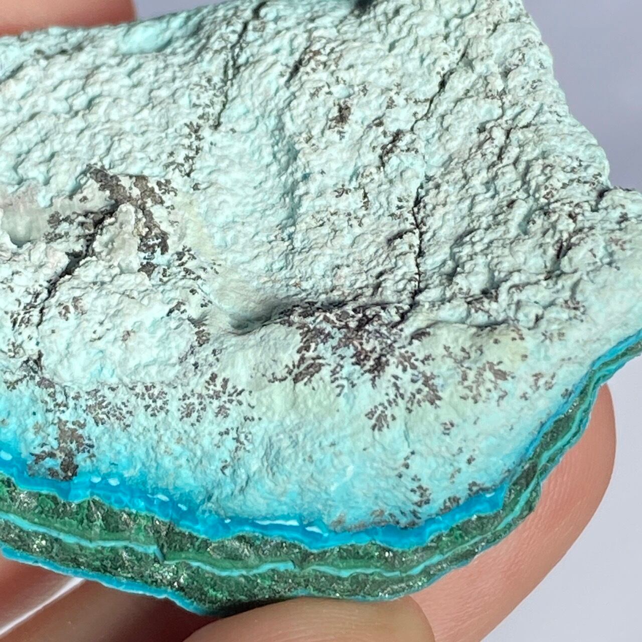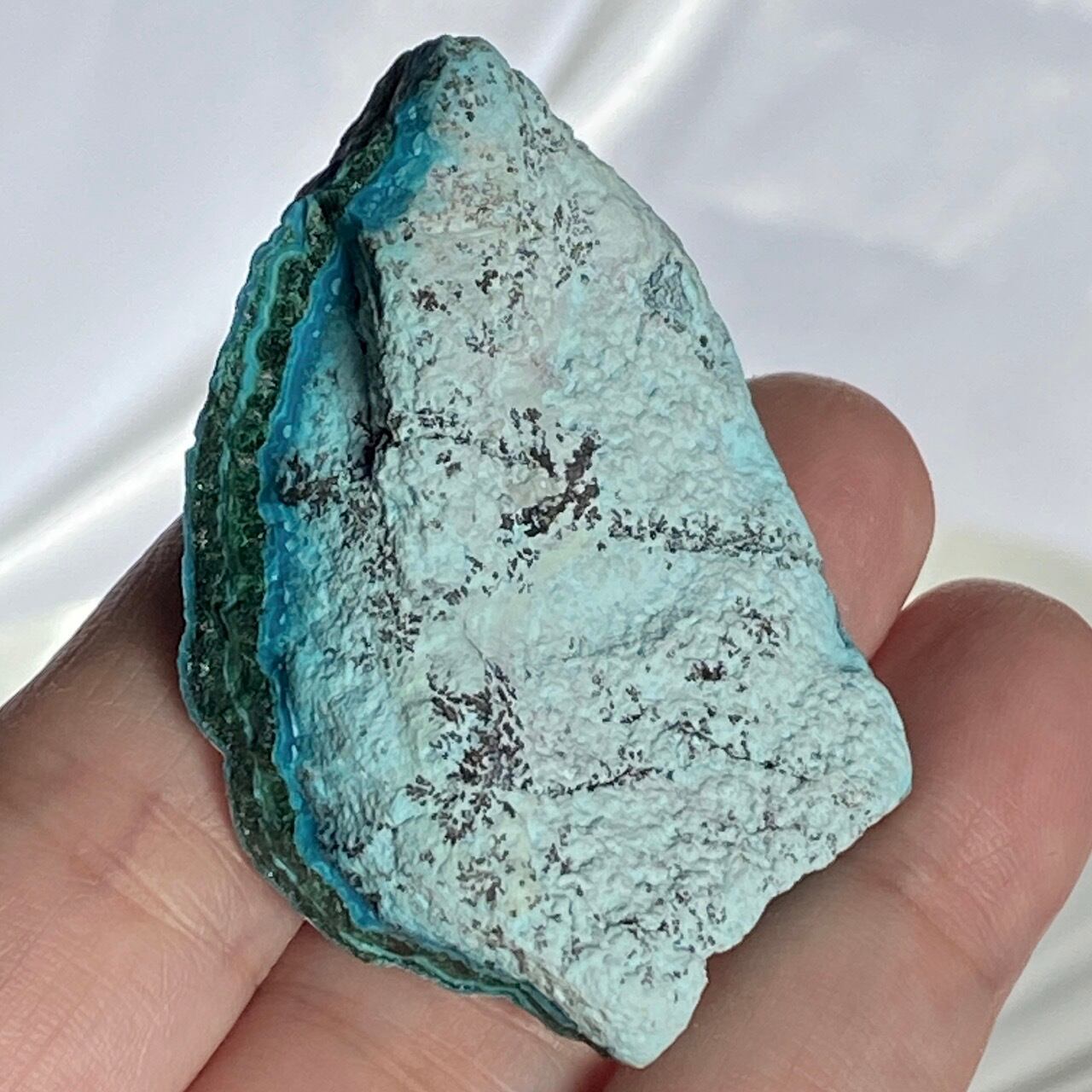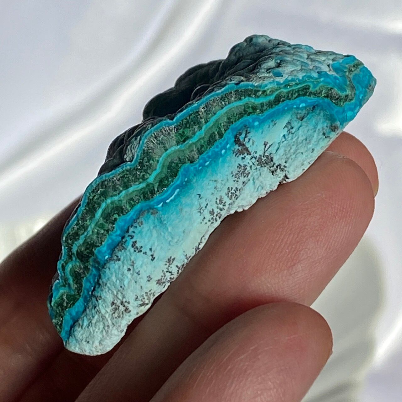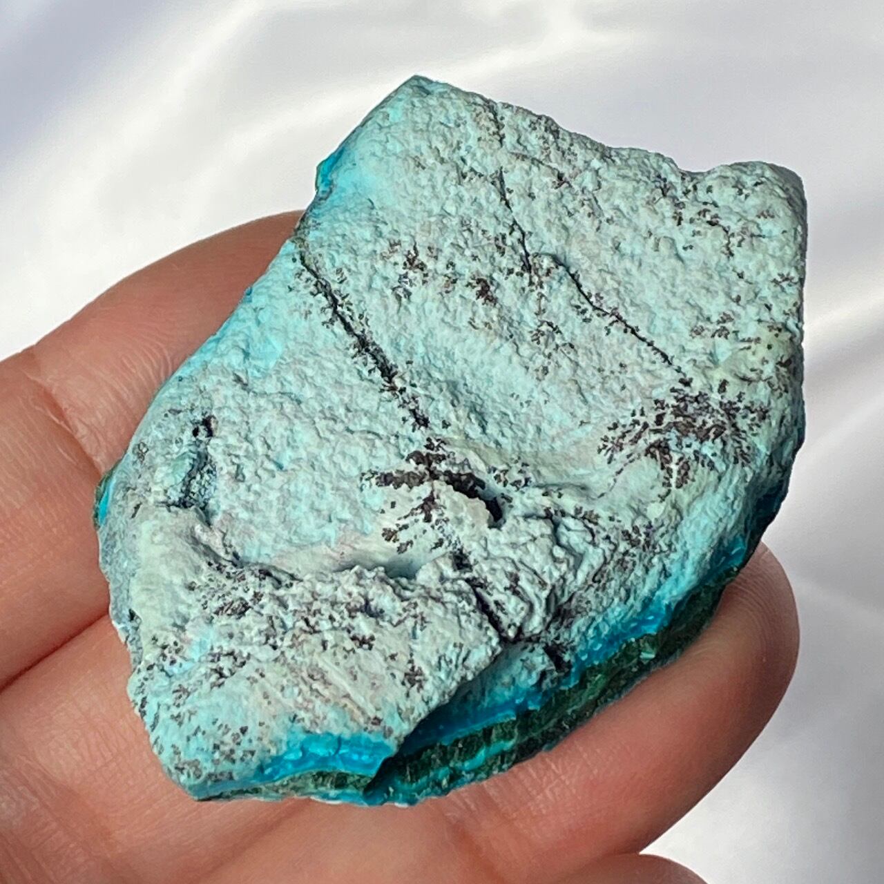 マラカイトの緑が加わった美しいカラーコンビネーションに加え、裏面のデンドライトが魅力を添えています。クリソコラは、このようにbotryoidal=もこもことしたブドウ状の形状である事が多く、中でももこもこ感にこだわっている店主が、可愛い形状のものをセレクトしました。