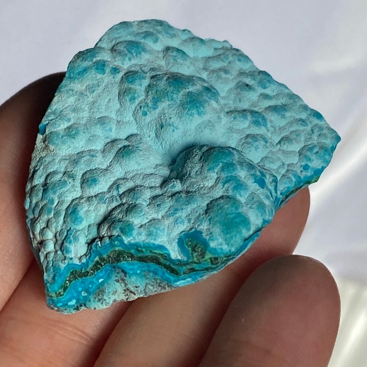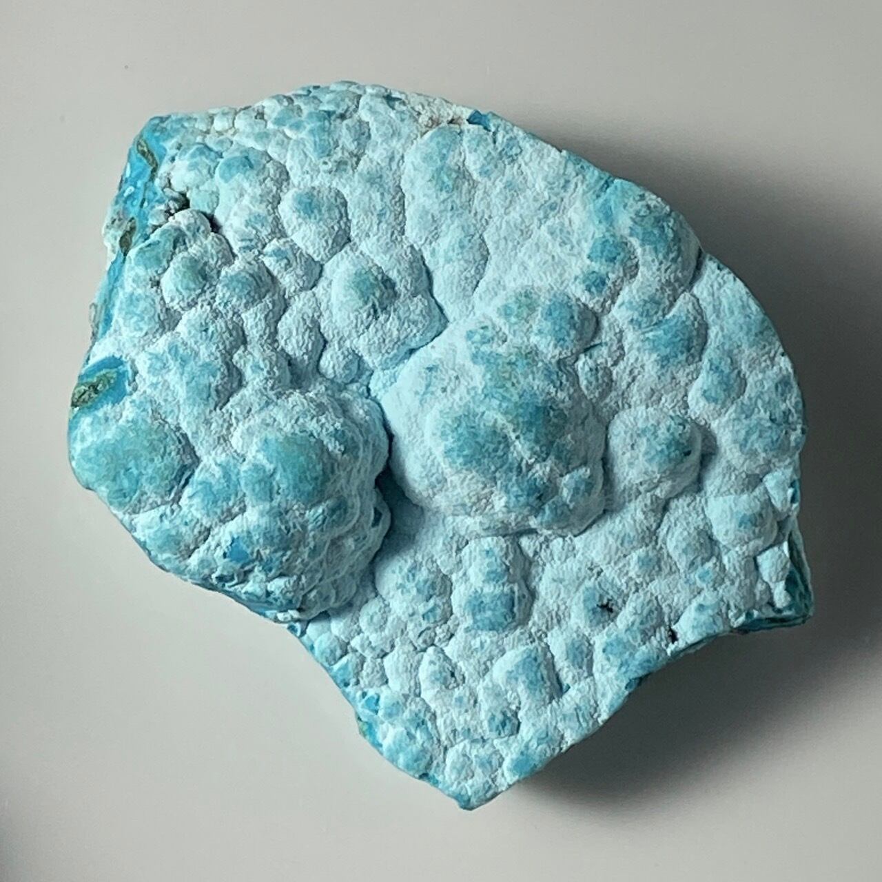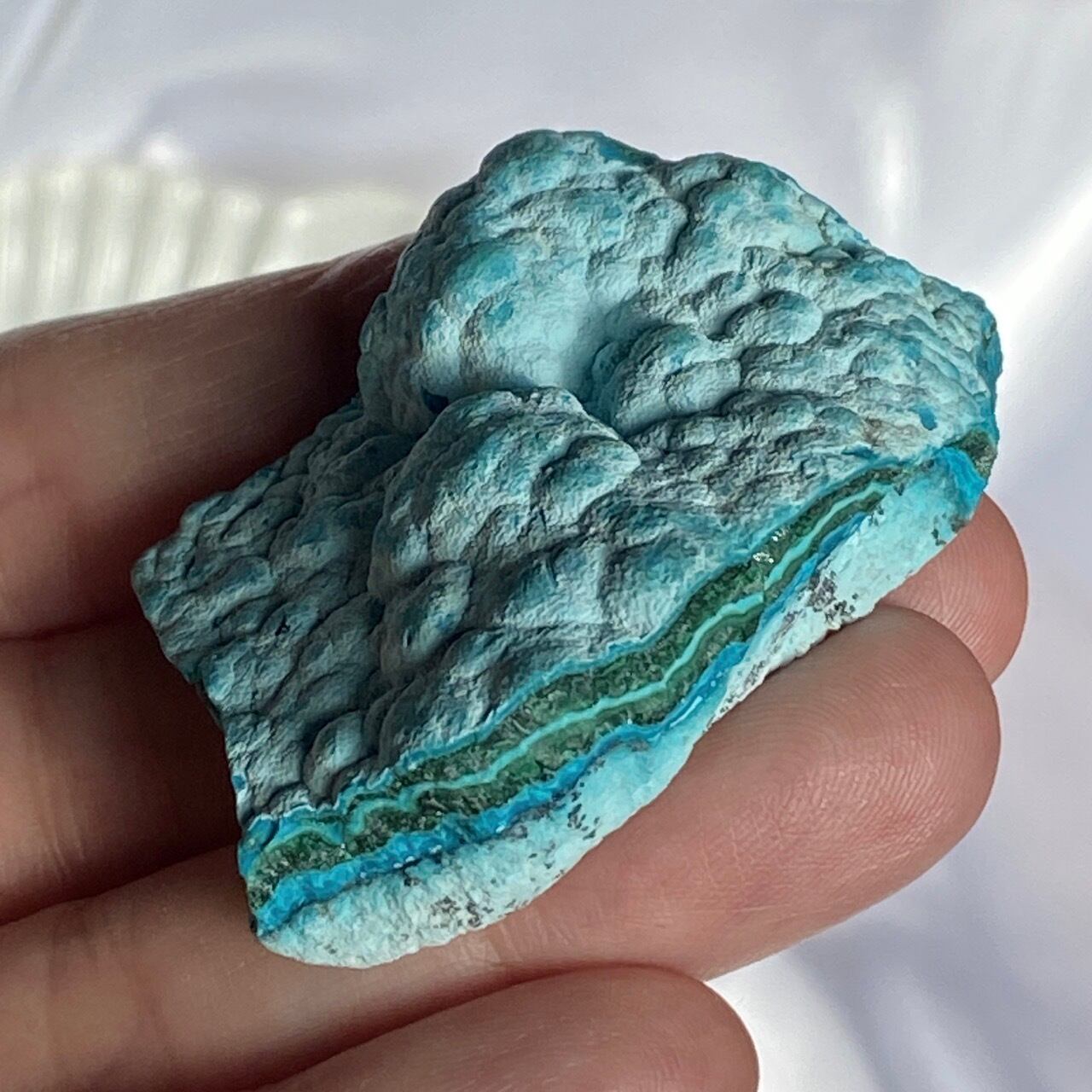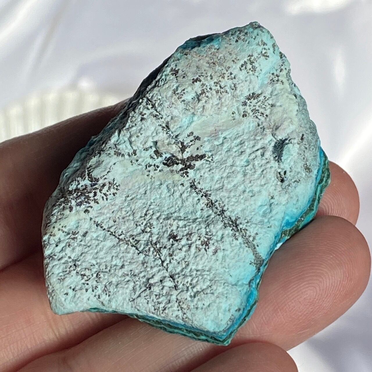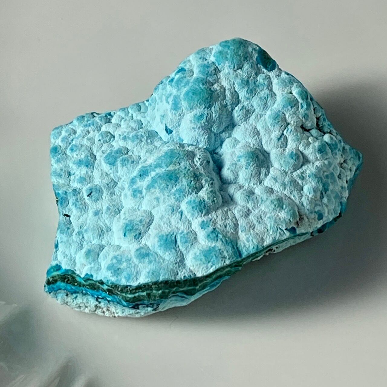 マラカイトの緑が加わった美しいカラーコンビネーションに加え、裏面のデンドライトが魅力を添えています。クリソコラは、このようにbotryoidal=もこもことしたブドウ状の形状である事が多く、中でももこもこ感にこだわっている店主が、可愛い形状のものをセレクトしました。