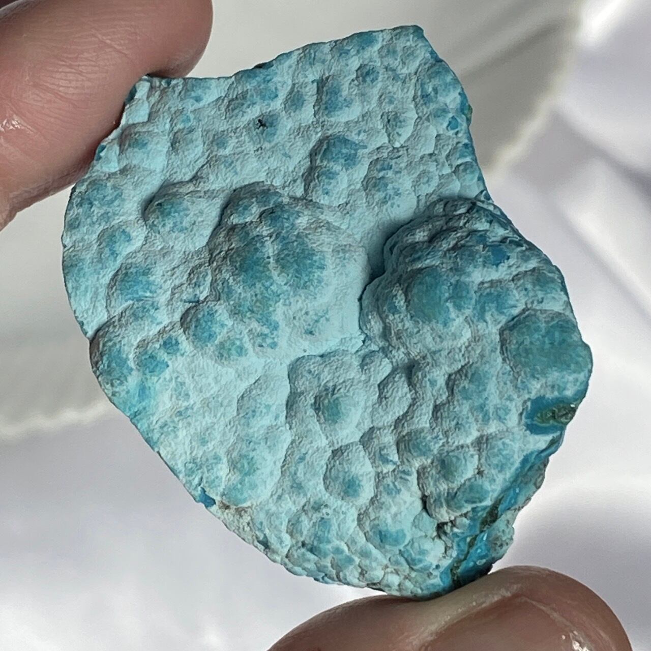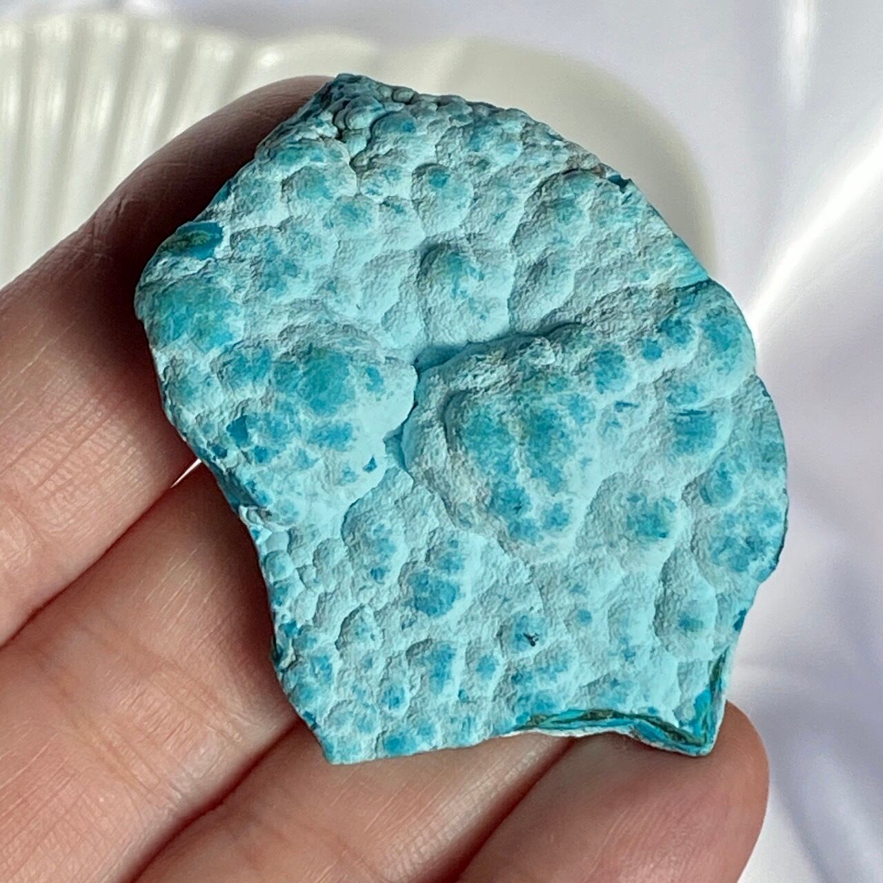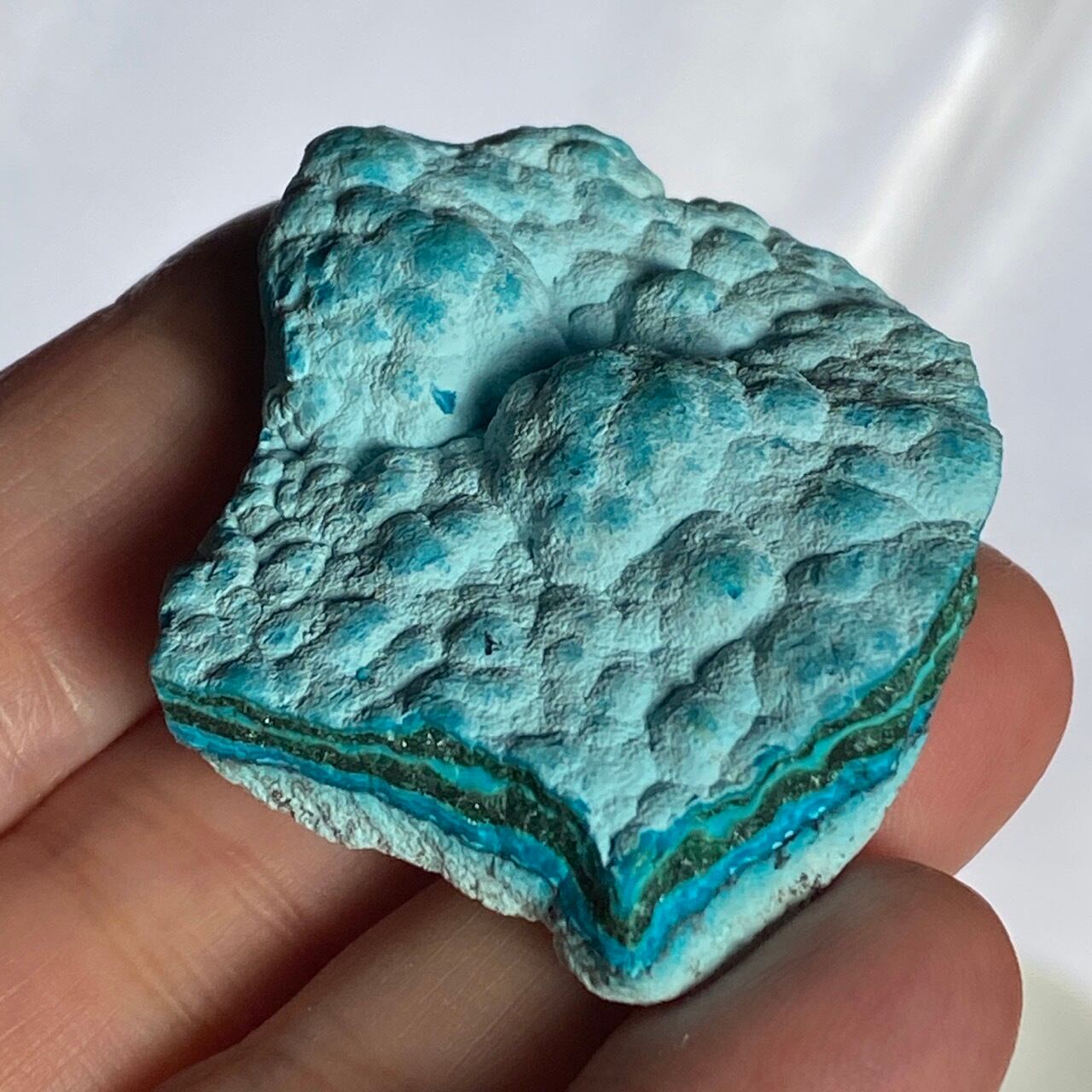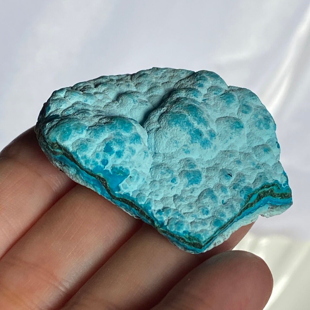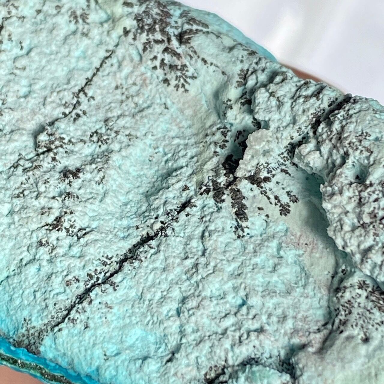 マラカイトの緑が加わった美しいカラーコンビネーションに加え、裏面のデンドライトが魅力を添えています。クリソコラは、このようにbotryoidal=もこもことしたブドウ状の形状である事が多く、中でももこもこ感にこだわっている店主が、可愛い形状のものをセレクトしました。