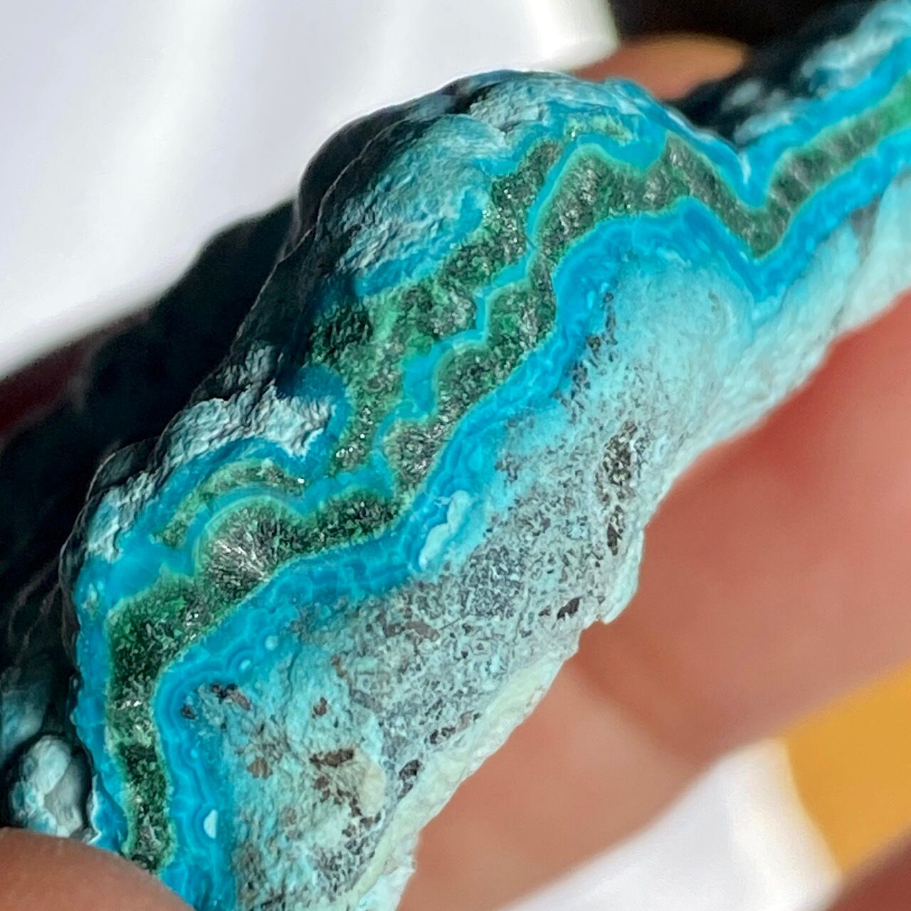 コンゴ産クリソコラ x マラカイトの原石(標本=スペシメン)になります。コンゴ産のクリソコラはクォリティーが高くかなり色が濃いものが産出されますが、度ぎつい色を敢えて避け、目に優しい、ライトブルーを中心として、アクセントに濃いめの色が入った子を選びました♡