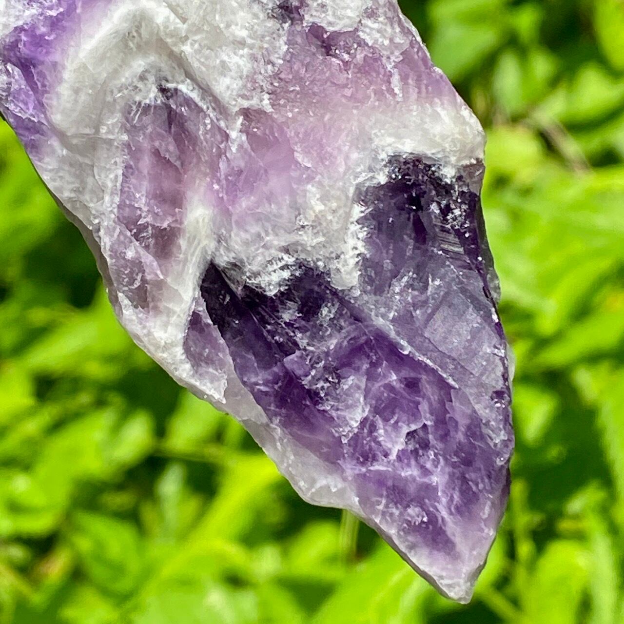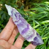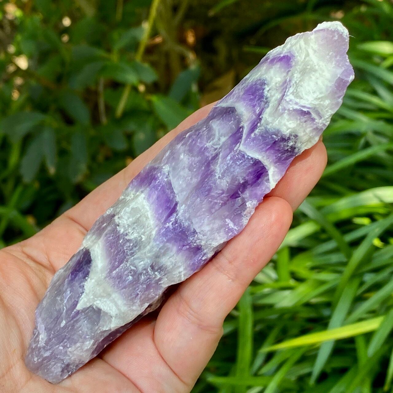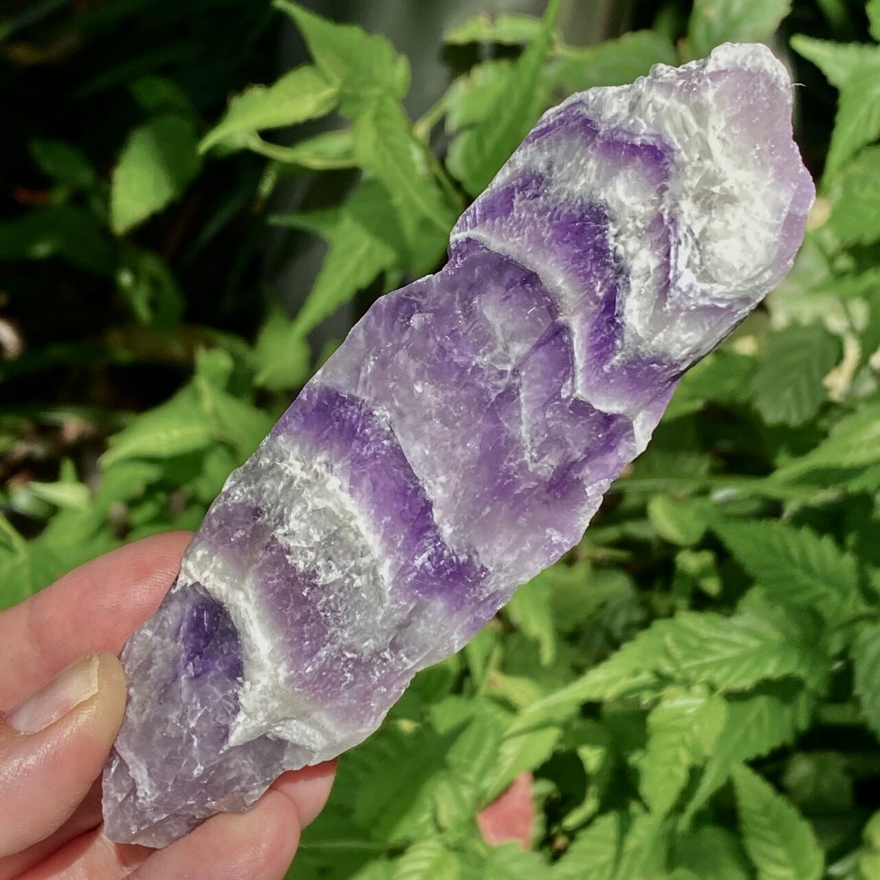 短剣のような形状と柄出しが美しい子です。アメジストの紫とホワイトクォーツの白のミルフィーユから成るシェブロン柄が魅力的です。細長い形状がワンド風で、掌に収めた時の格好の良さが際立ちます。石が持つ意識を感じていただければと思います。