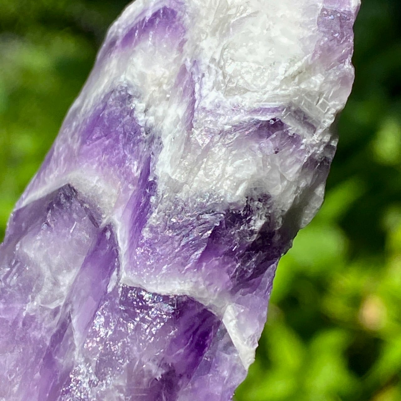 ドリームアメジストはアメジストの紫とミルキーなホワイトクォーツの白いバンディング(縞/帯状の模様)から成り、その特徴的な山型のモチーフがリピートされたシェブロン柄に似ているために、シェブロンアメジストとも言われています。