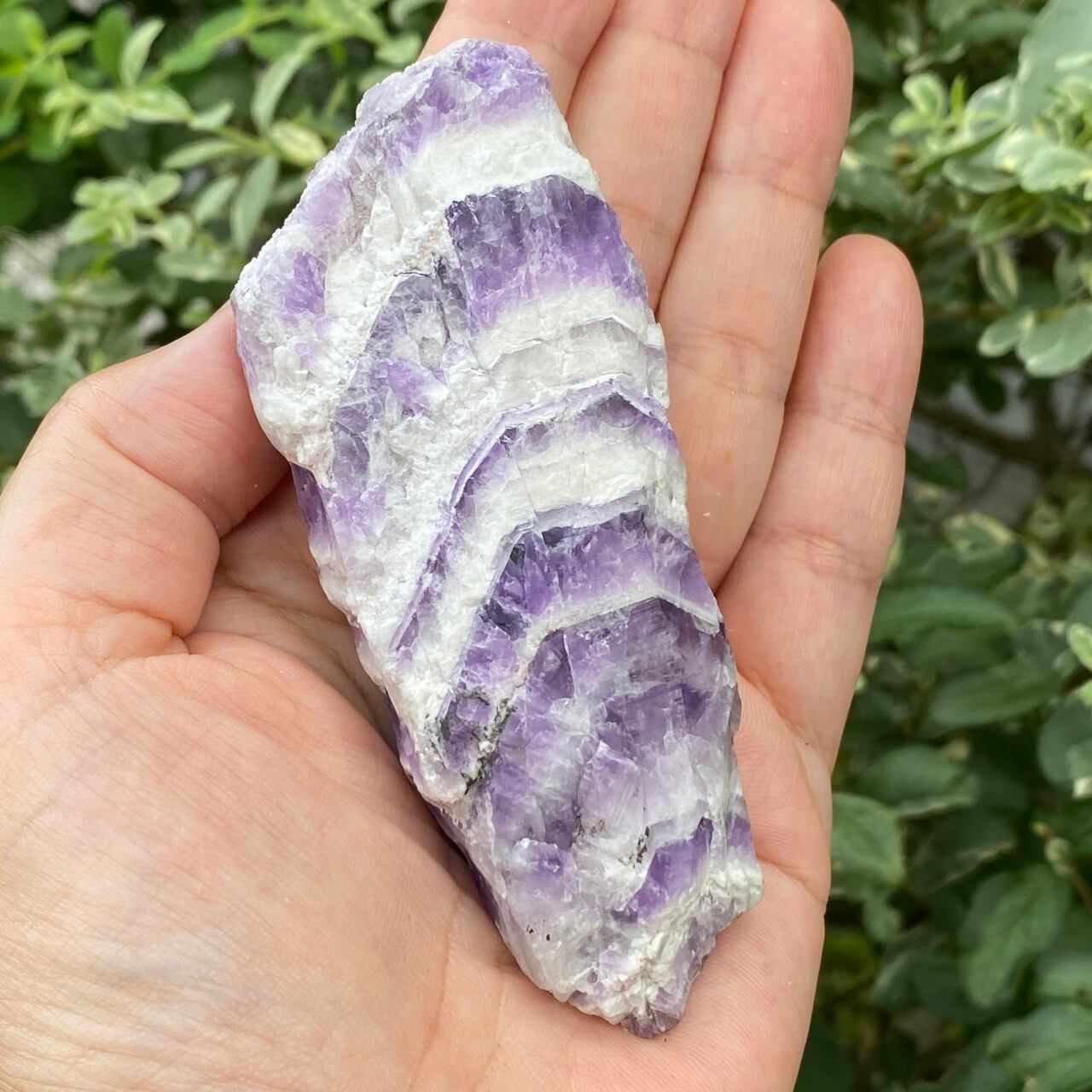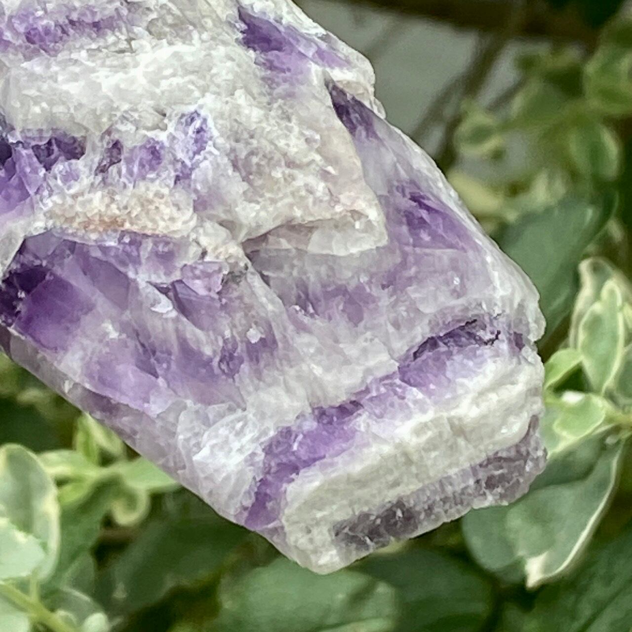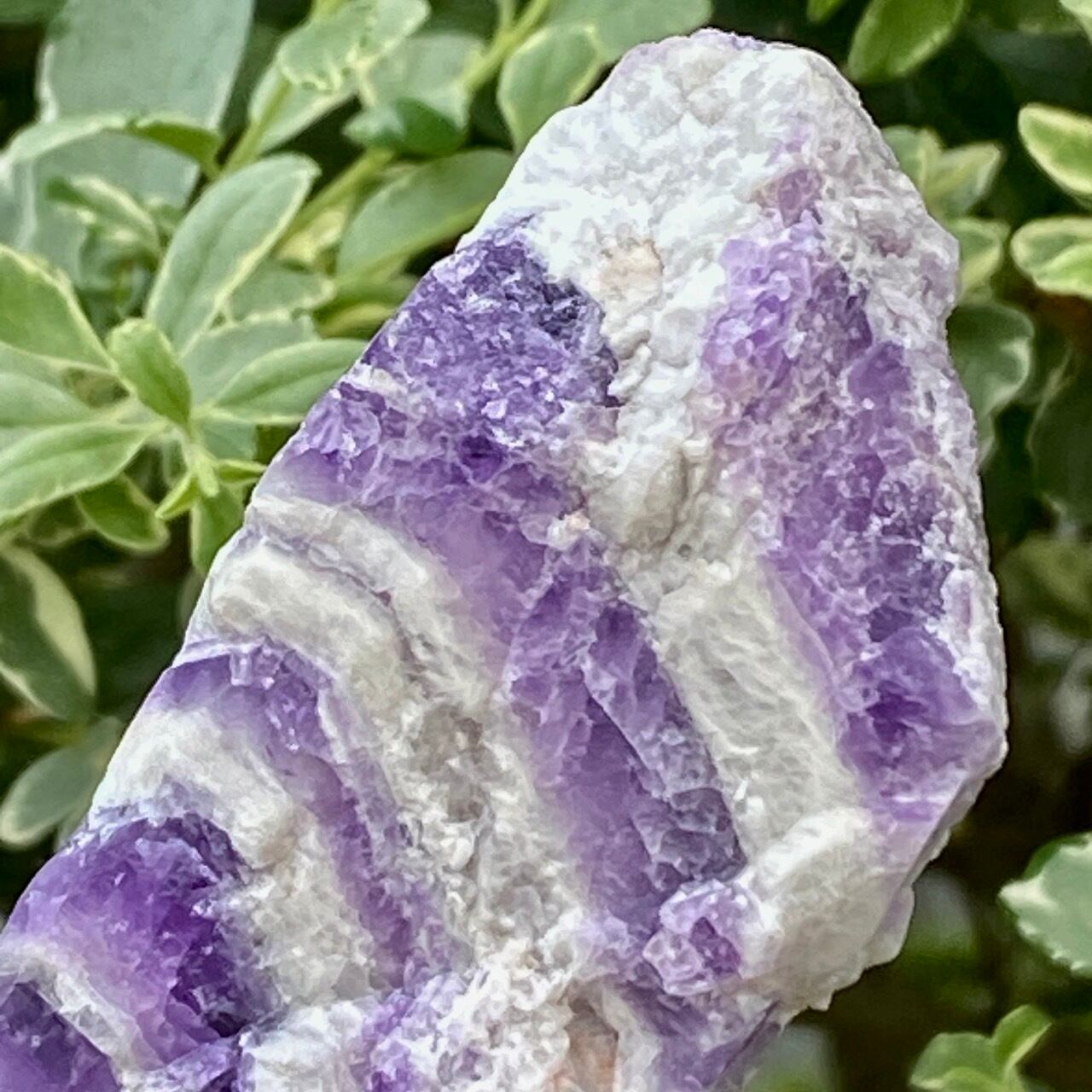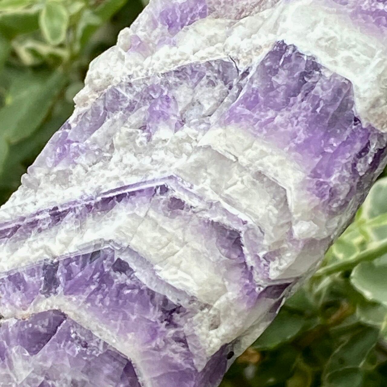 ドリームアメジストはアメジストの紫とミルキーなホワイトクォーツの白いバンディング(縞/帯状の模様)から成り、その特徴的な山型のモチーフがリピートされたシェブロン柄に似ているために、シェブロンアメジストとも言われています。