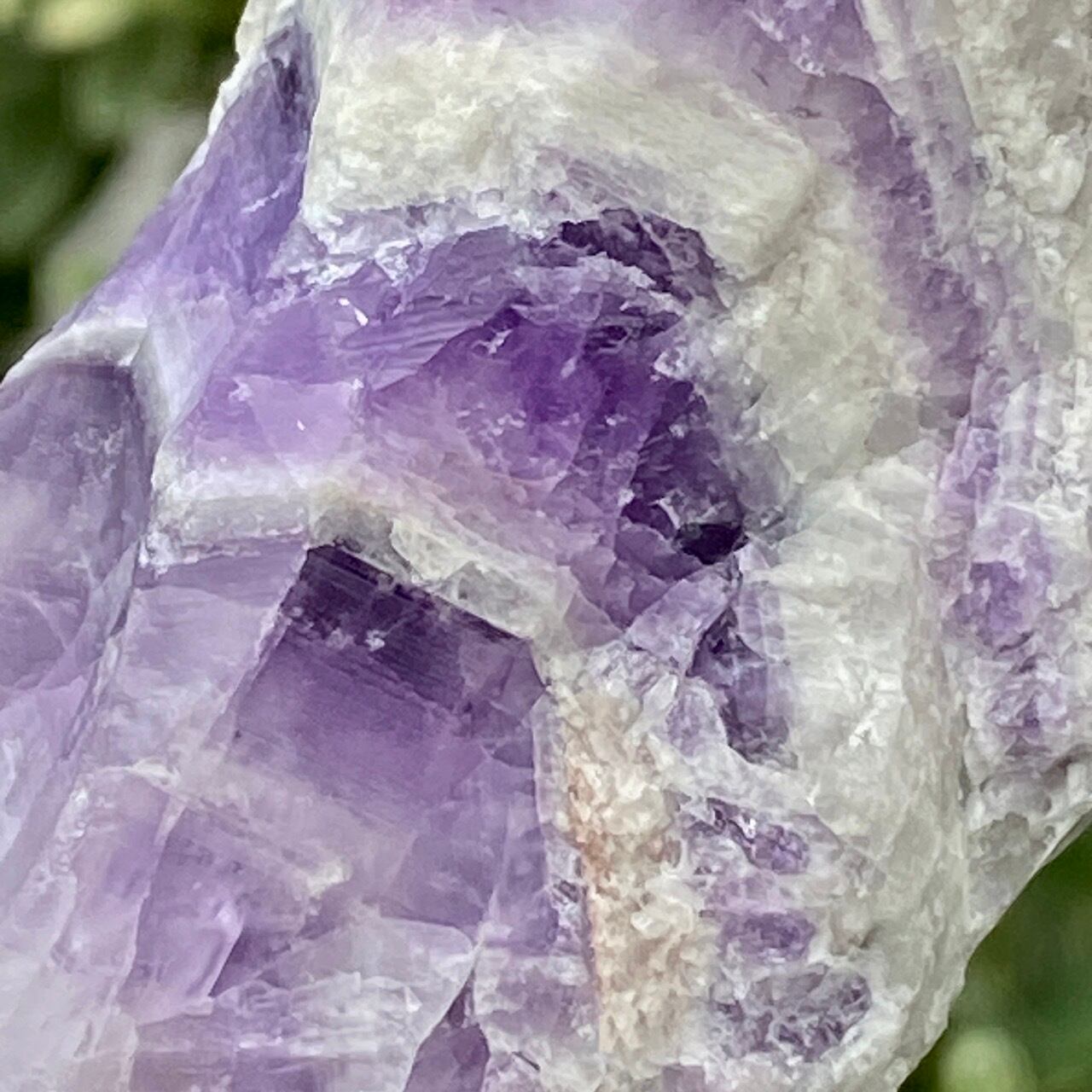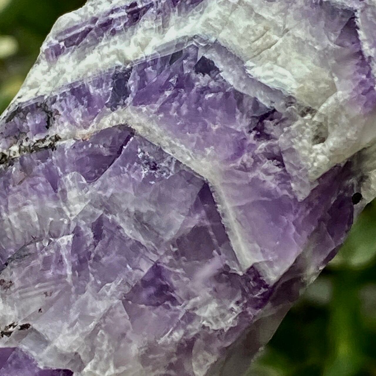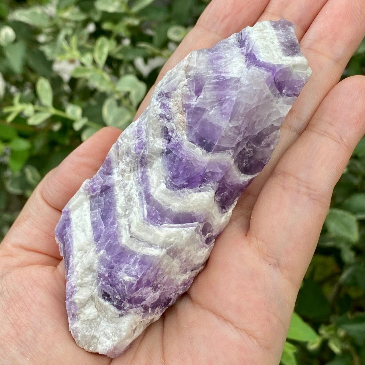 ドリームアメジストはアメジストの紫とミルキーなホワイトクォーツの白いバンディング(縞/帯状の模様)から成り、その特徴的な山型のモチーフがリピートされたシェブロン柄に似ているために、シェブロンアメジストとも言われています。