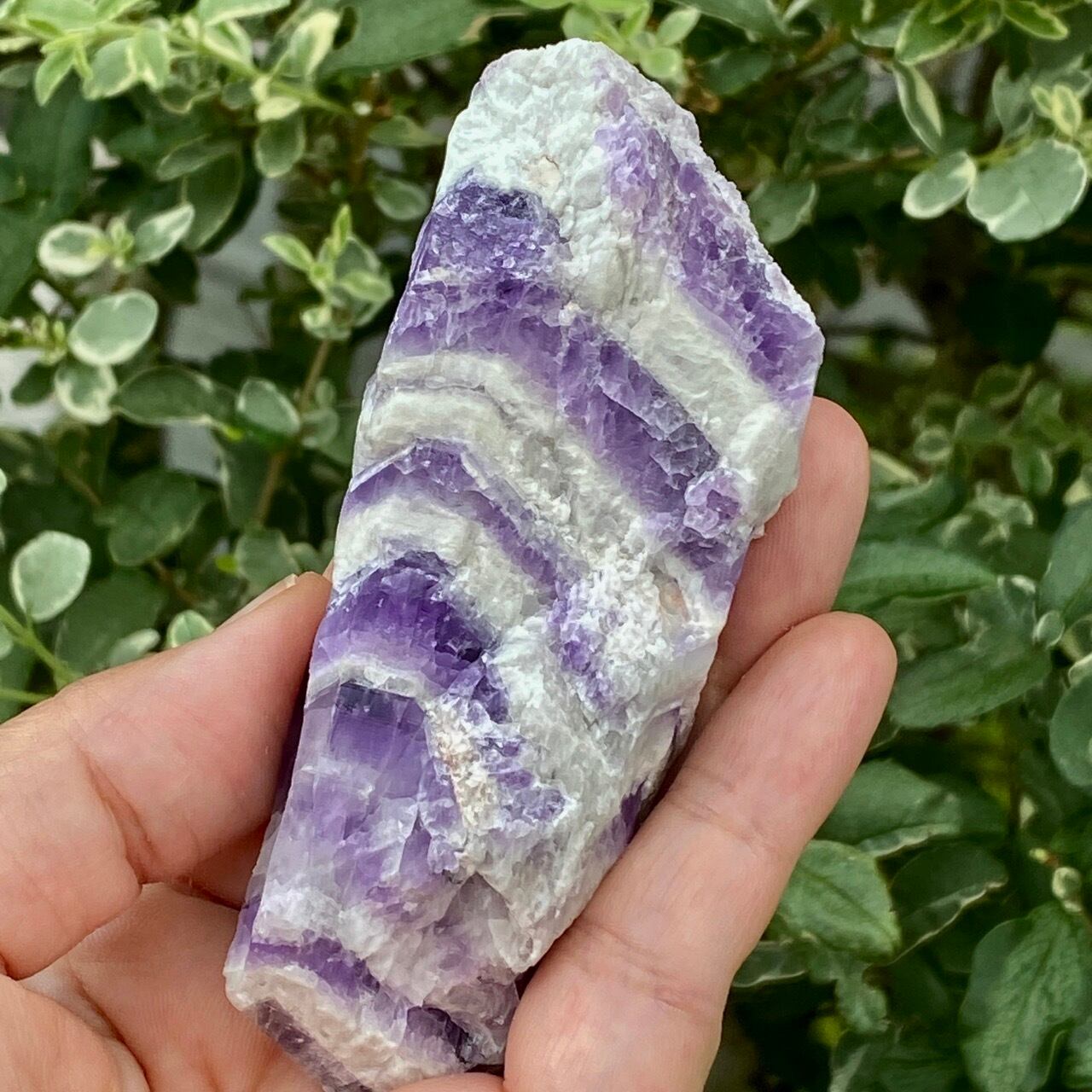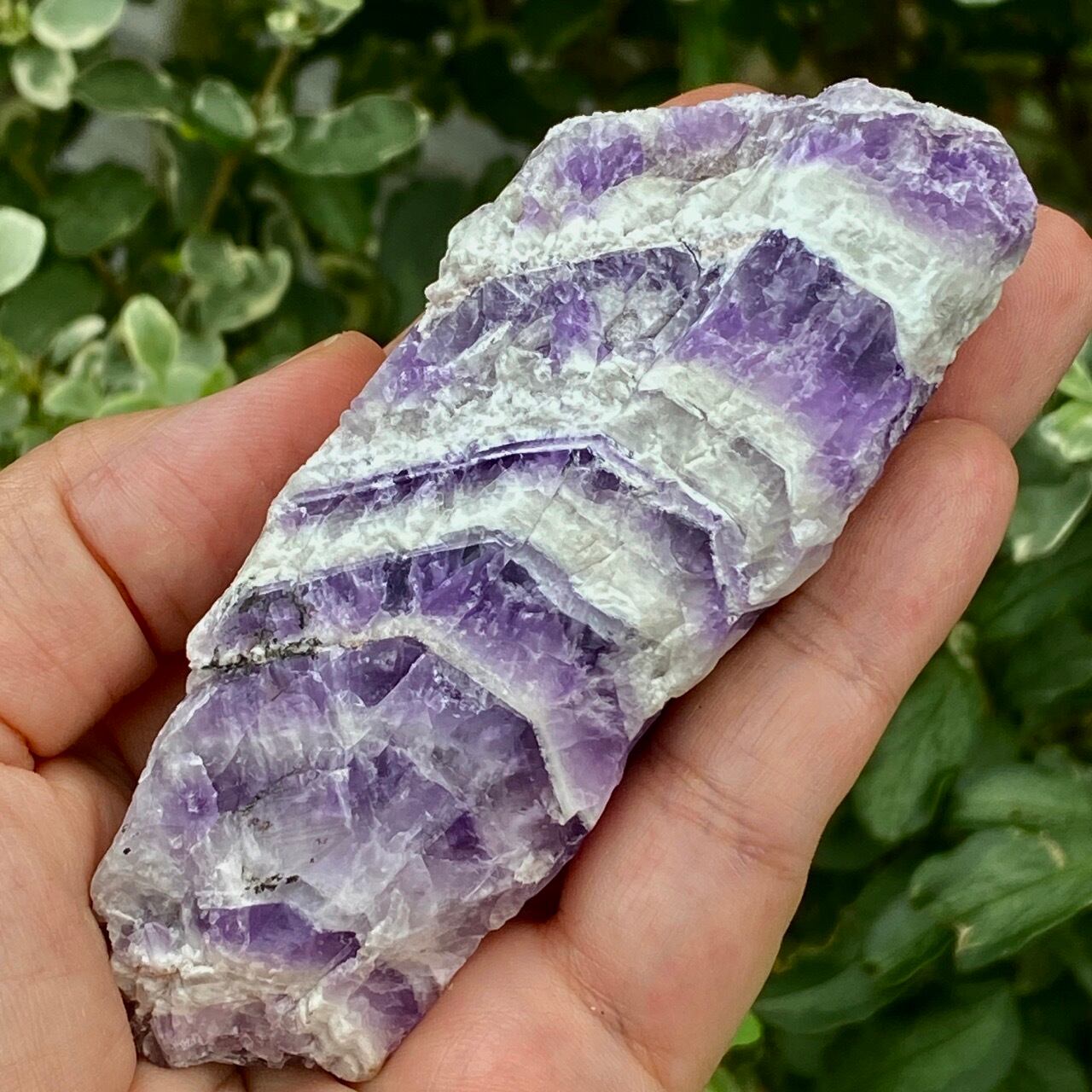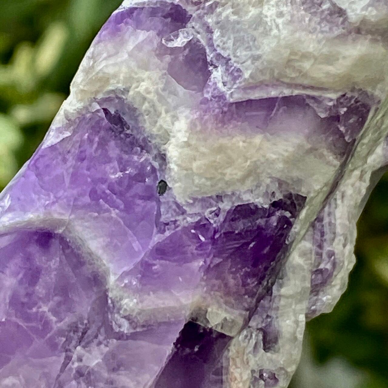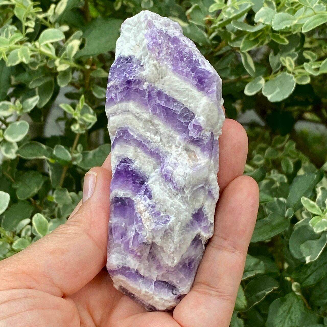 ドリームアメジストはアメジストの紫とミルキーなホワイトクォーツの白いバンディング(縞/帯状の模様)から成り、その特徴的な山型のモチーフがリピートされたシェブロン柄に似ているために、シェブロンアメジストとも言われています。