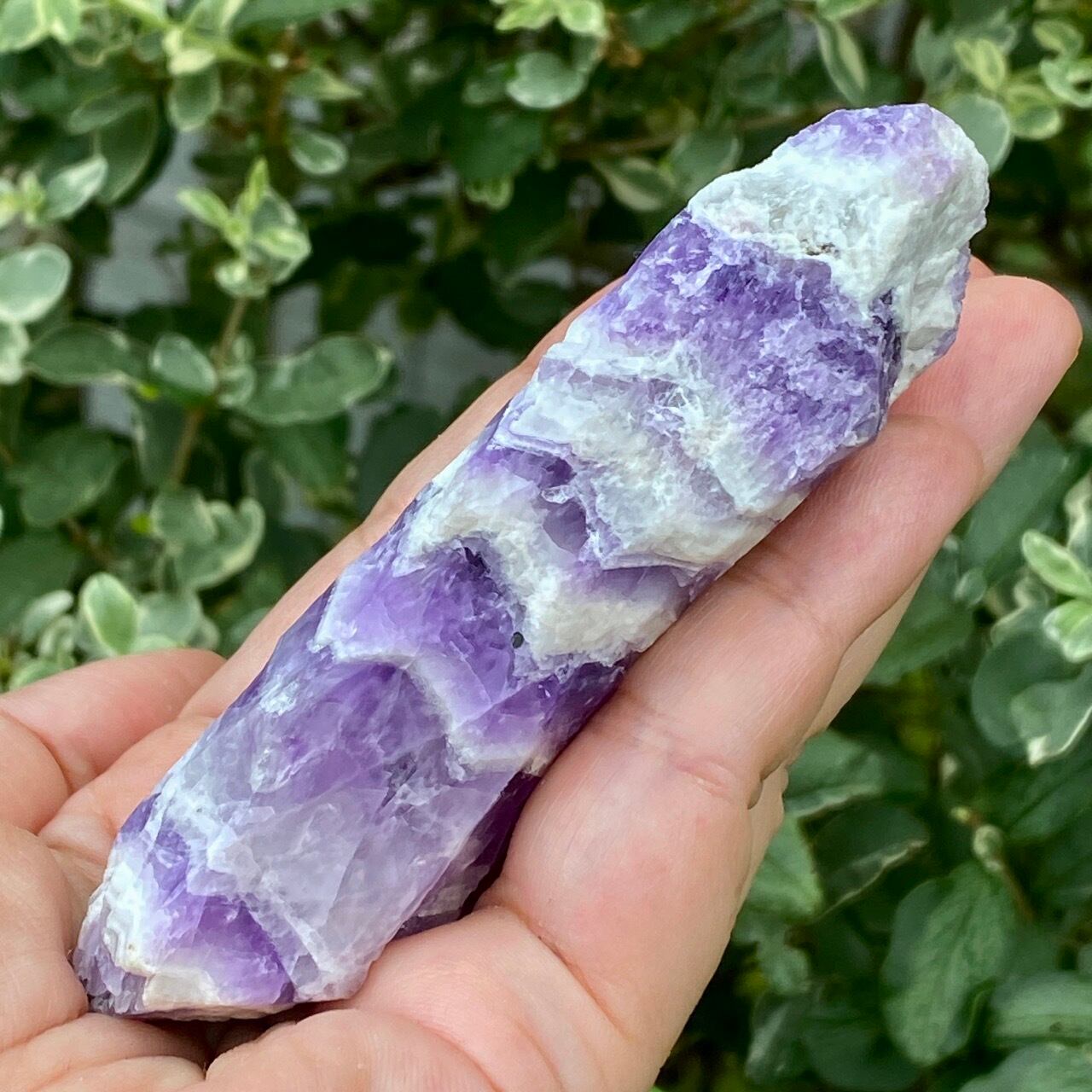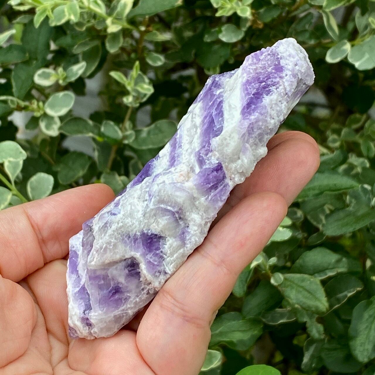 アメジストの紫とホワイトクォーツの白のミルフィーユが美しく、アメジスト部分が所々半透明になっています。じっくりと掌で握って石が持つ意識を感じていただければと思います。