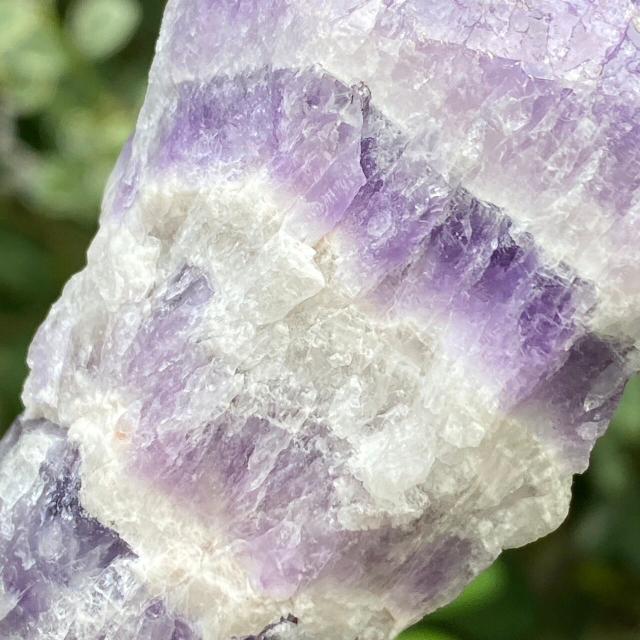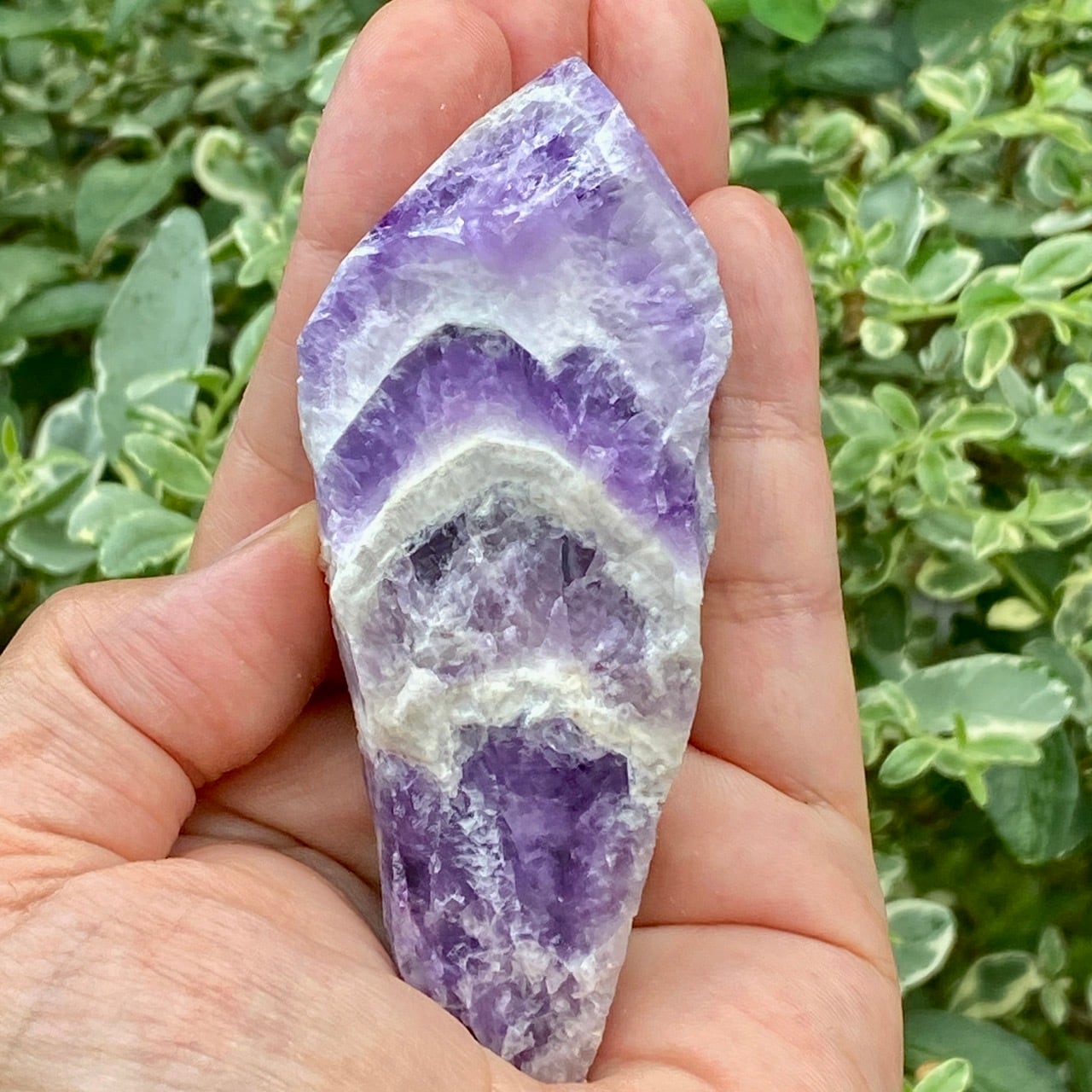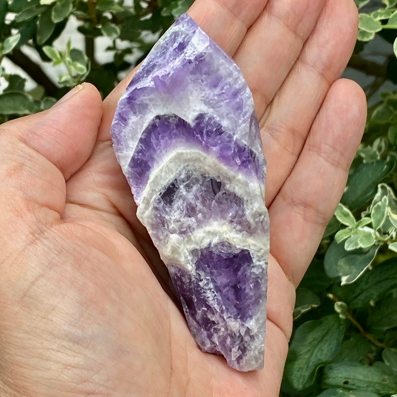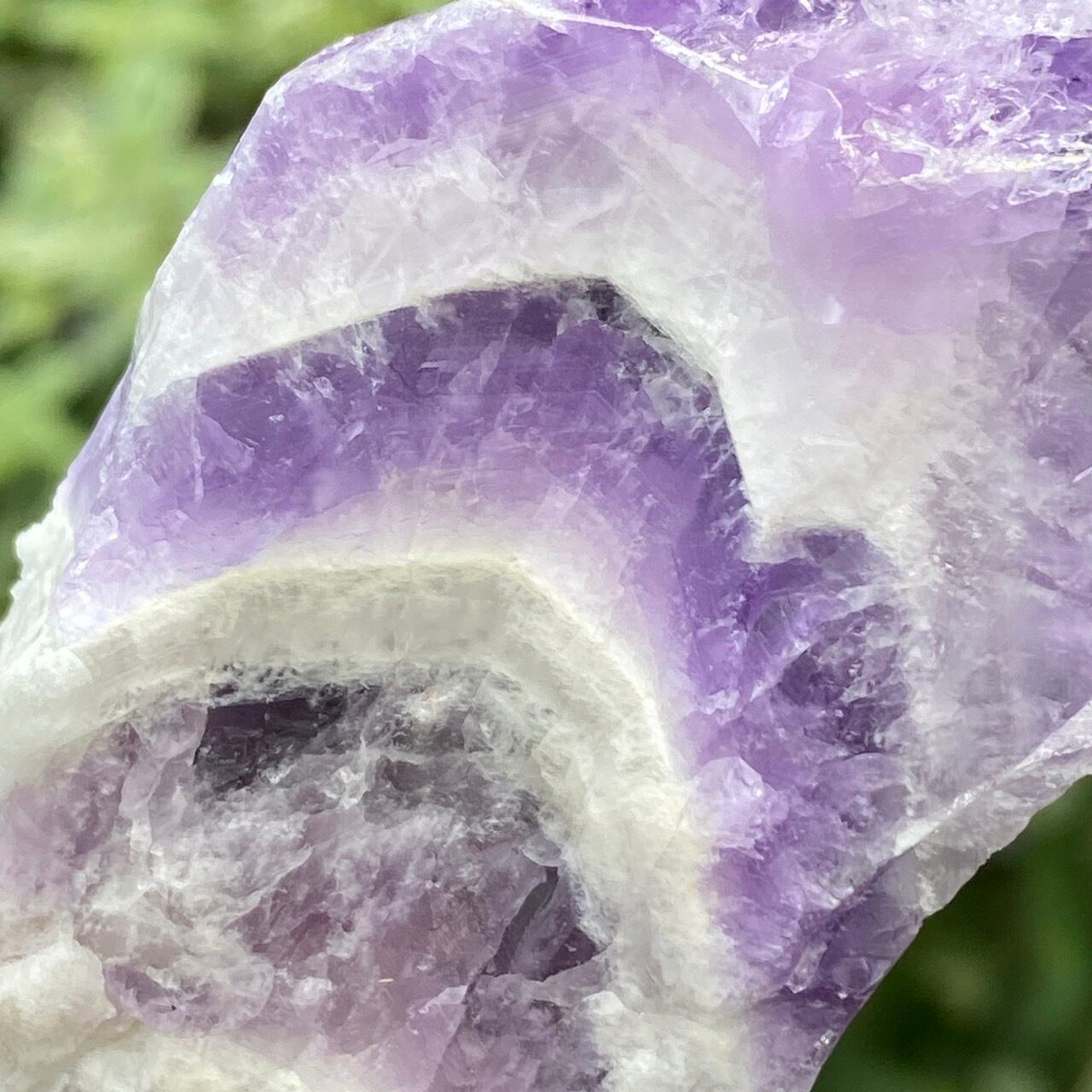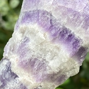 ドリームアメジストはアメジストの紫とミルキーなホワイトクォーツの白いバンディング(縞/帯状の模様)から成り、その特徴的な山型のモチーフがリピートされたシェブロン柄に似ているために、シェブロンアメジストとも言われています。
