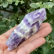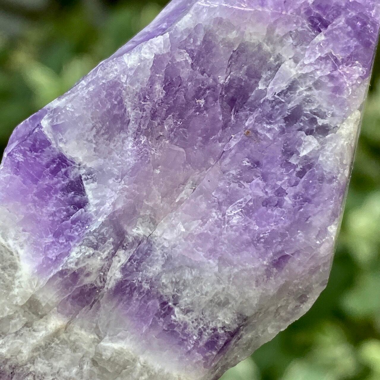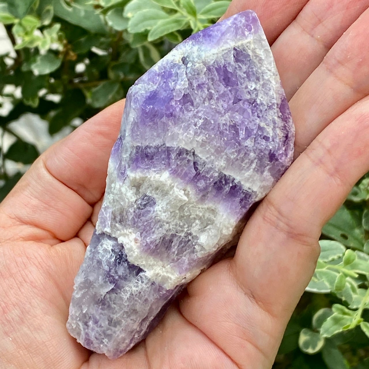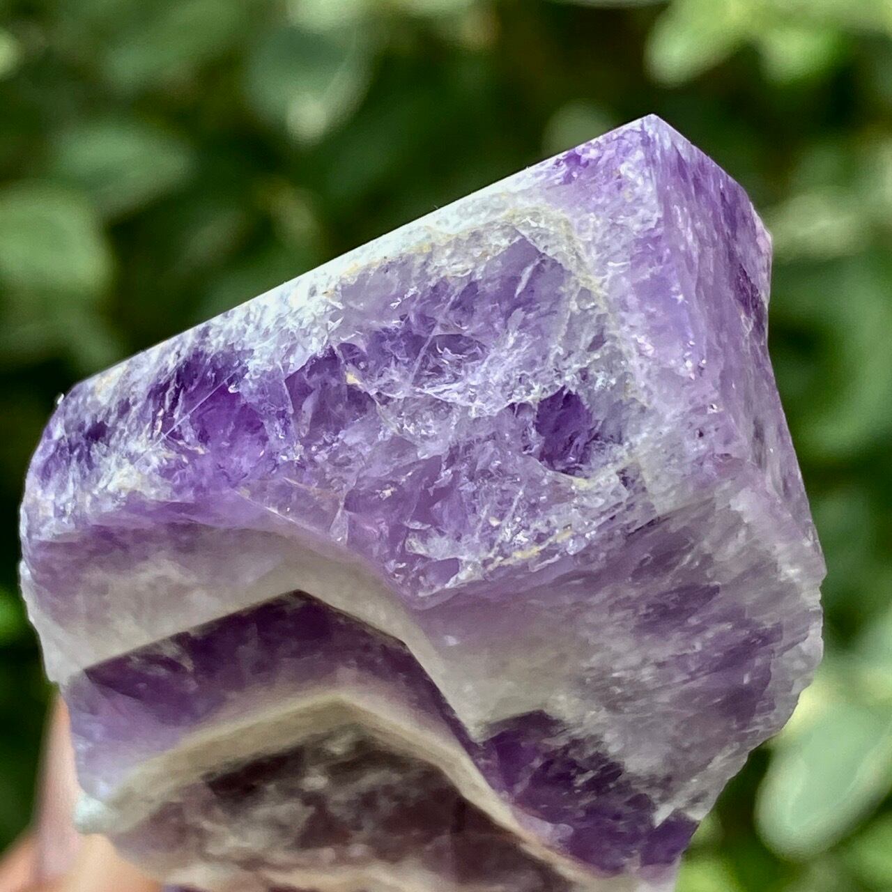 ドリームアメジストはアメジストの紫とミルキーなホワイトクォーツの白いバンディング(縞/帯状の模様)から成り、その特徴的な山型のモチーフがリピートされたシェブロン柄に似ているために、シェブロンアメジストとも言われています。