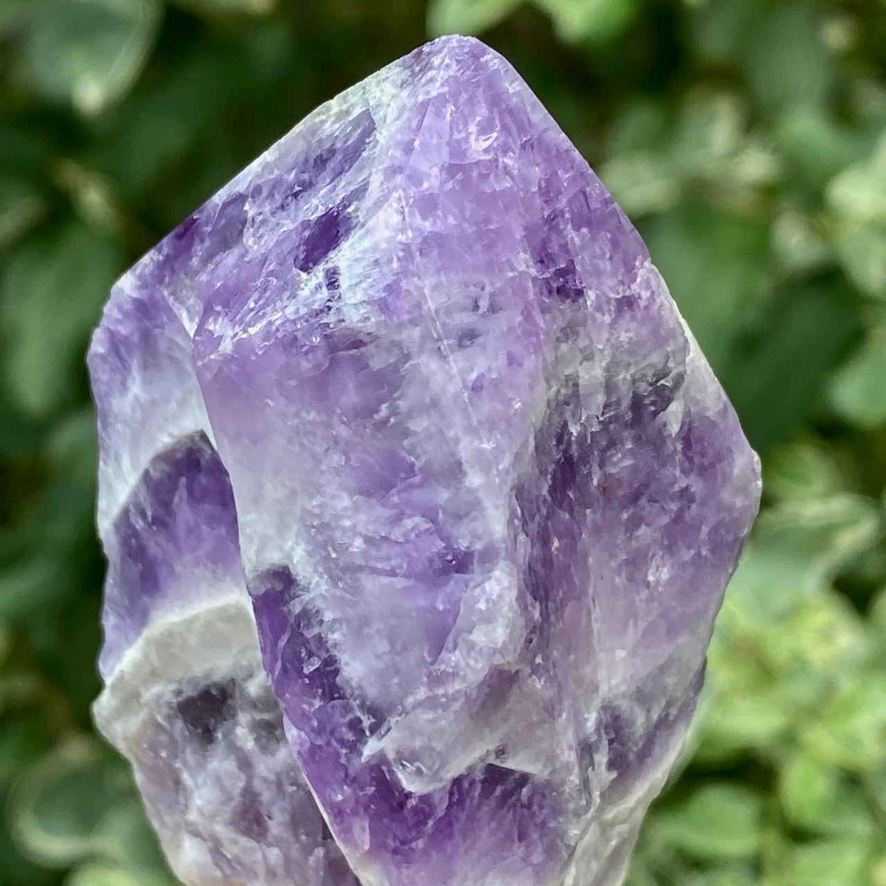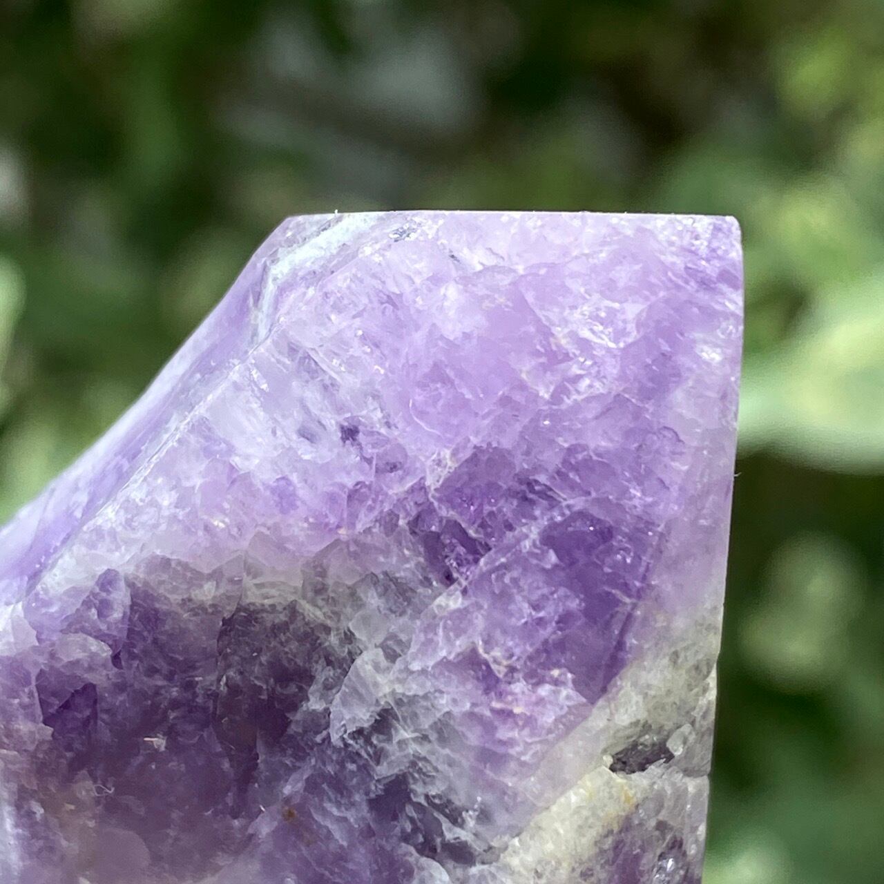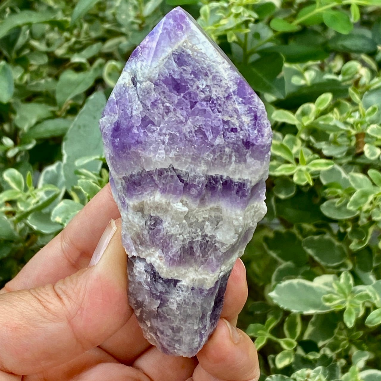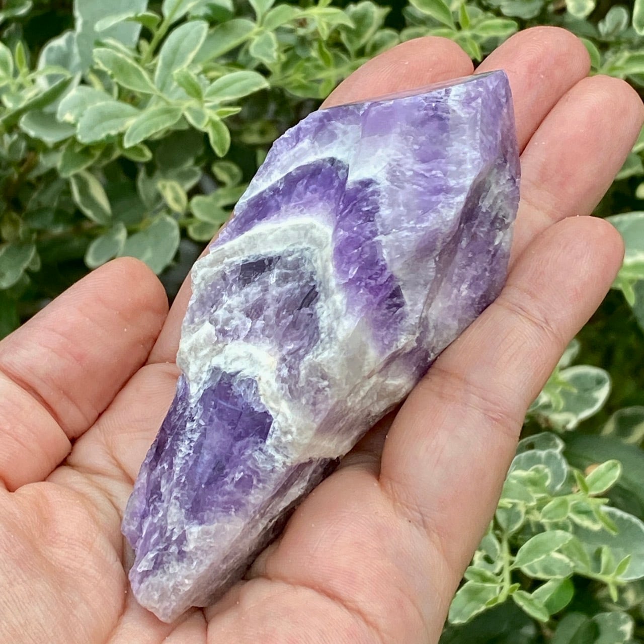 ドリームアメジストはアメジストの紫とミルキーなホワイトクォーツの白いバンディング(縞/帯状の模様)から成り、その特徴的な山型のモチーフがリピートされたシェブロン柄に似ているために、シェブロンアメジストとも言われています。